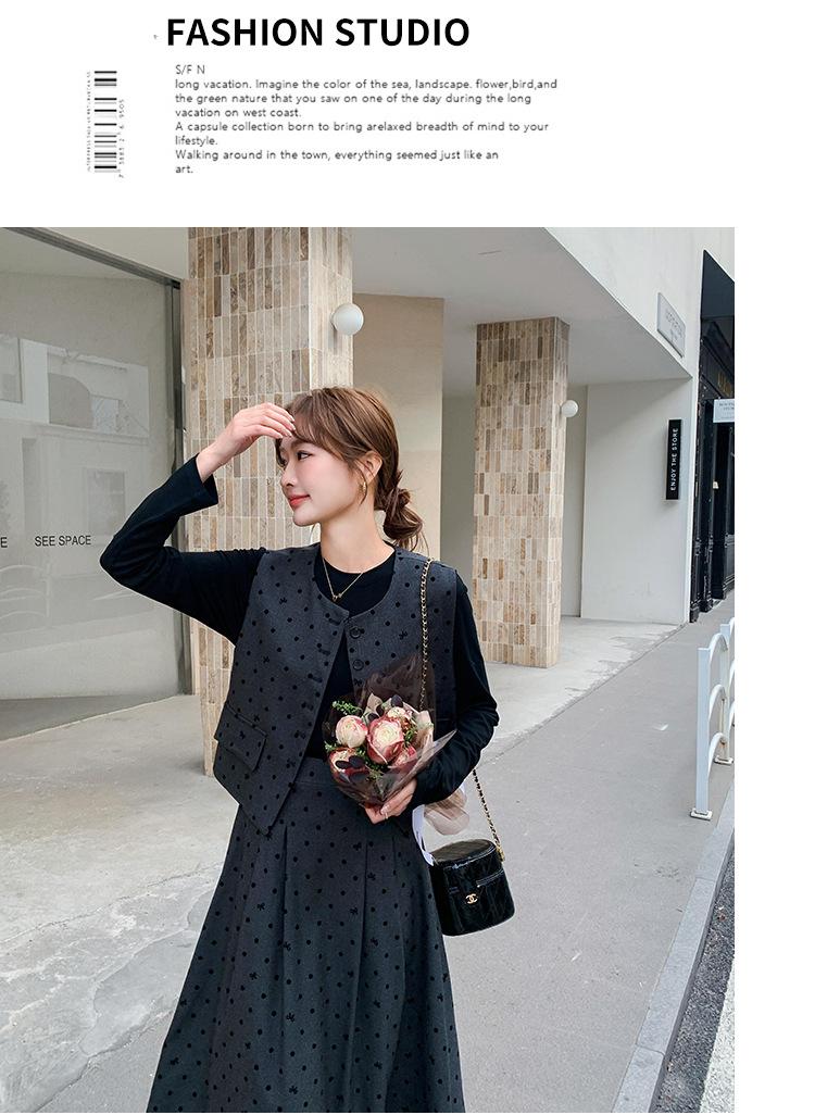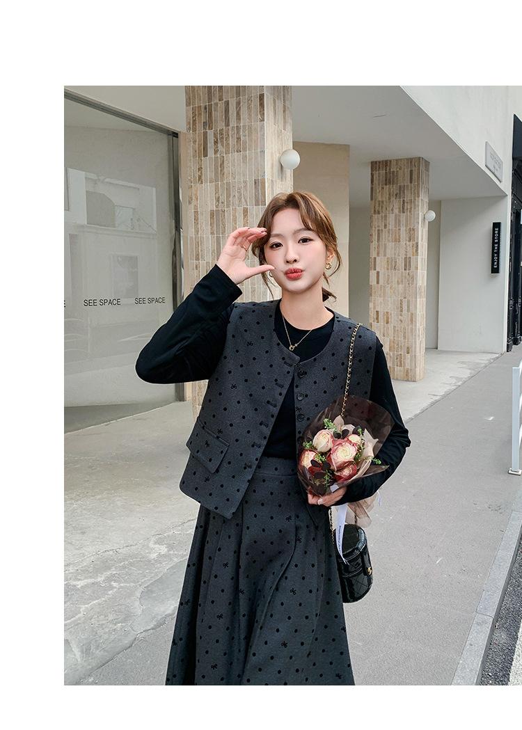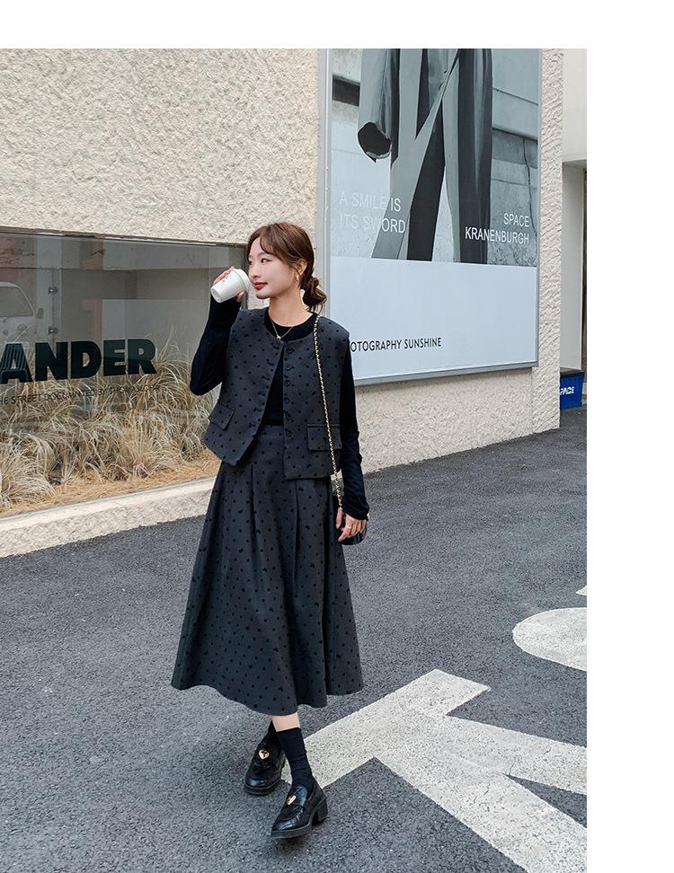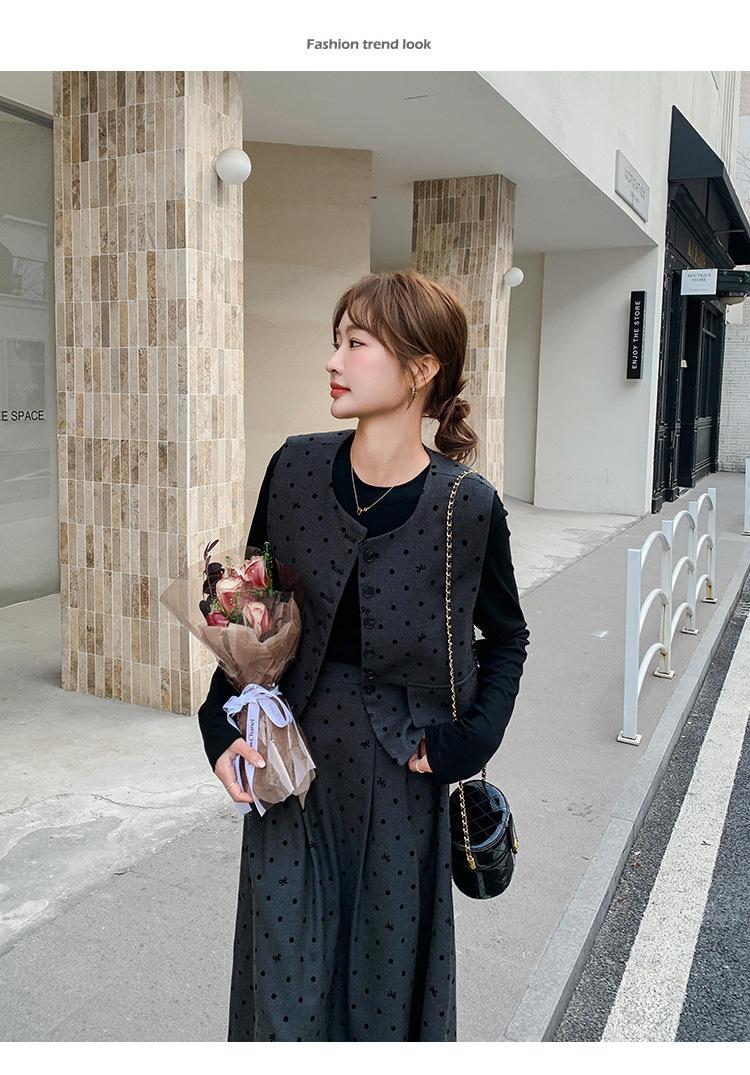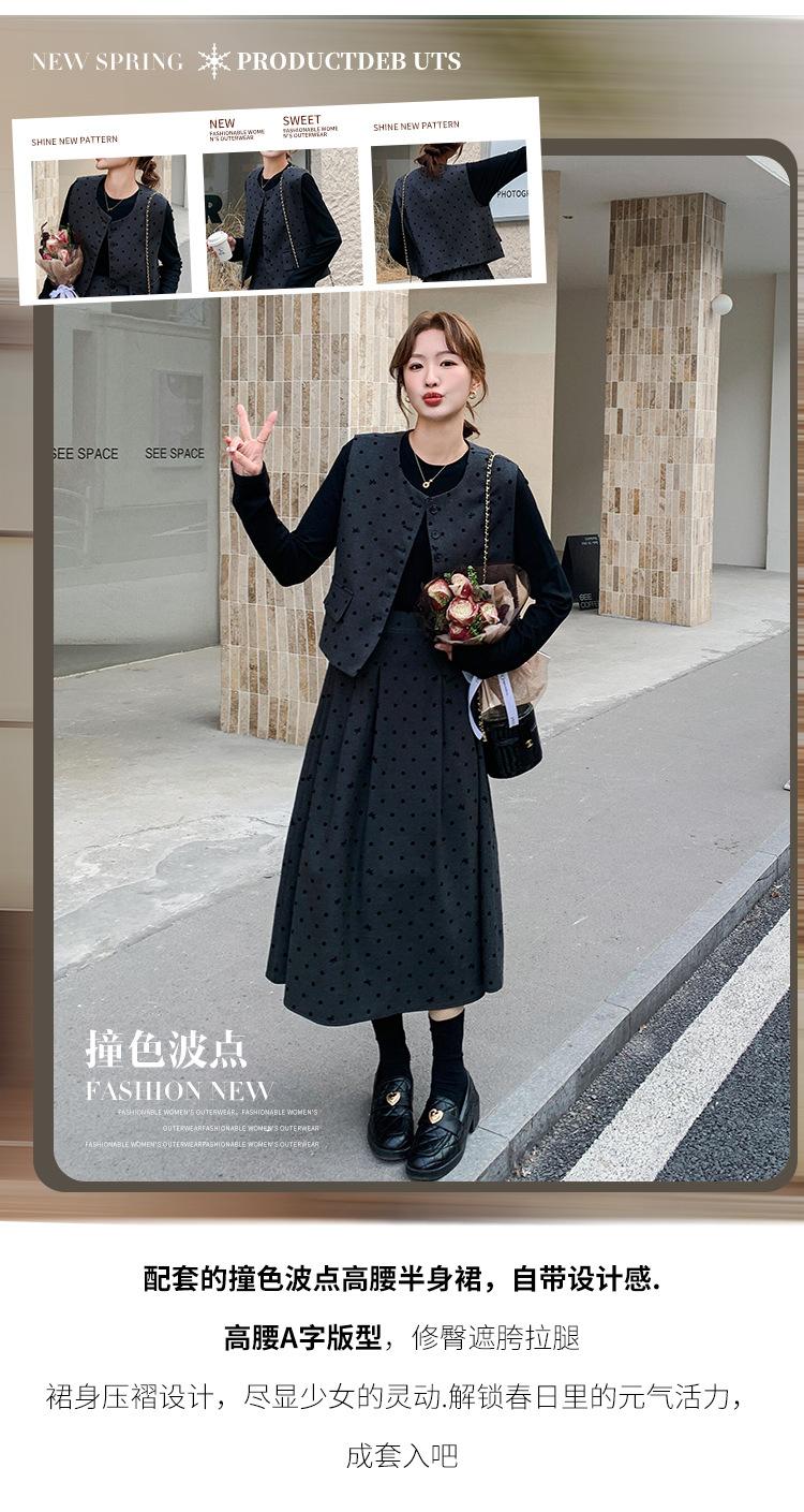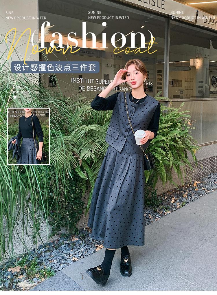 Traje de mujer otoño y primavera 2025 reductor de edad versátil chaleco + falda midi + camisa básica conjunto de tres piezas moderno