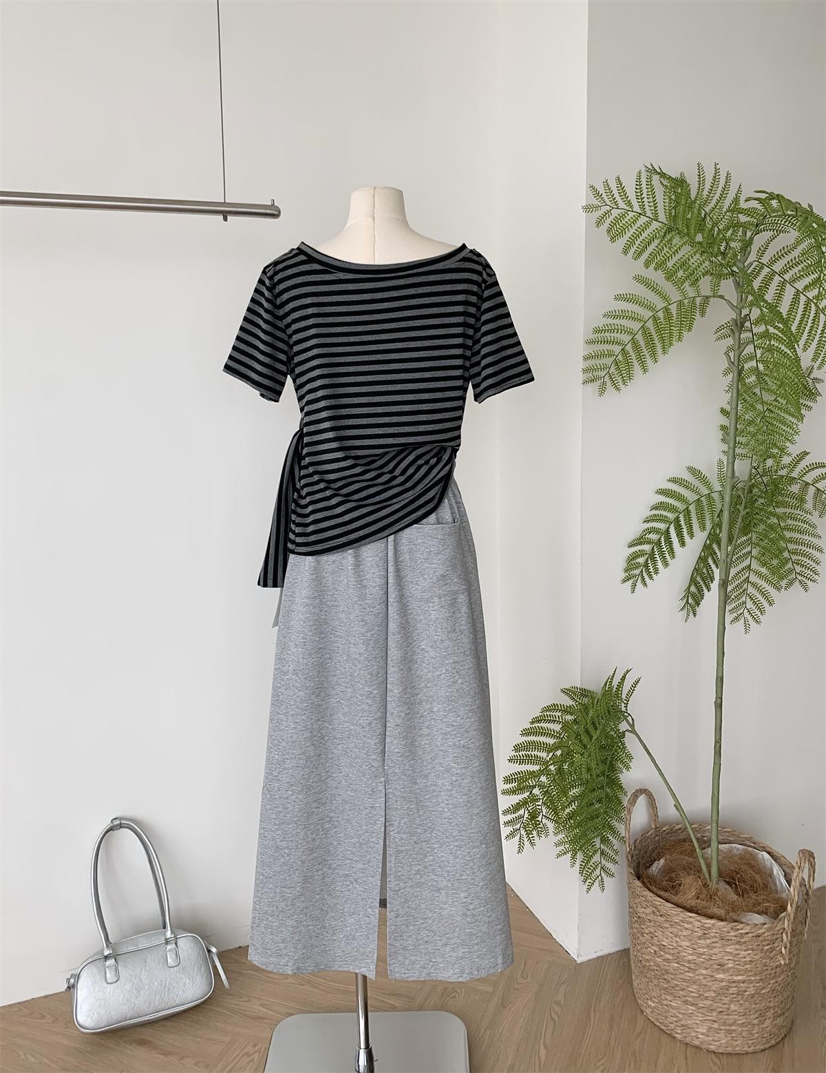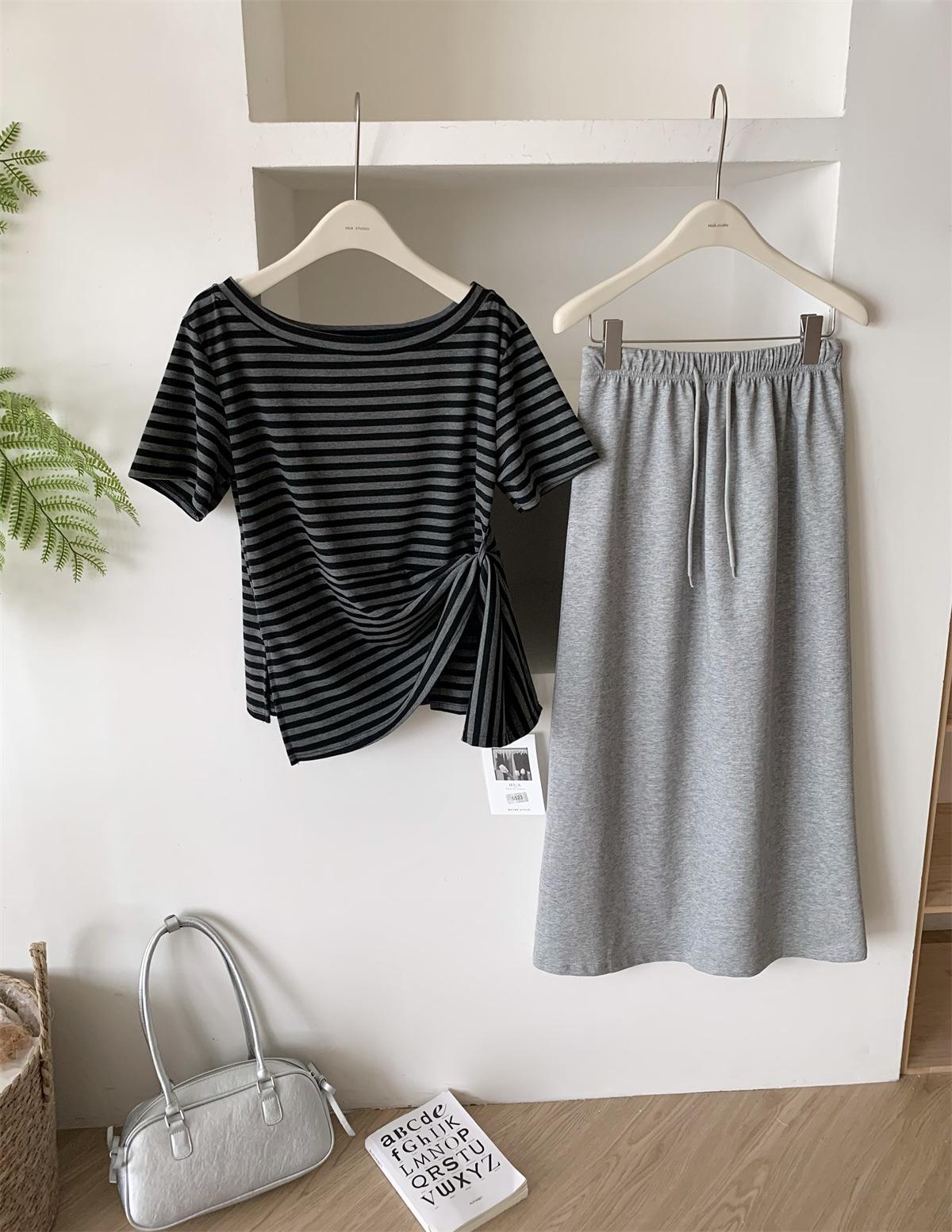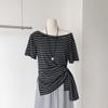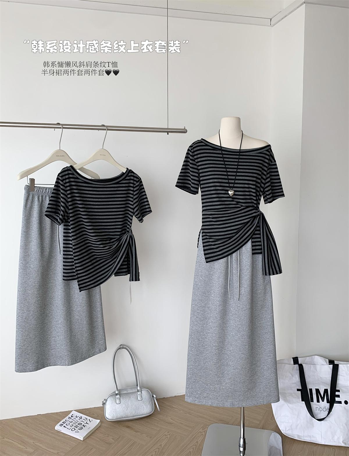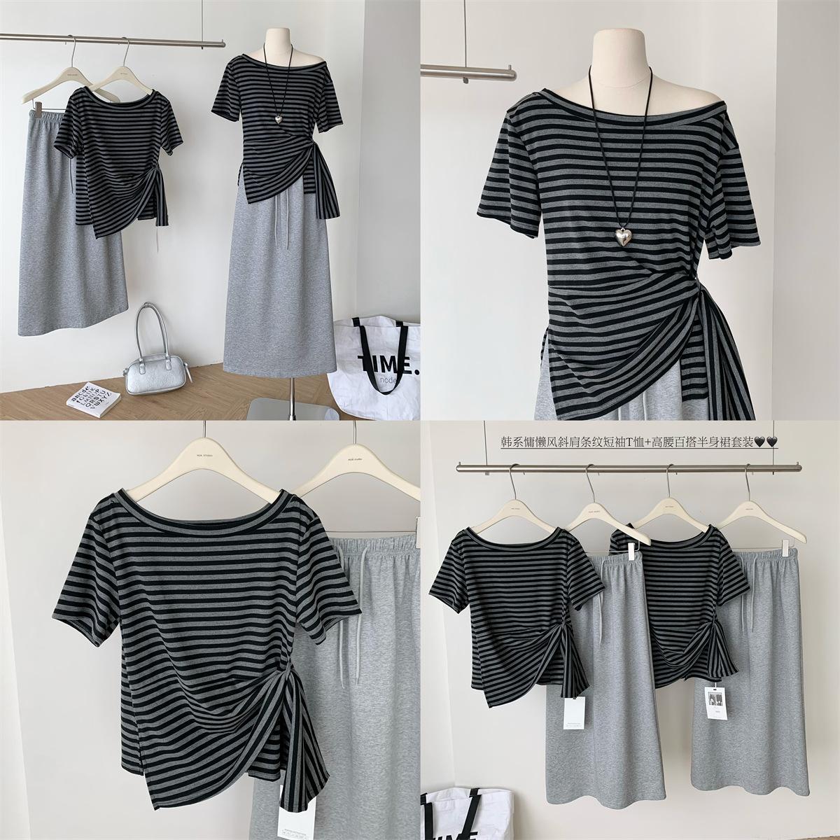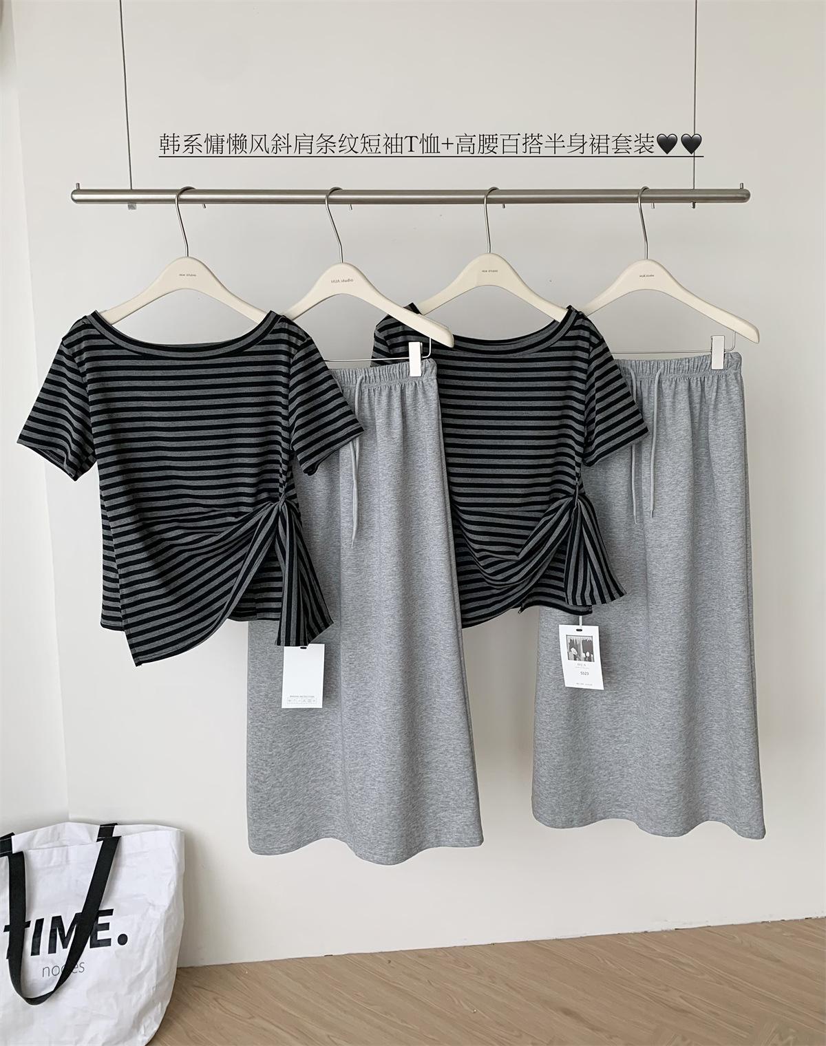 Verano Nuevo Estilo Estilo Perezoso Look Adelgazante Holgado Elegante Camiseta de Manga Corta con Rayas de Hombro Inclinado + Traje de Falda Versátil de Cintura Alta