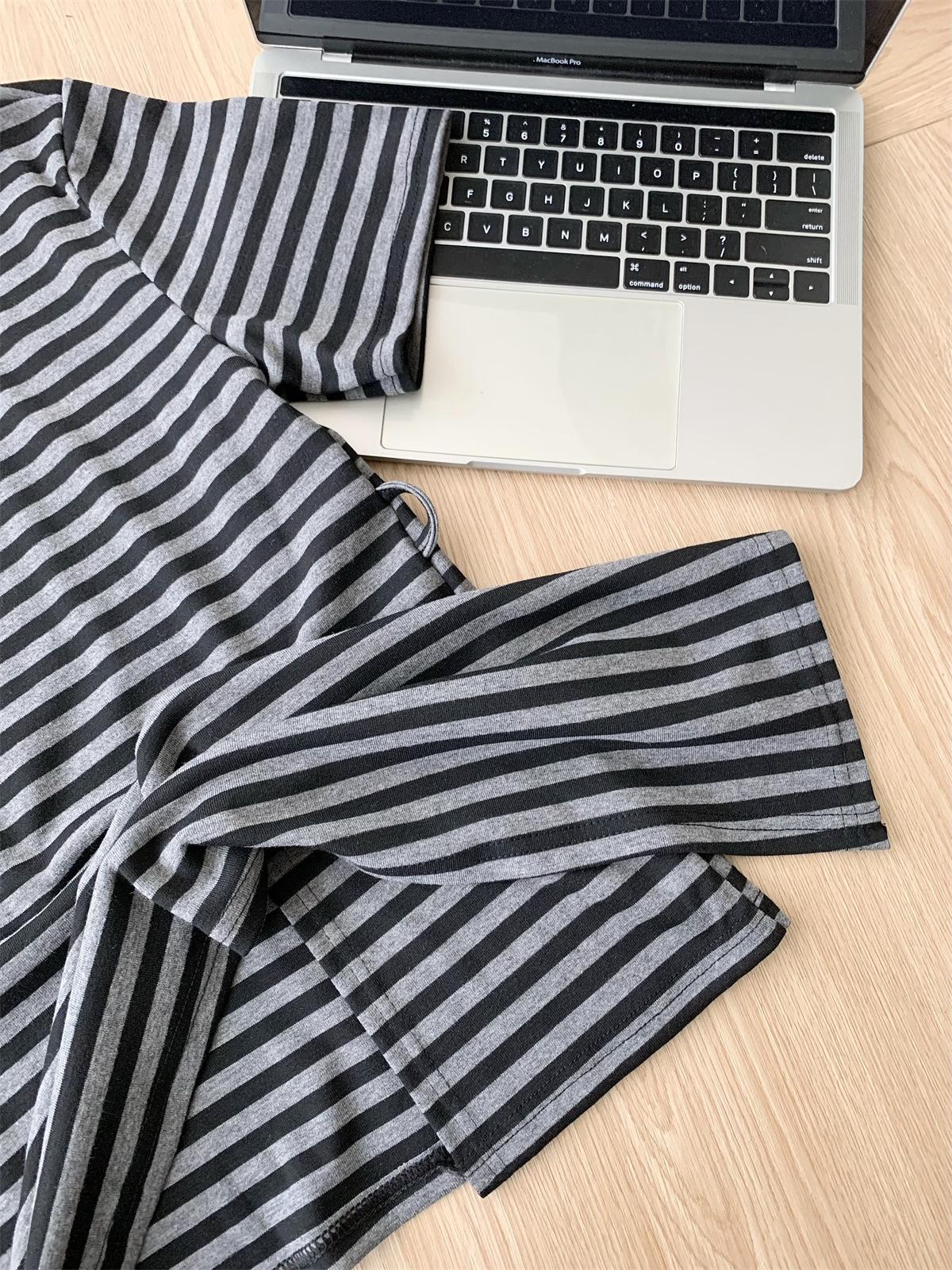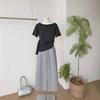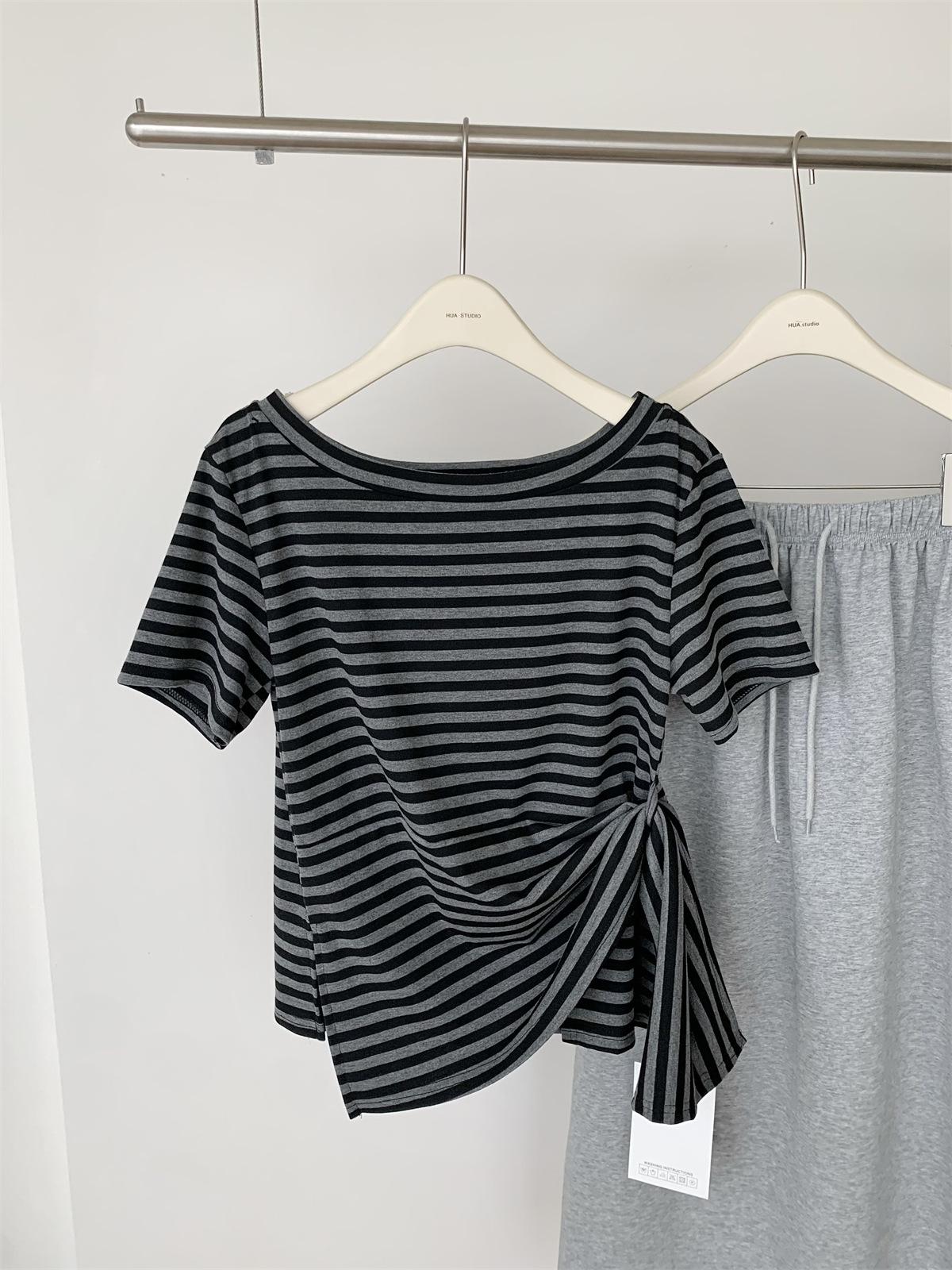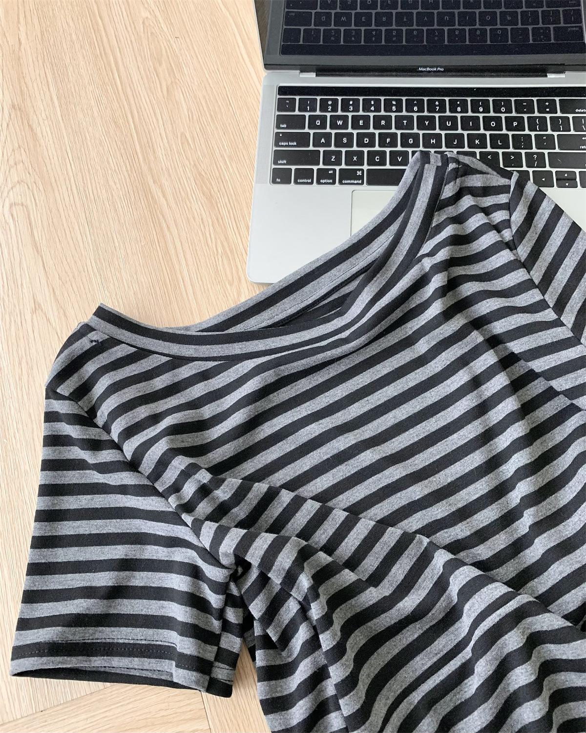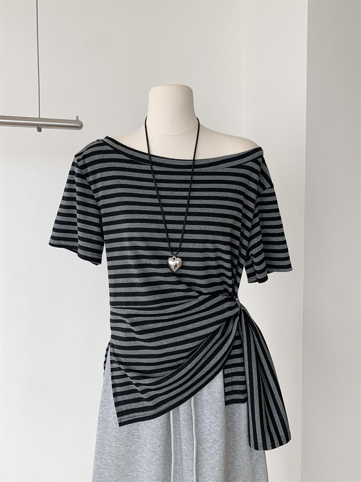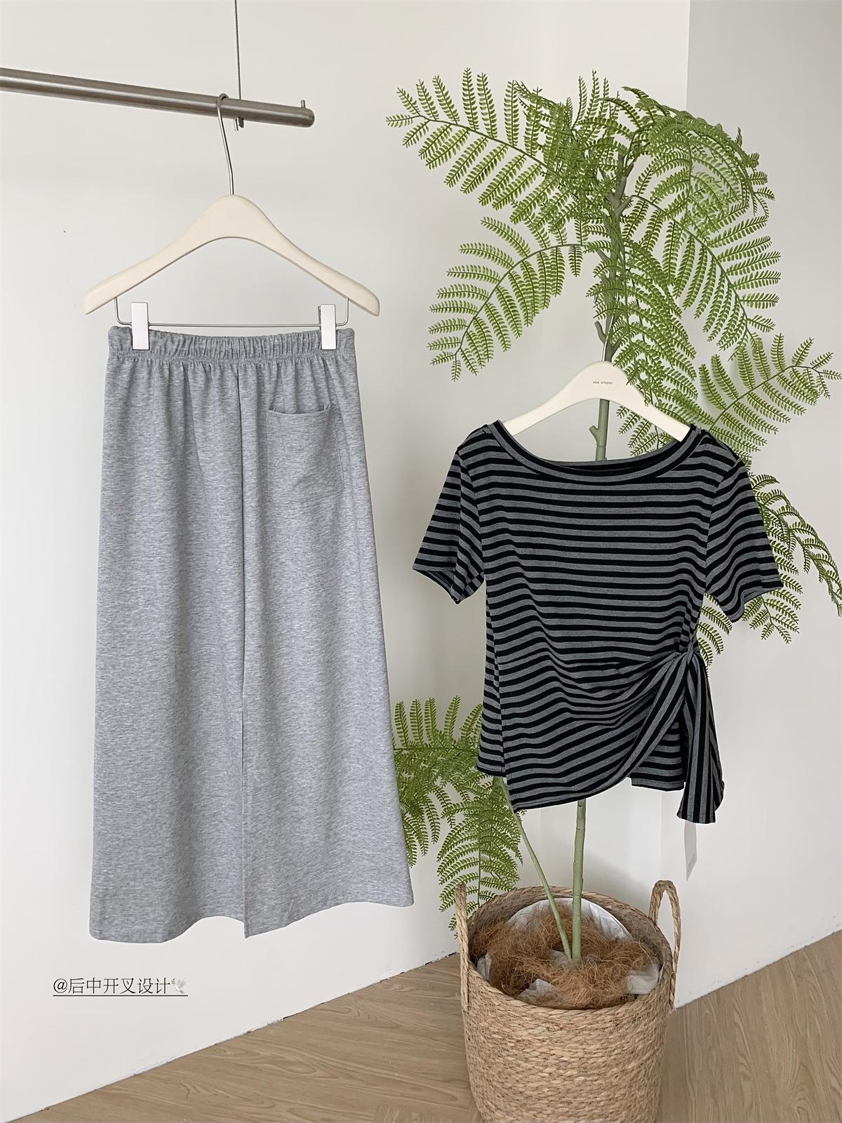 Verano Nuevo Estilo Estilo Perezoso Look Adelgazante Holgado Elegante Camiseta de Manga Corta con Rayas de Hombro Inclinado + Traje de Falda Versátil de Cintura Alta