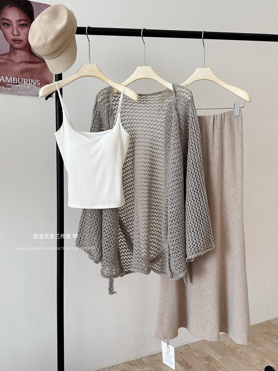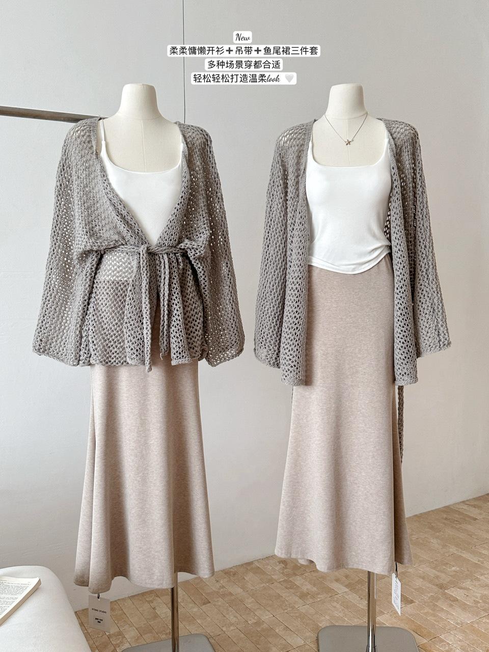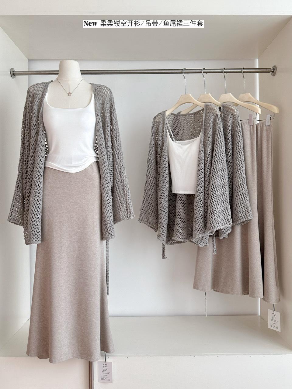 ¡Nuevo Otoño! Cárdigan de Punto Calado Suave + Camisola + Falda Cola de Pescado Set de Tres Piezas