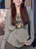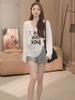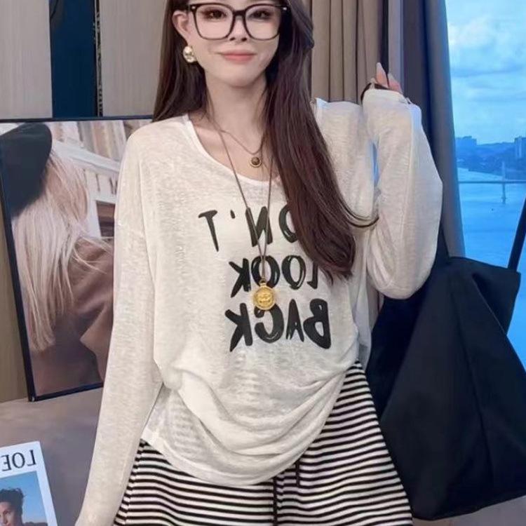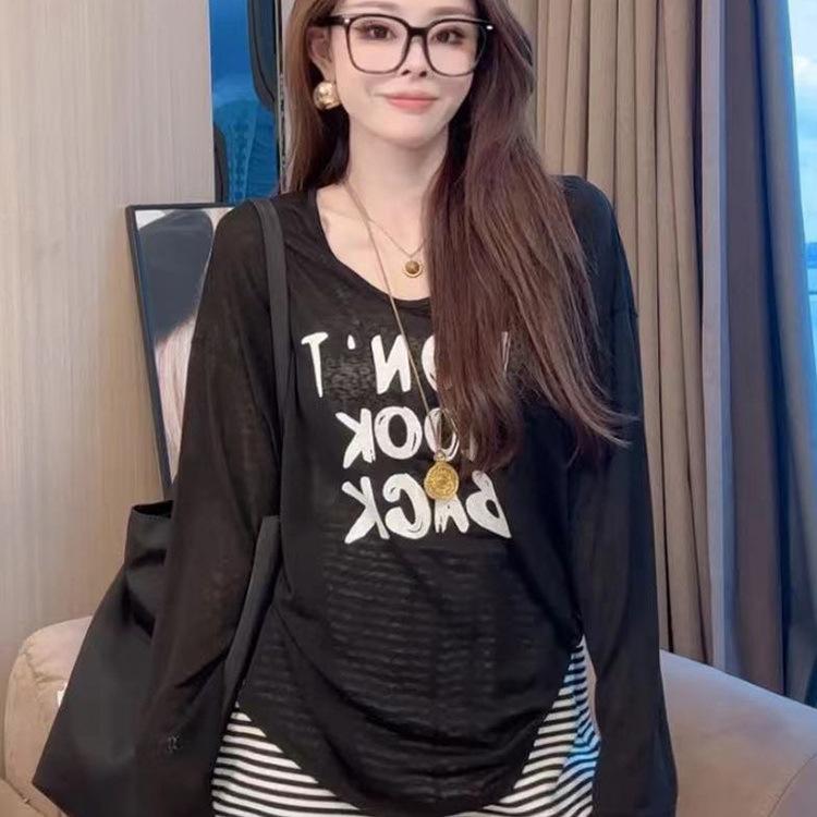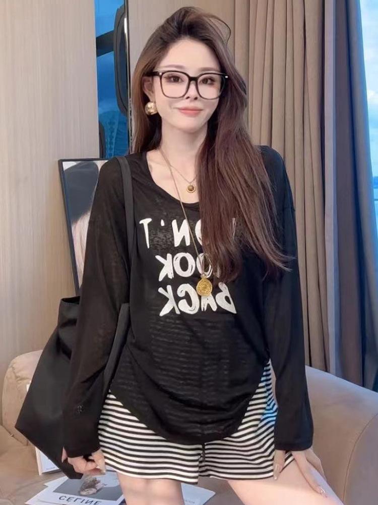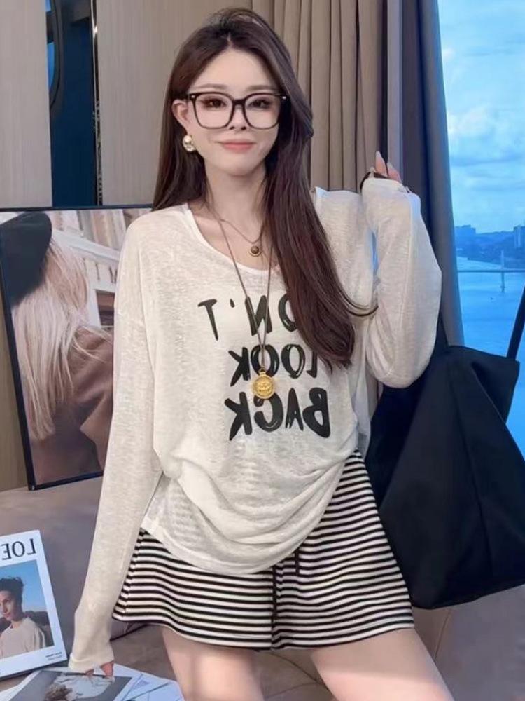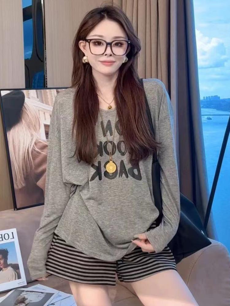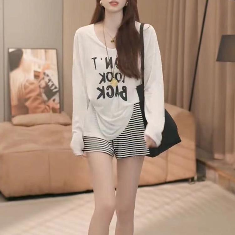 Camiseta de manga larga con letras de diseño coreano + conjunto de shorts a rayas para mujer 2025 verano nuevo holgado adelgazante conjunto de dos piezas