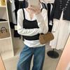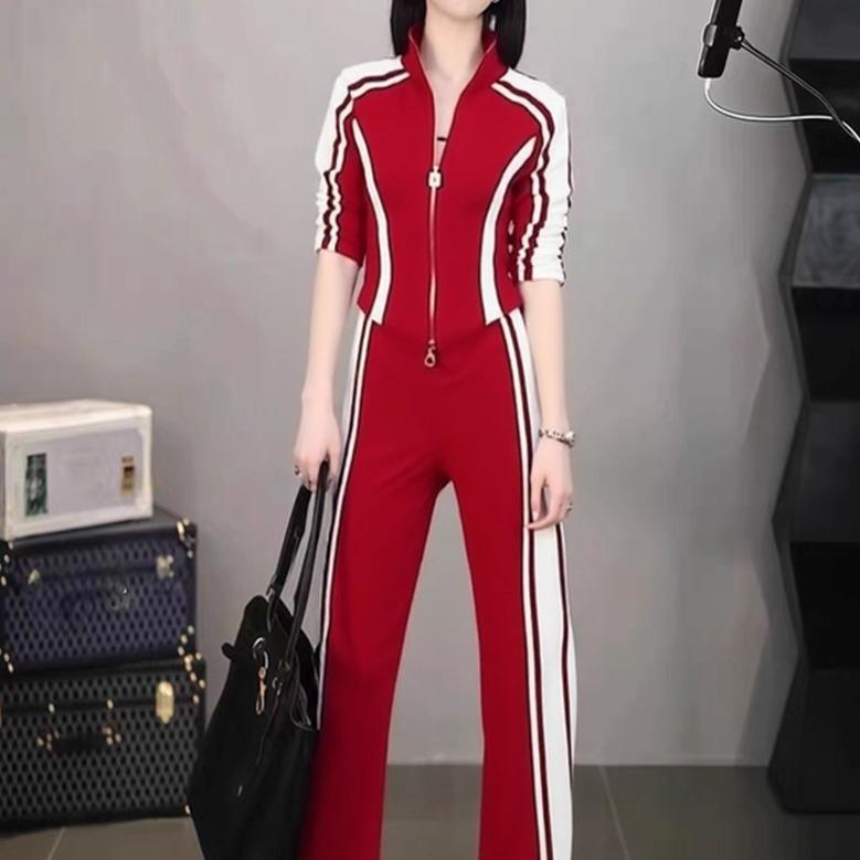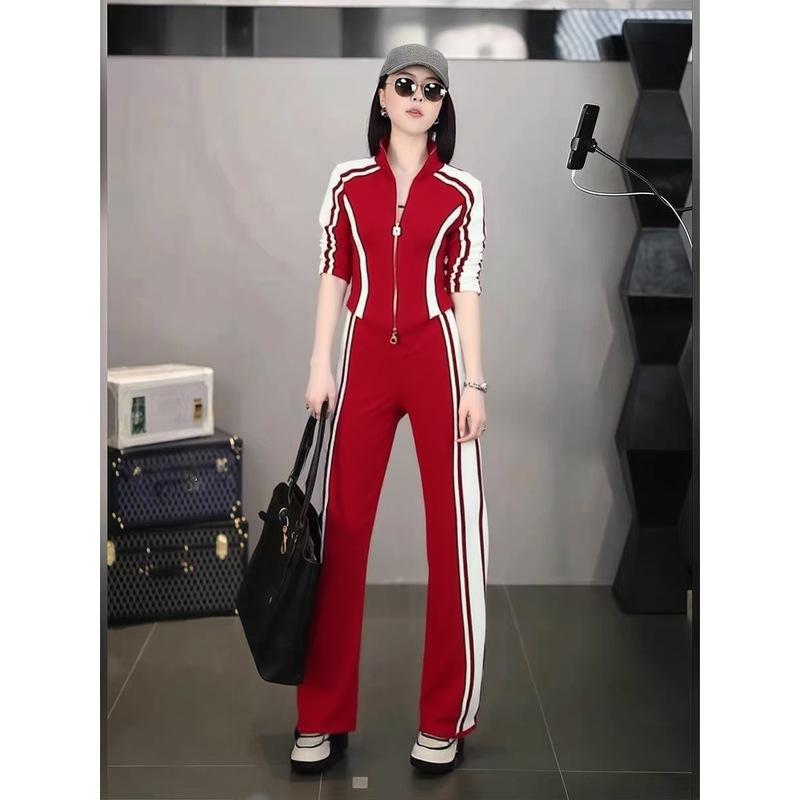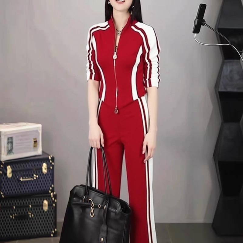 Conjunto de ropa deportiva casual de primavera y otoño para mujer, nuevo estilo 2025, temperamento, diseño que reduce la edad, sentido del diseño, bloque de color, rayas, pantalones de pierna ancha, conjunto de dos piezas