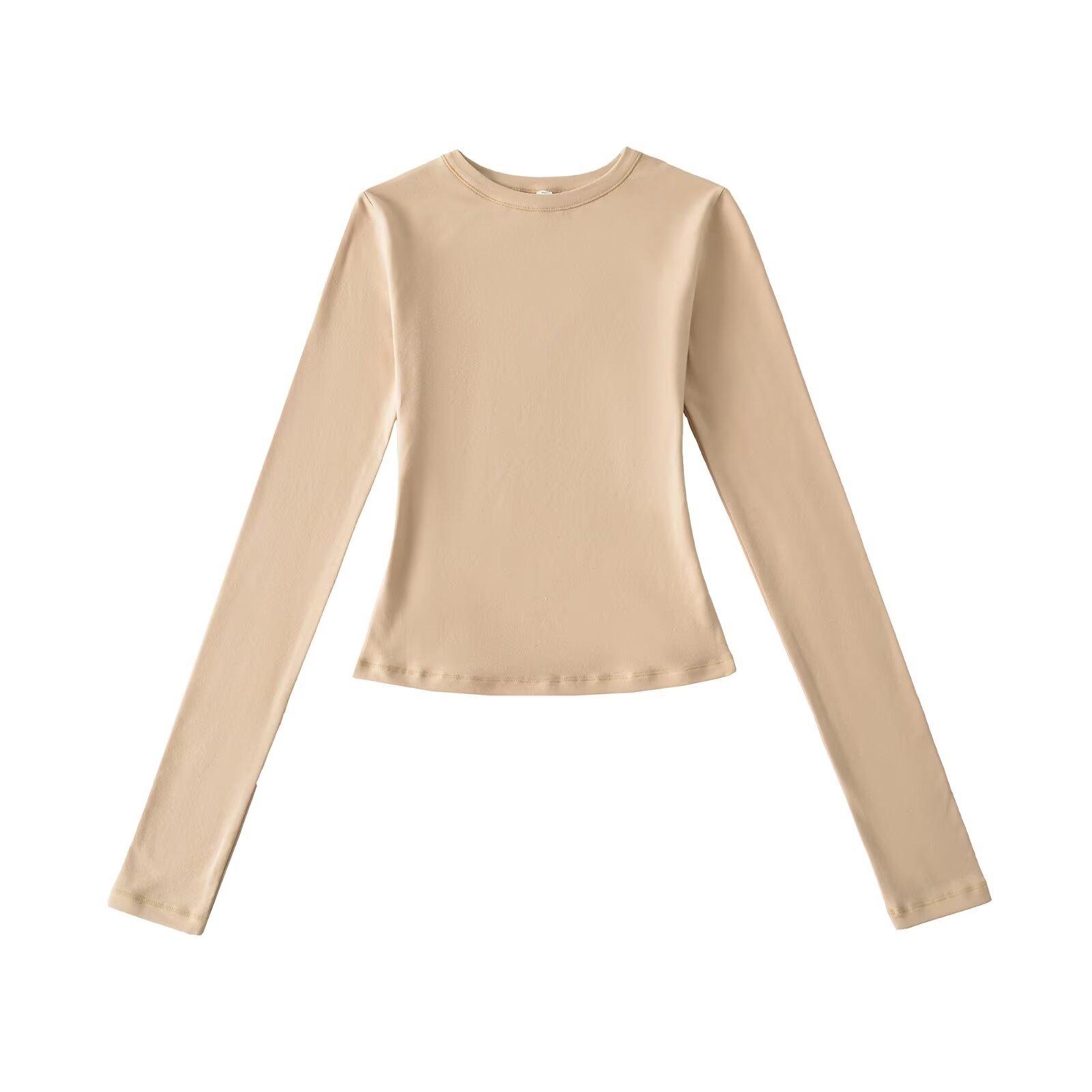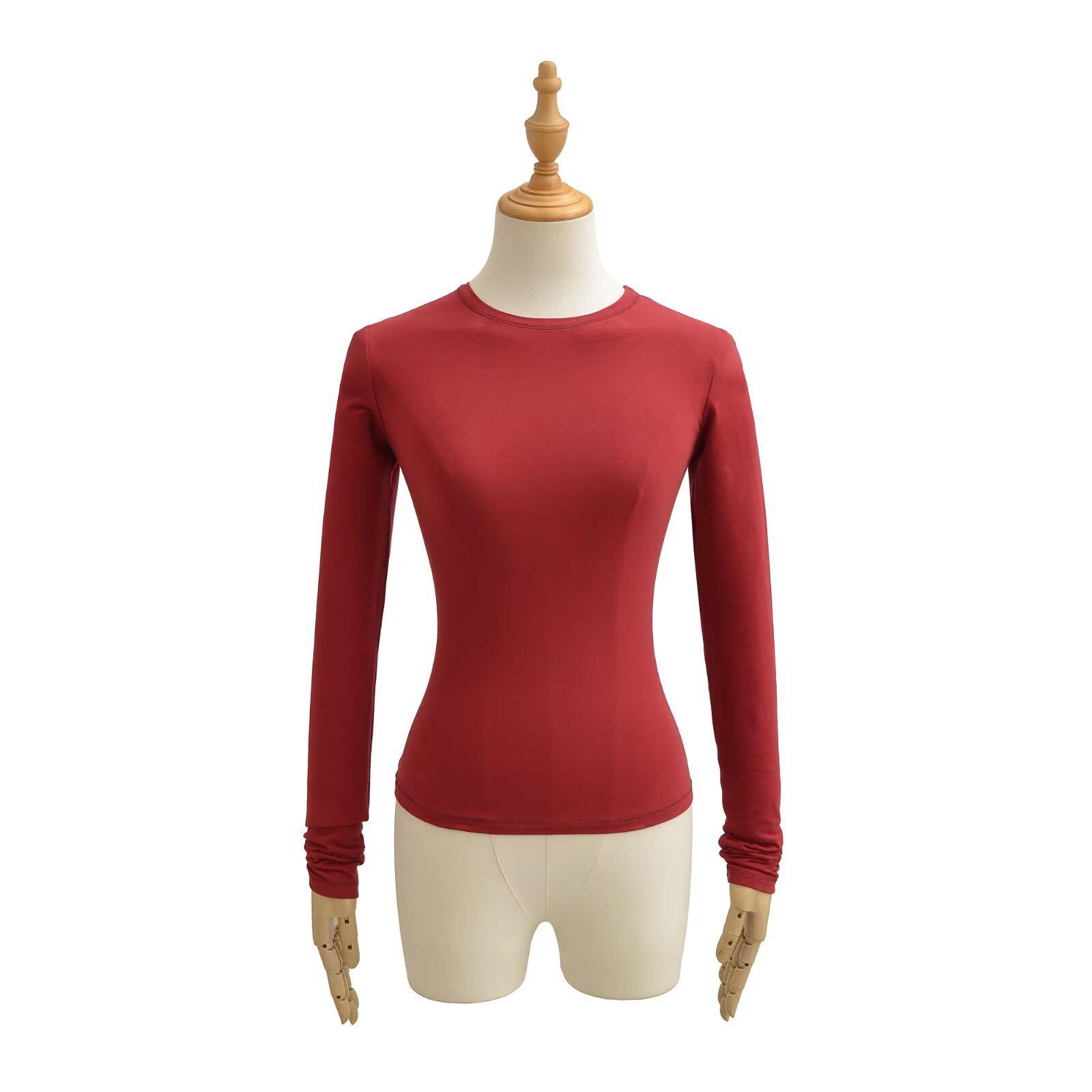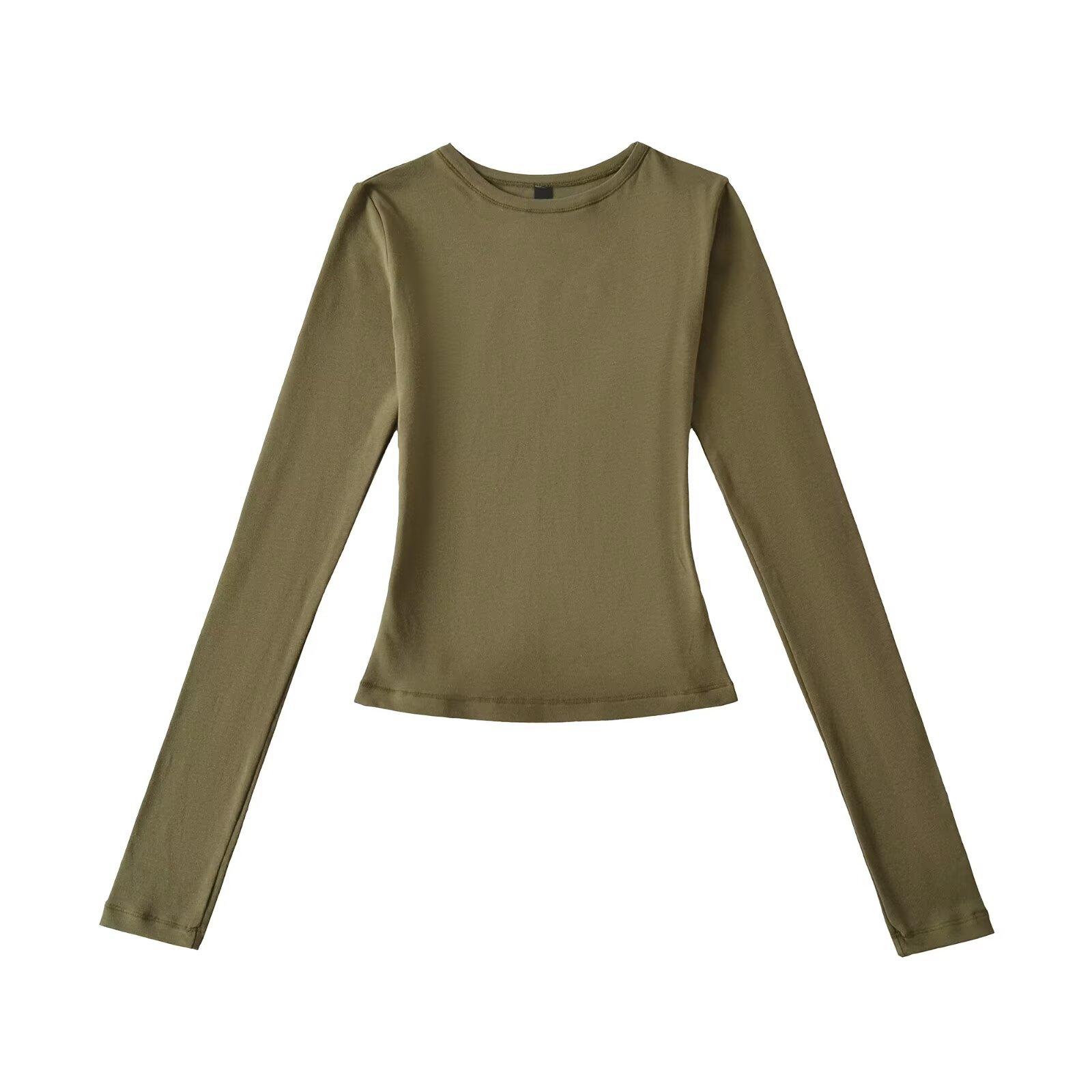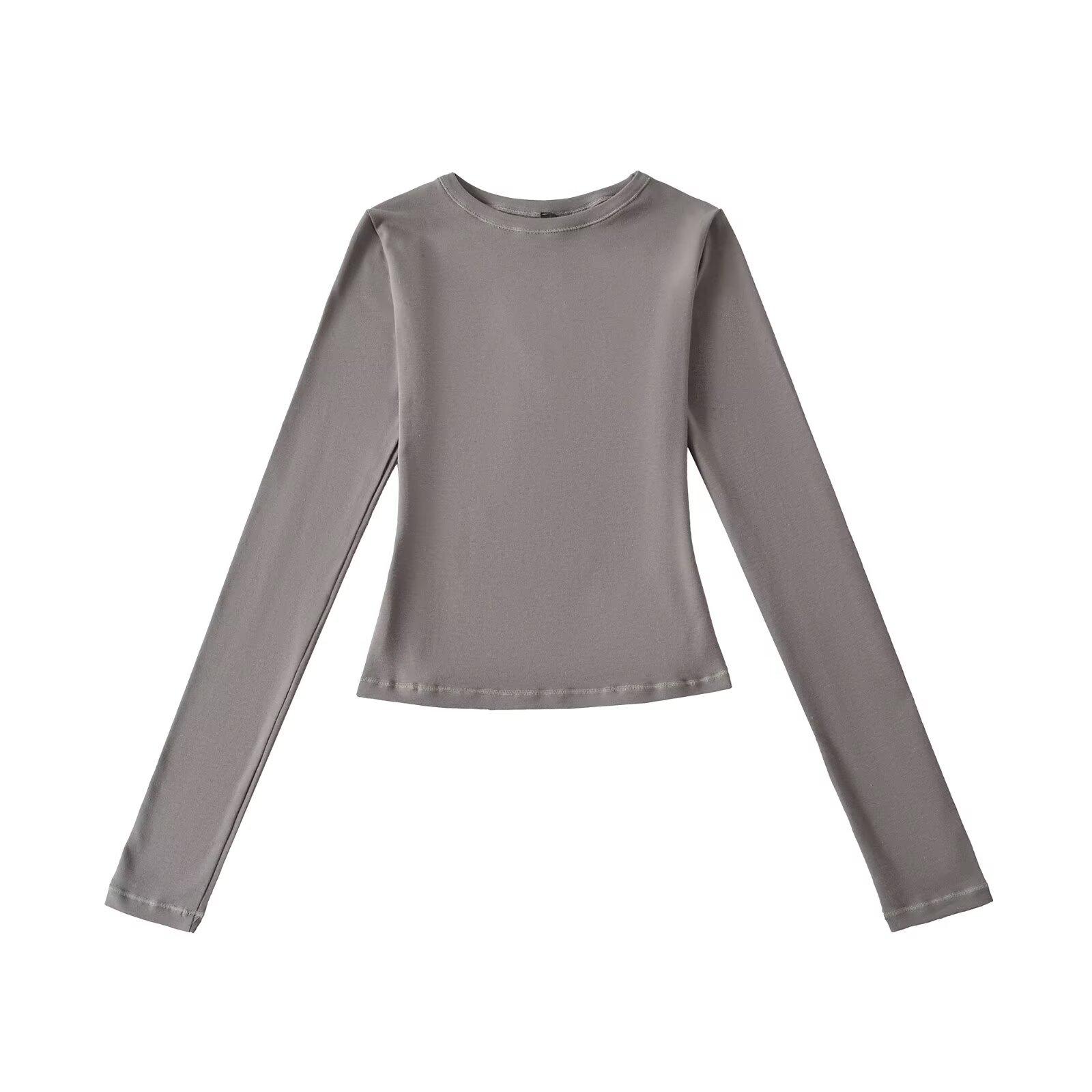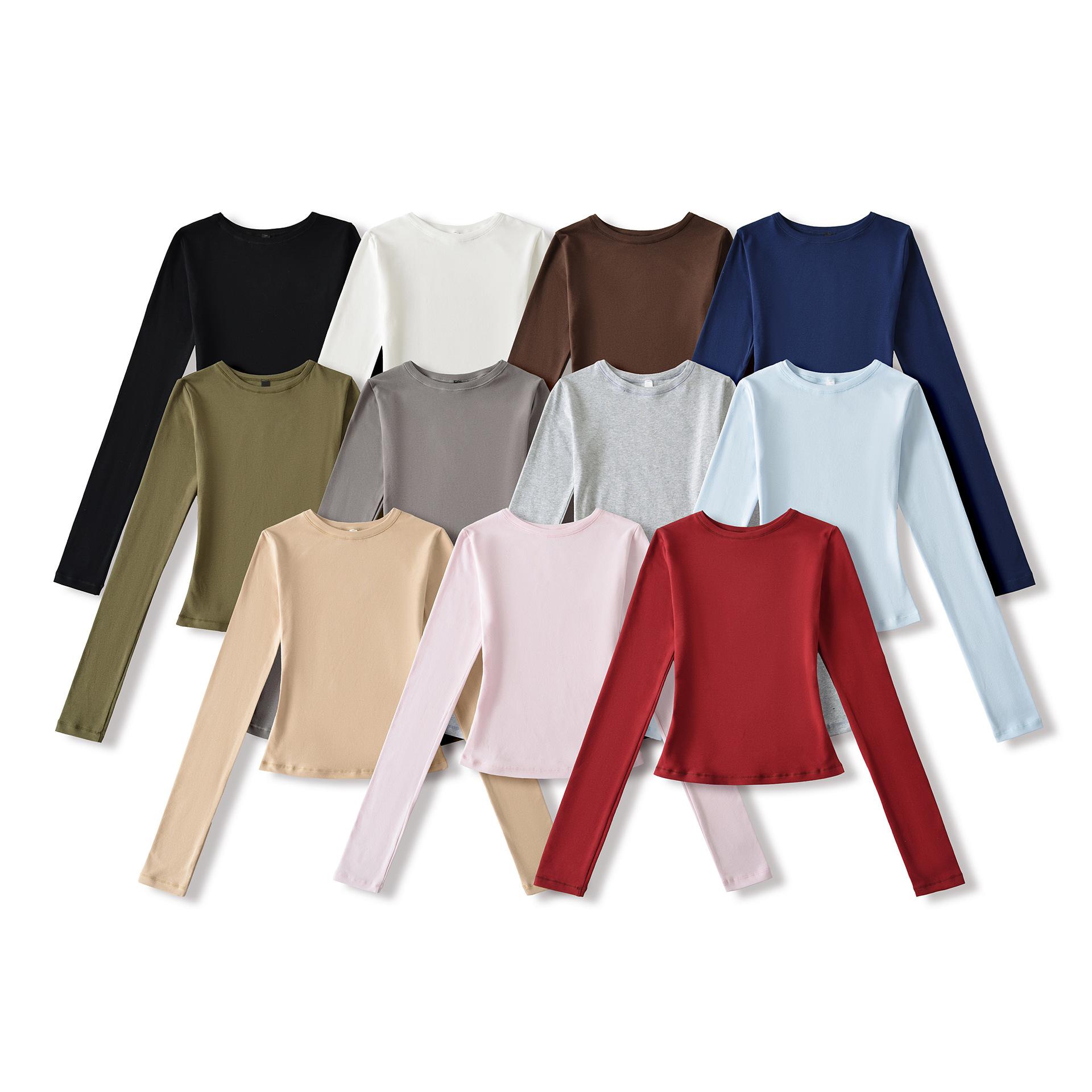 25118-Estilo europeo y americano moda de chica guapa camiseta de manga larga con cuello redondo para mujer 2025 nuevo top de camiseta básica sexy ajustada