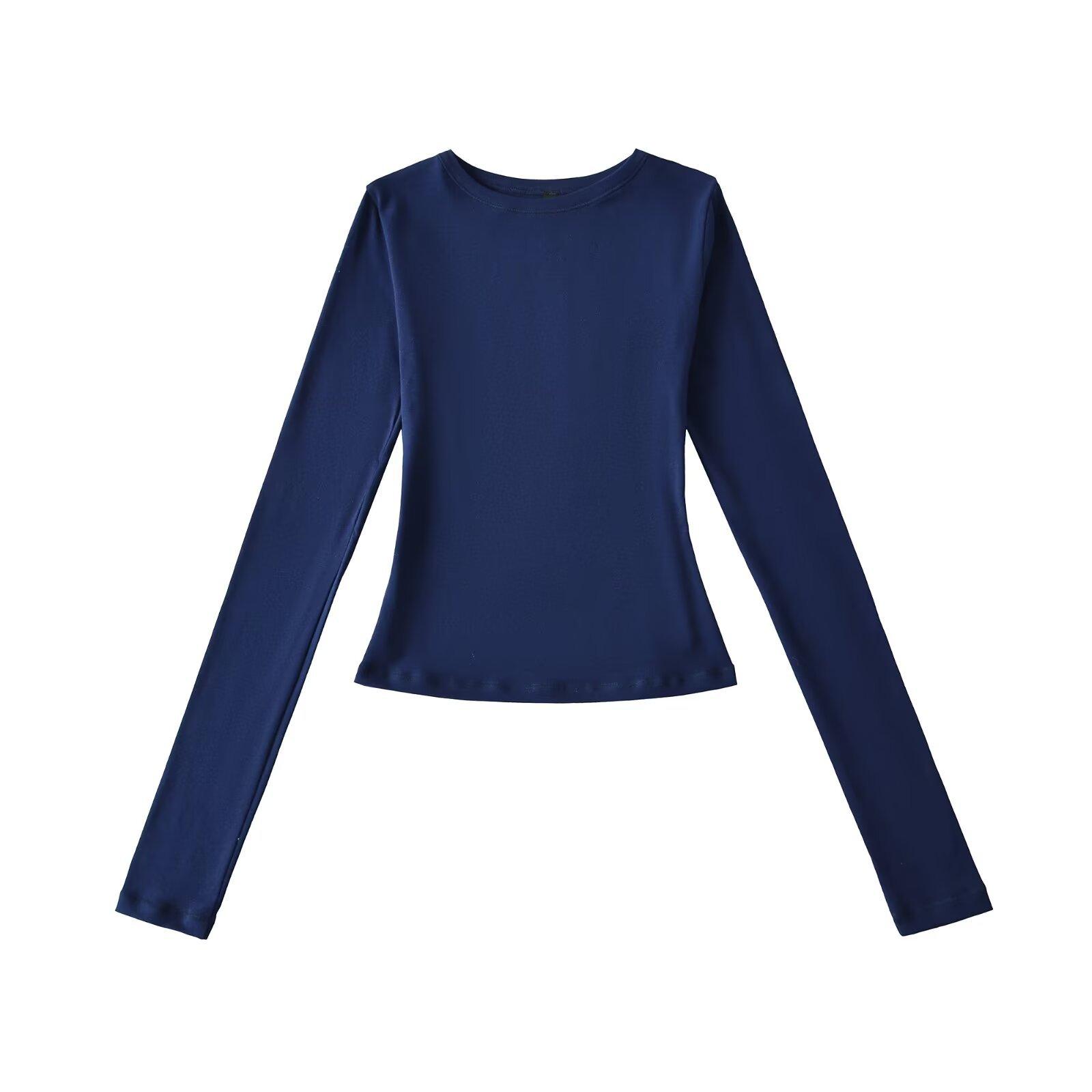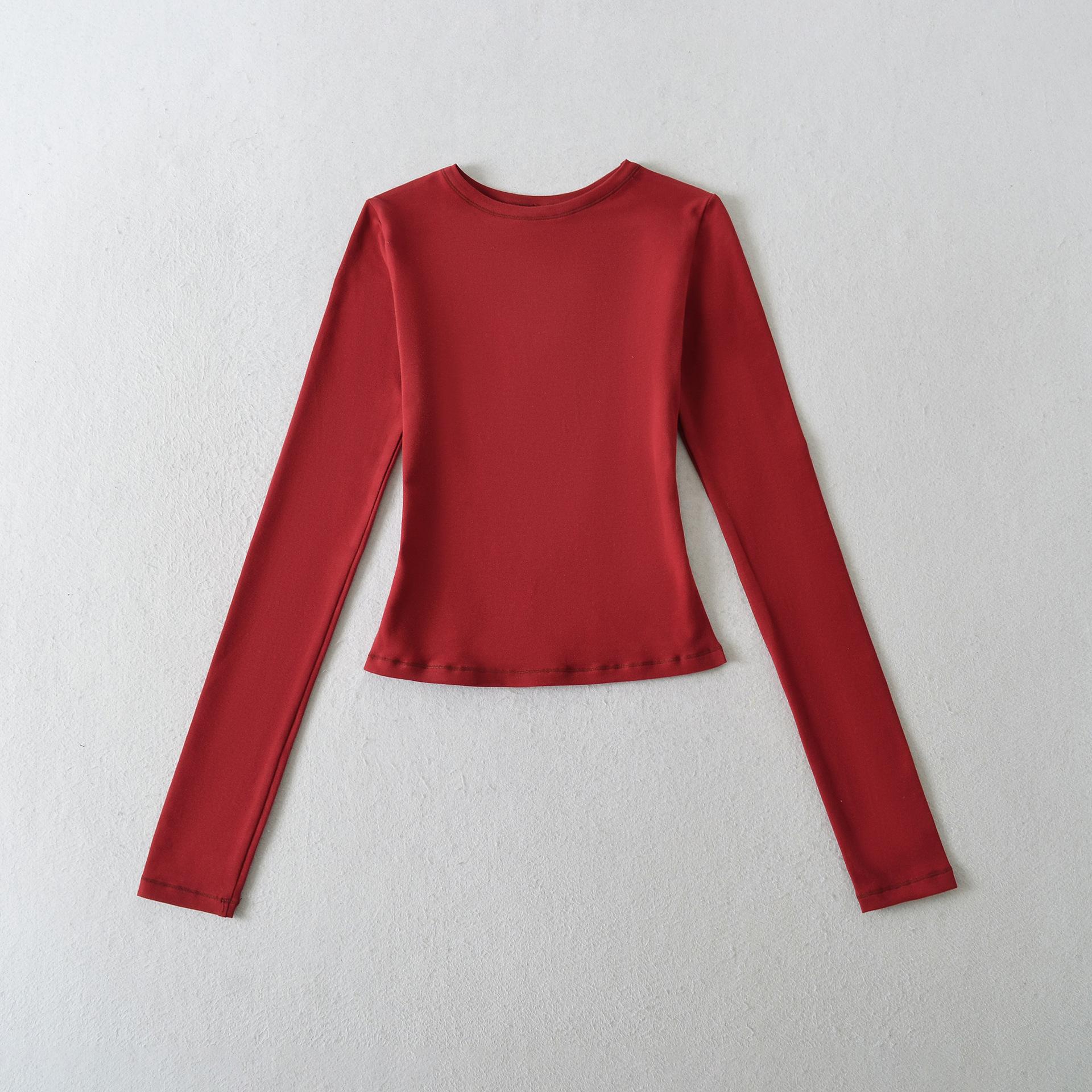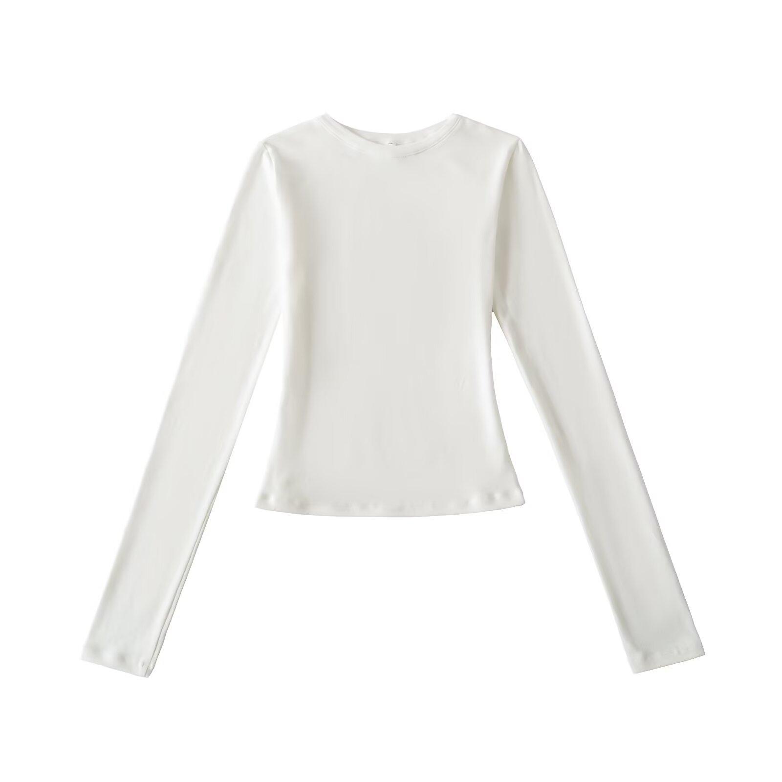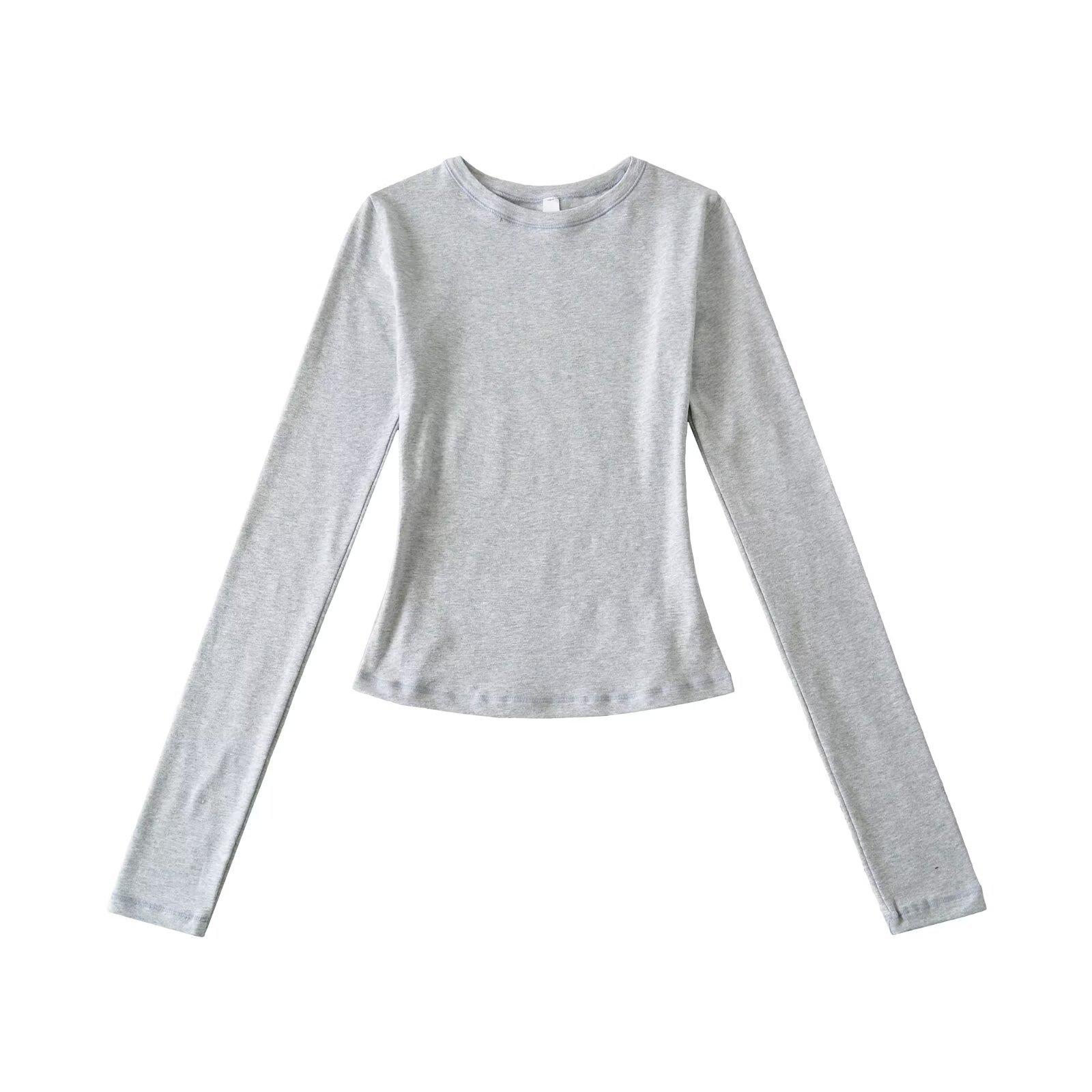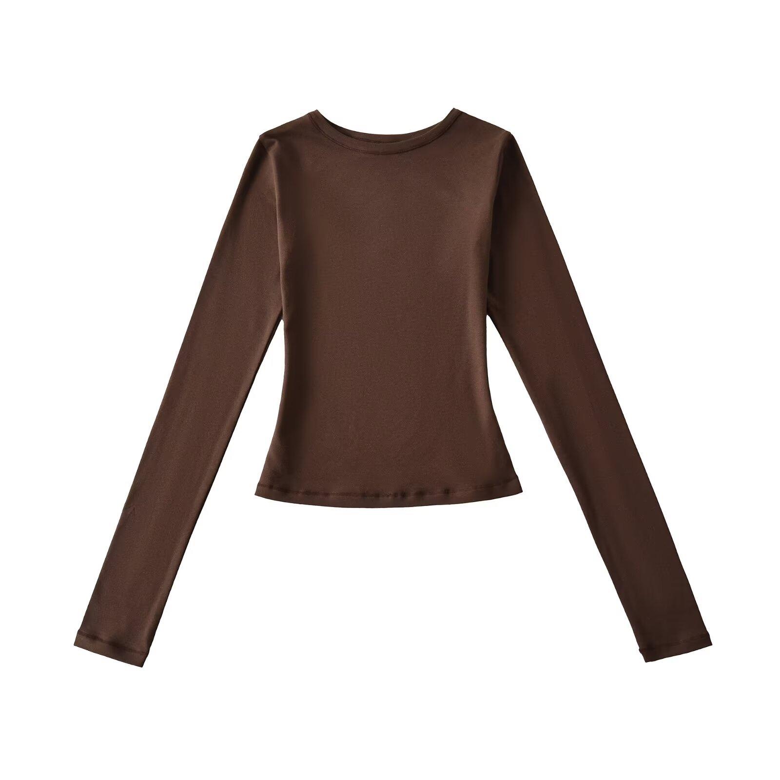 25118-Estilo europeo y americano moda de chica guapa camiseta de manga larga con cuello redondo para mujer 2025 nuevo top de camiseta básica sexy ajustada