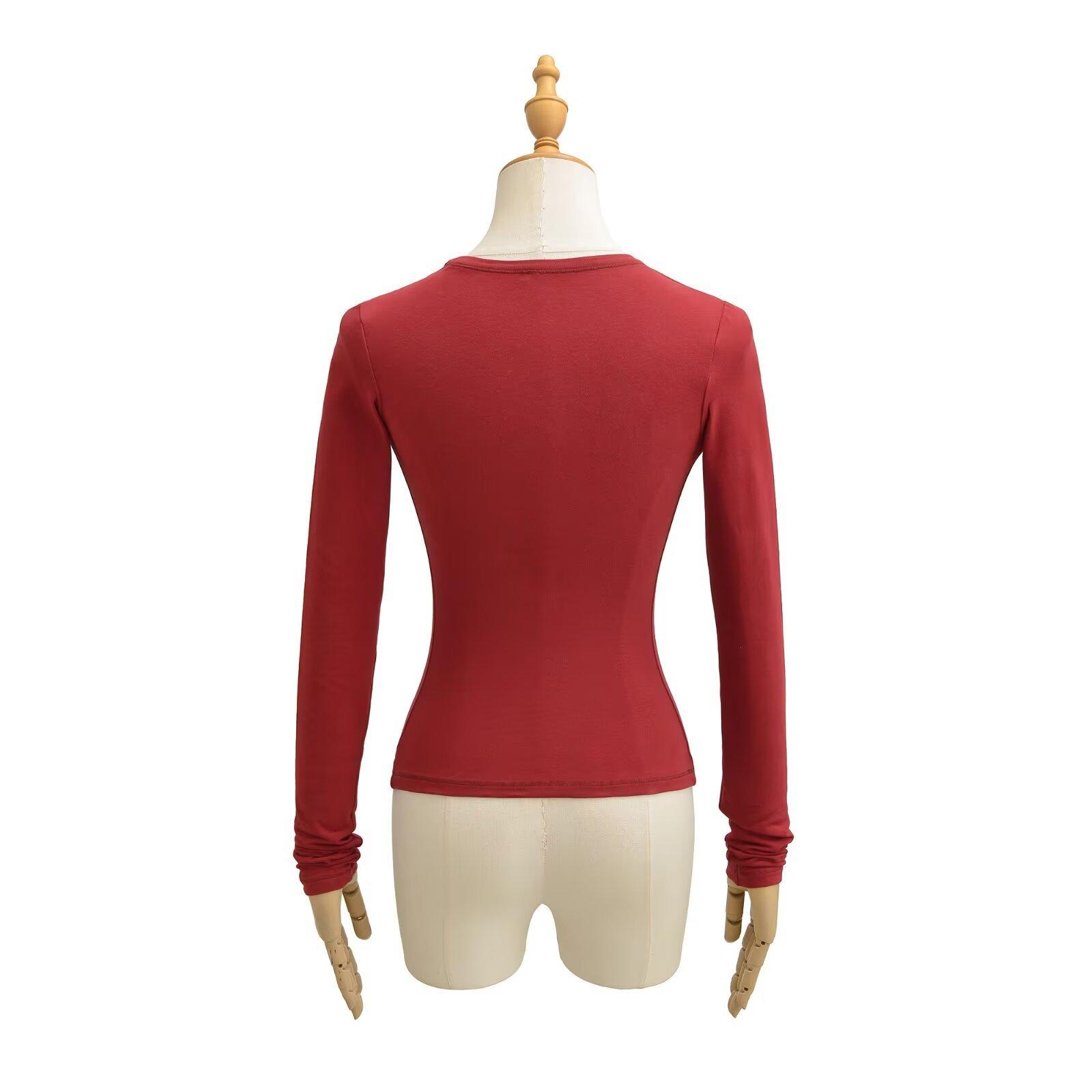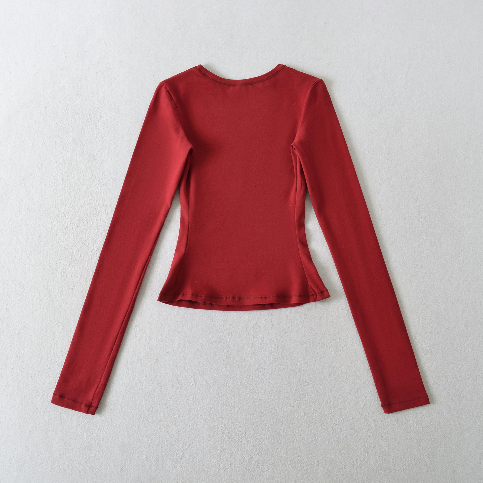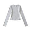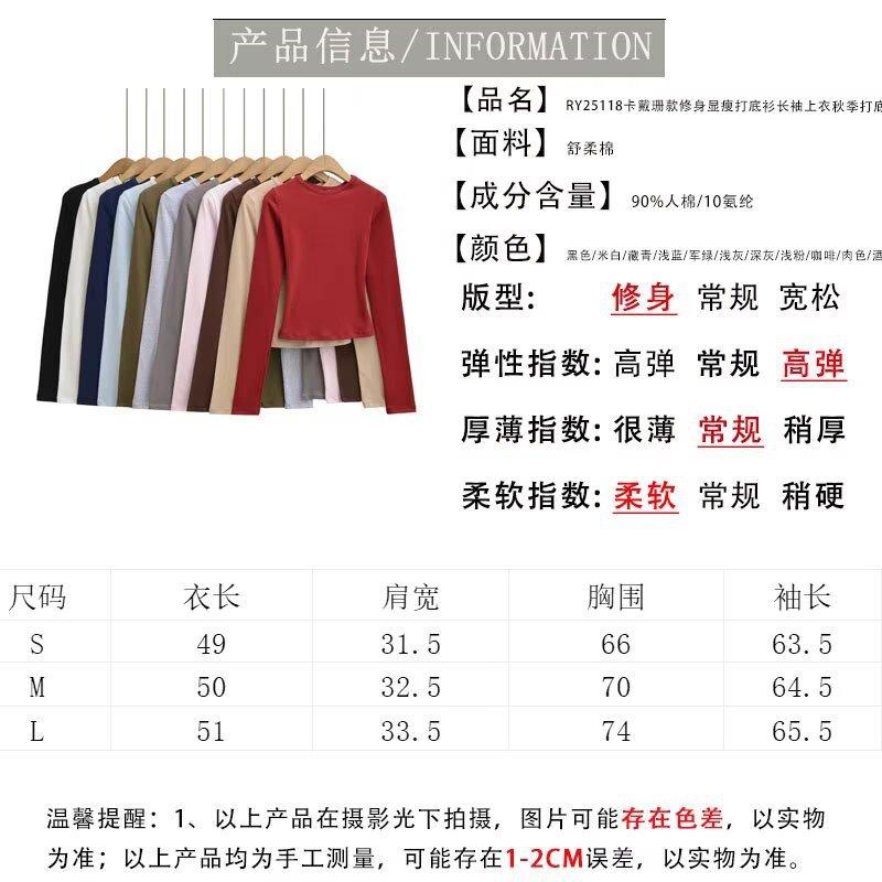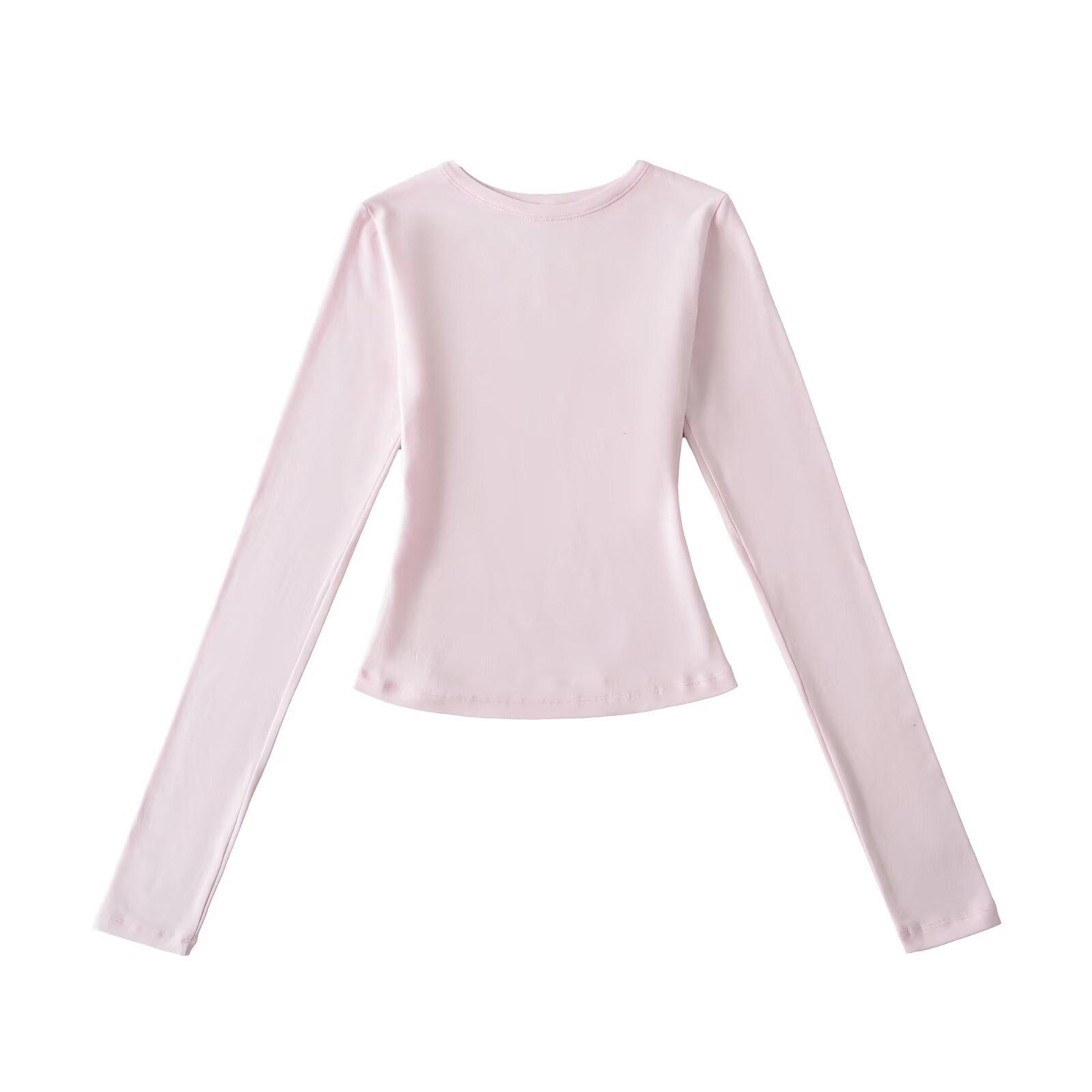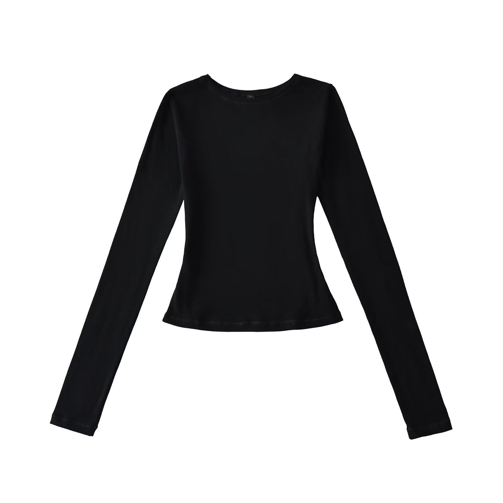 25118-Estilo europeo y americano moda de chica guapa camiseta de manga larga con cuello redondo para mujer 2025 nuevo top de camiseta básica sexy ajustada