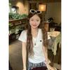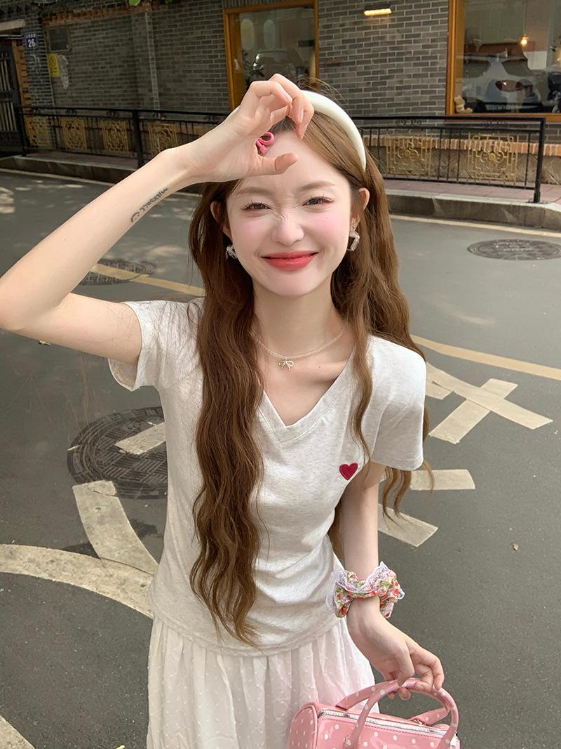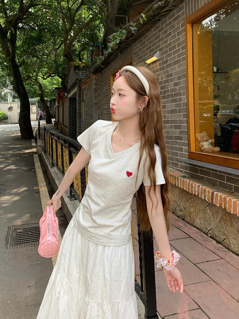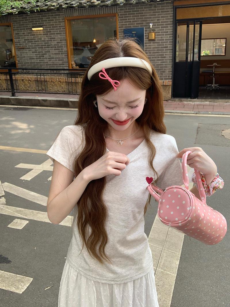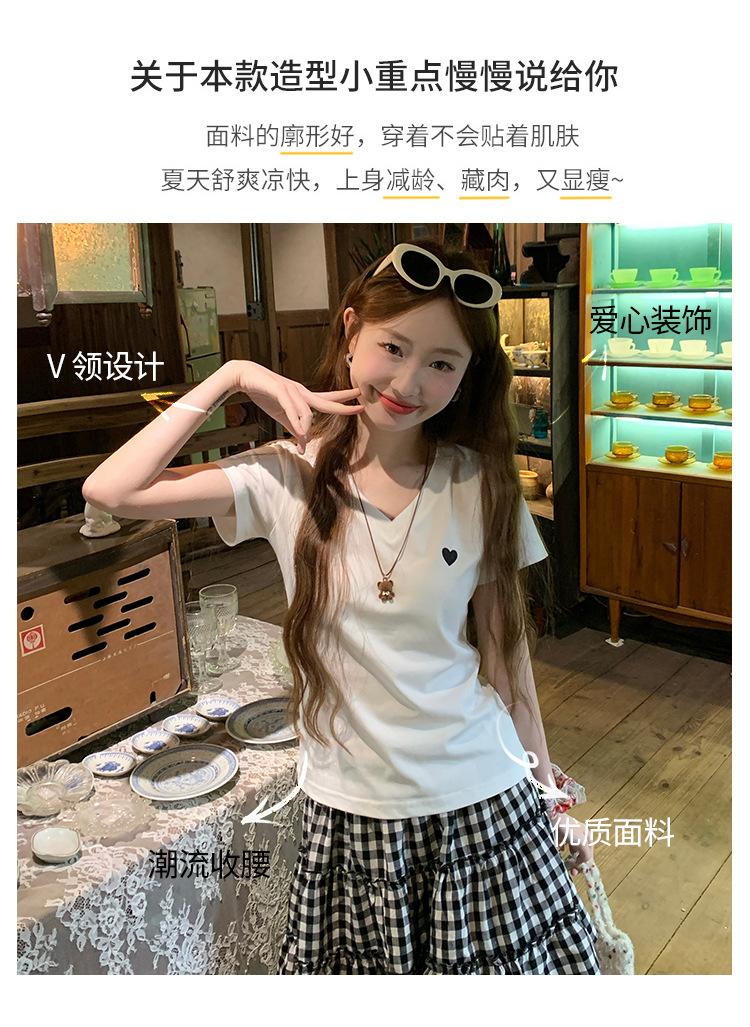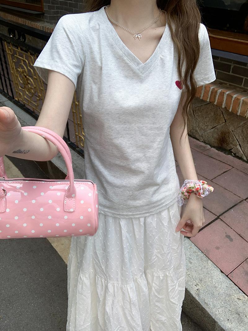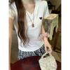 2025 Nuevo Estilo de Verano Camiseta de Manga Corta de Color Puro con Hombro Derecho Descubierto para Mujer Look Adelgazante Algodón Puro Cuello en V Camiseta Base Top con Ropa Interior Moderna