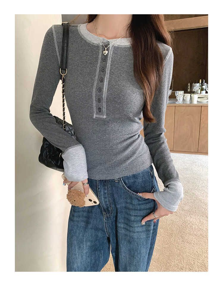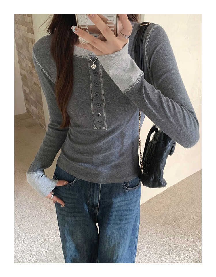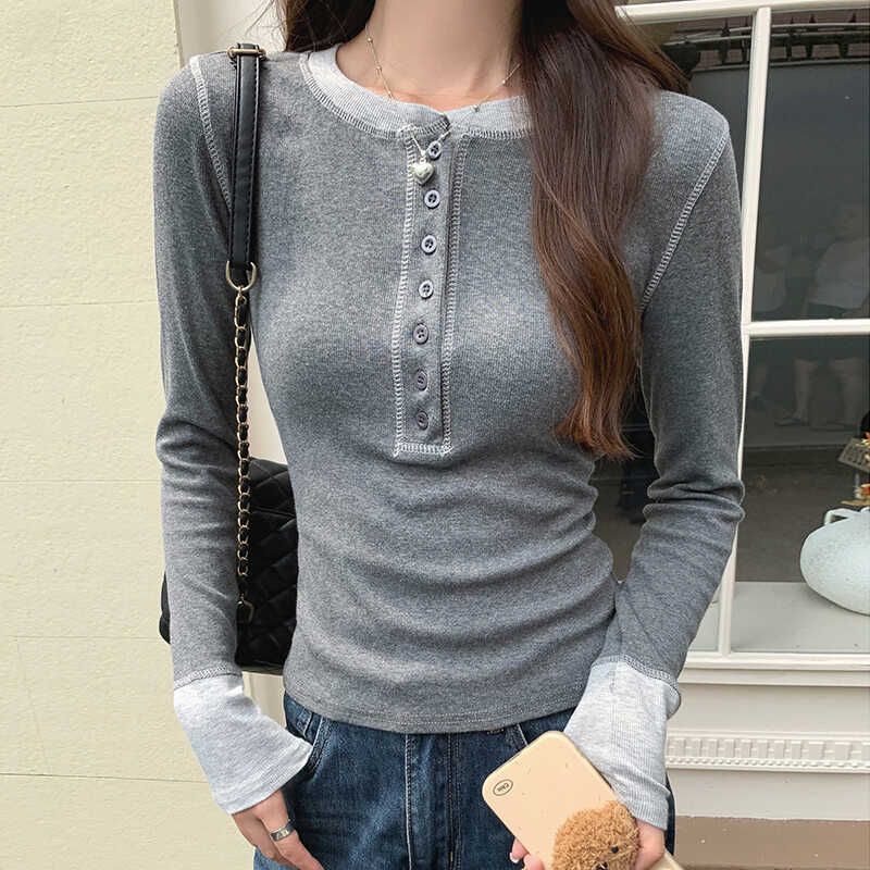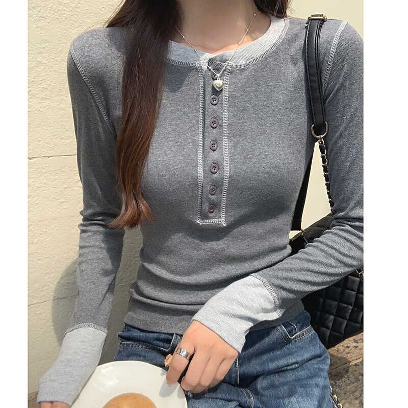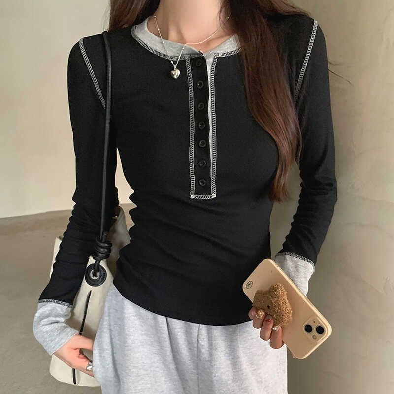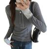 Camiseta Nueva de Manga Larga con Costuras de Contraste Vintage para Mujer Otoño Ajustada Adelgazante Camiseta Básica Corta Interior