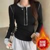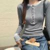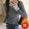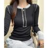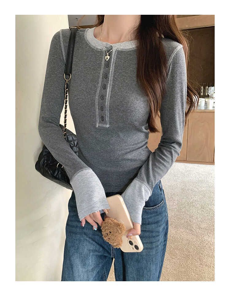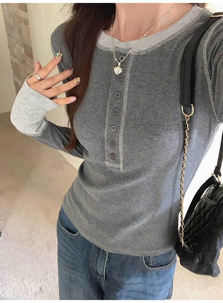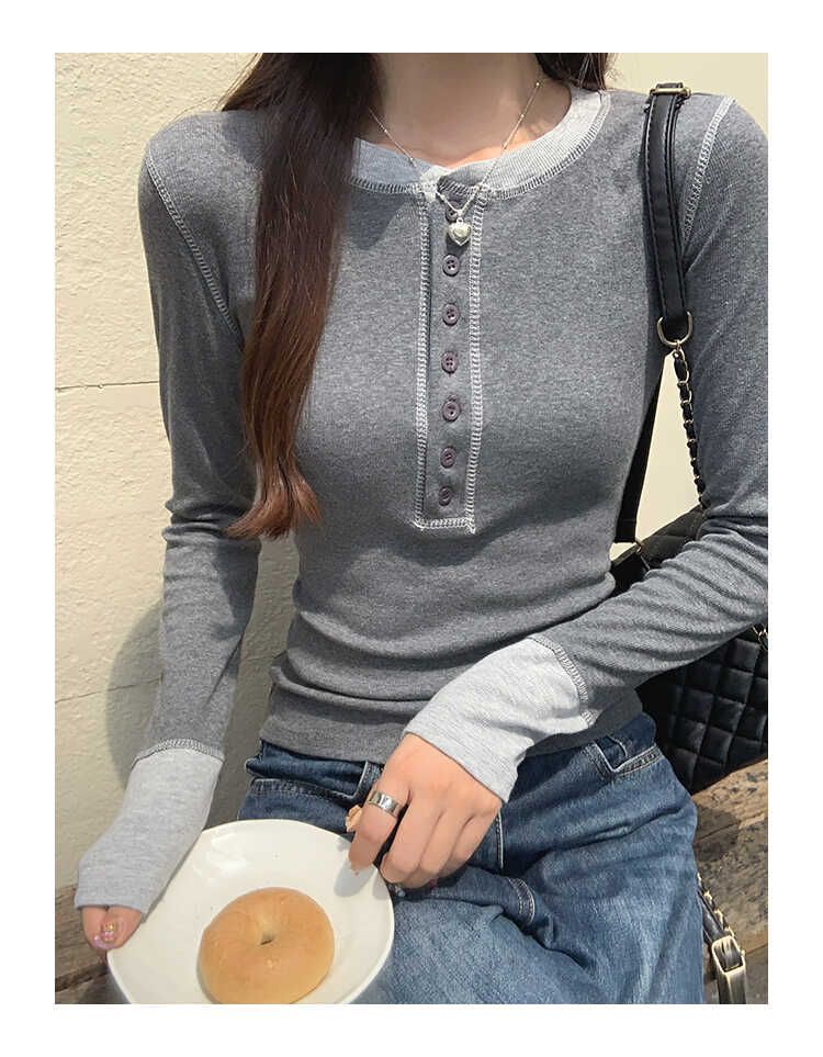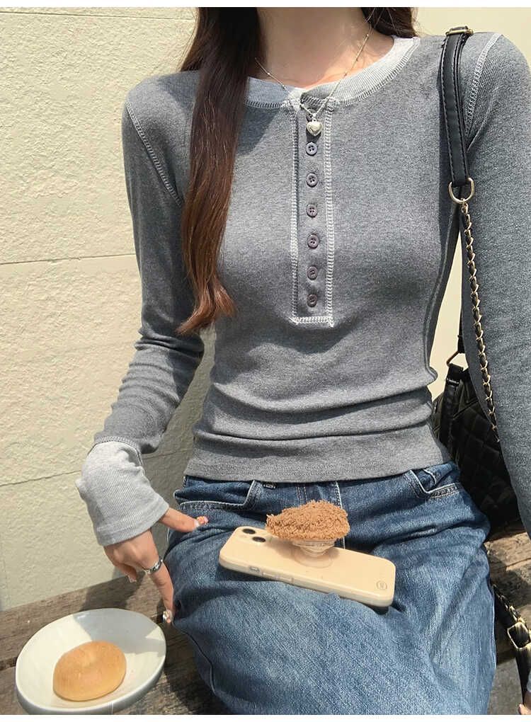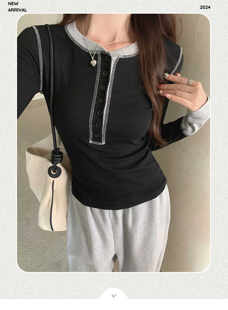 Camiseta Nueva de Manga Larga con Costuras de Contraste Vintage para Mujer Otoño Ajustada Adelgazante Camiseta Básica Corta Interior