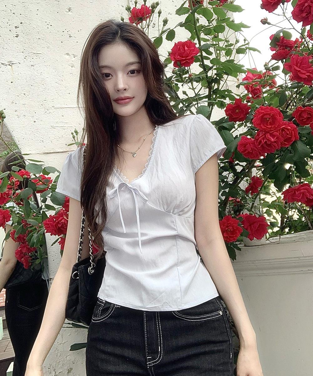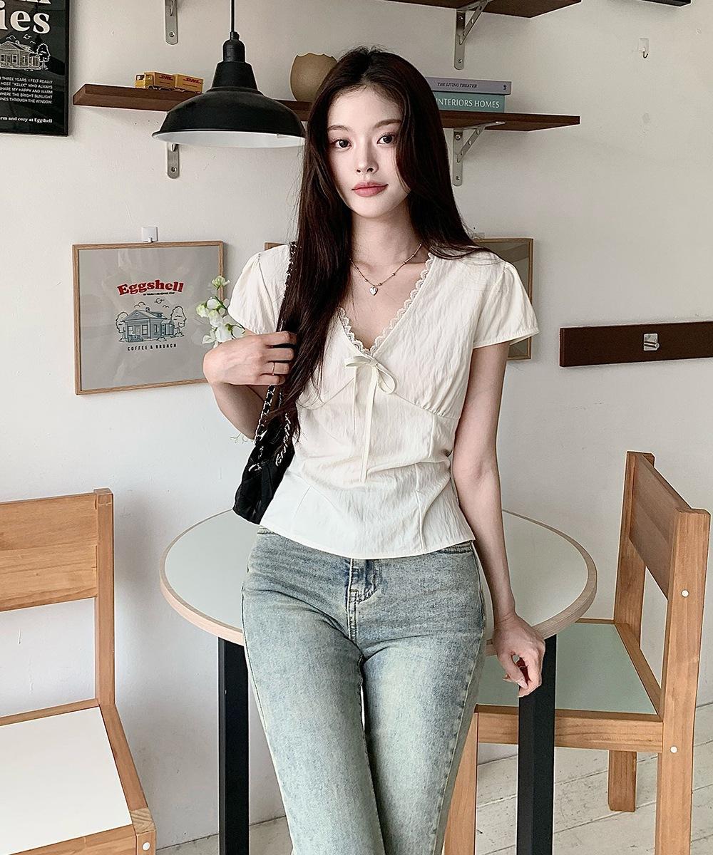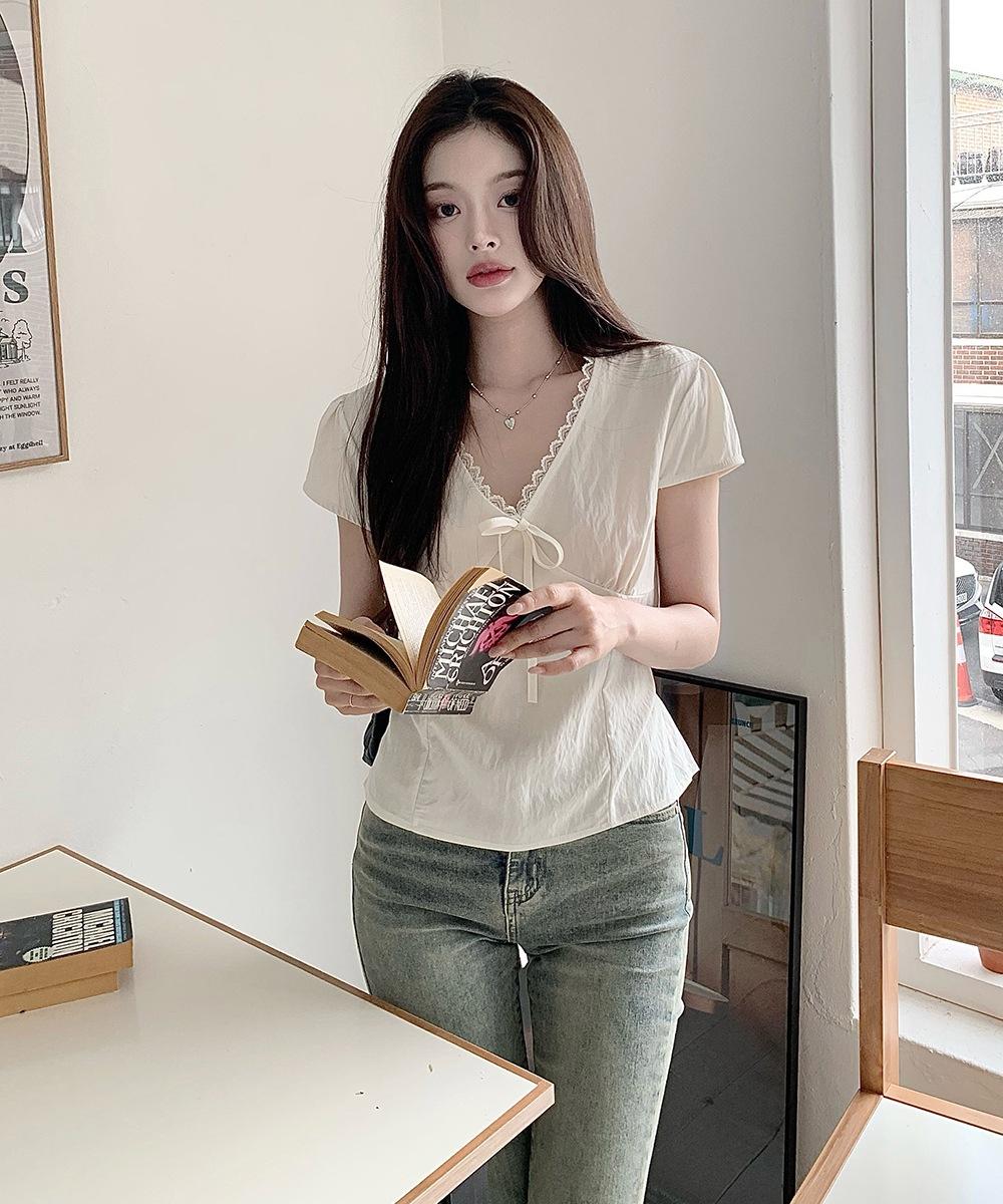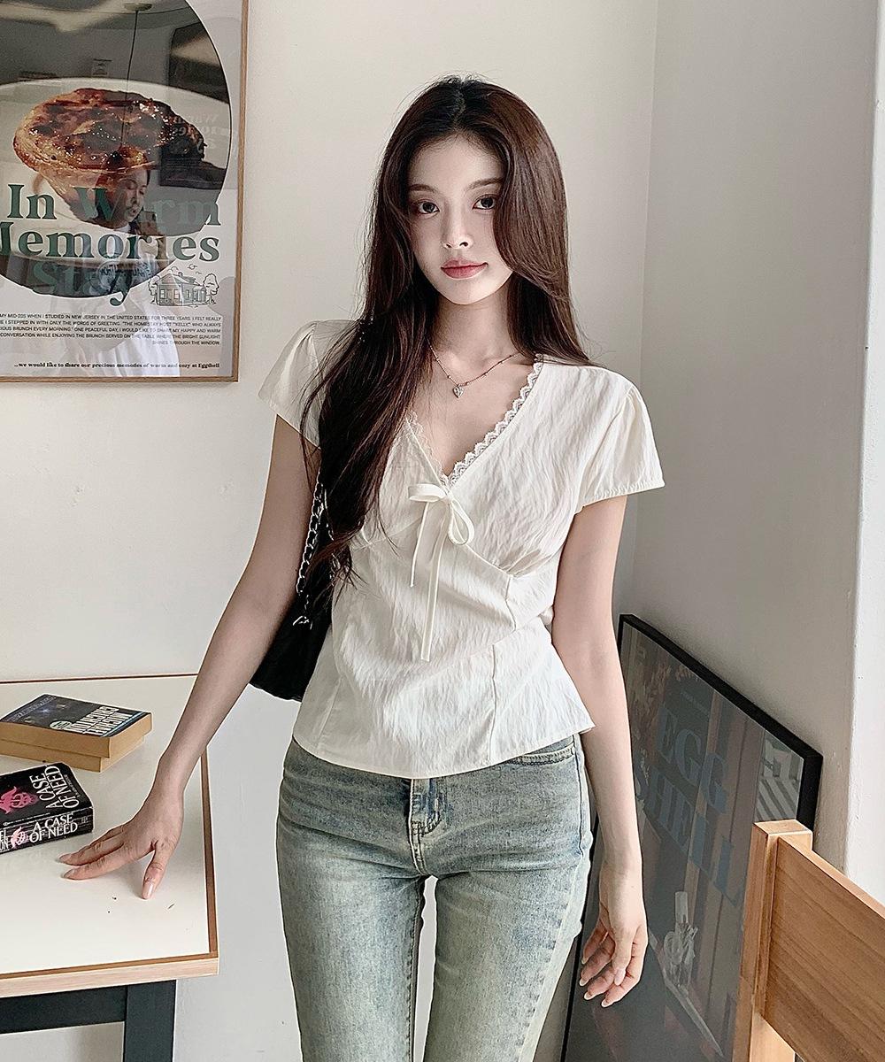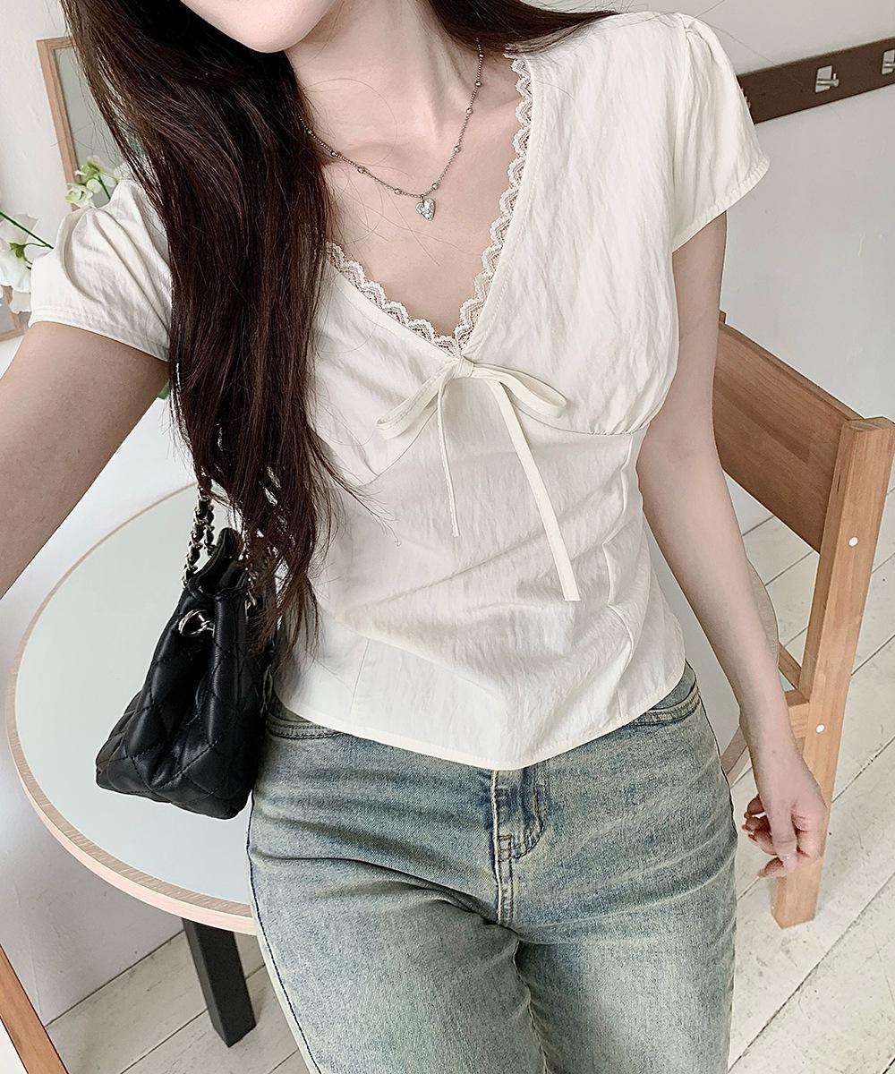 Camisa Coreana Ins Elegante Suave Encaje de Hadas Cuello en V para Mujer 2025 Verano Dulce Camisa de Manguita Vuelo