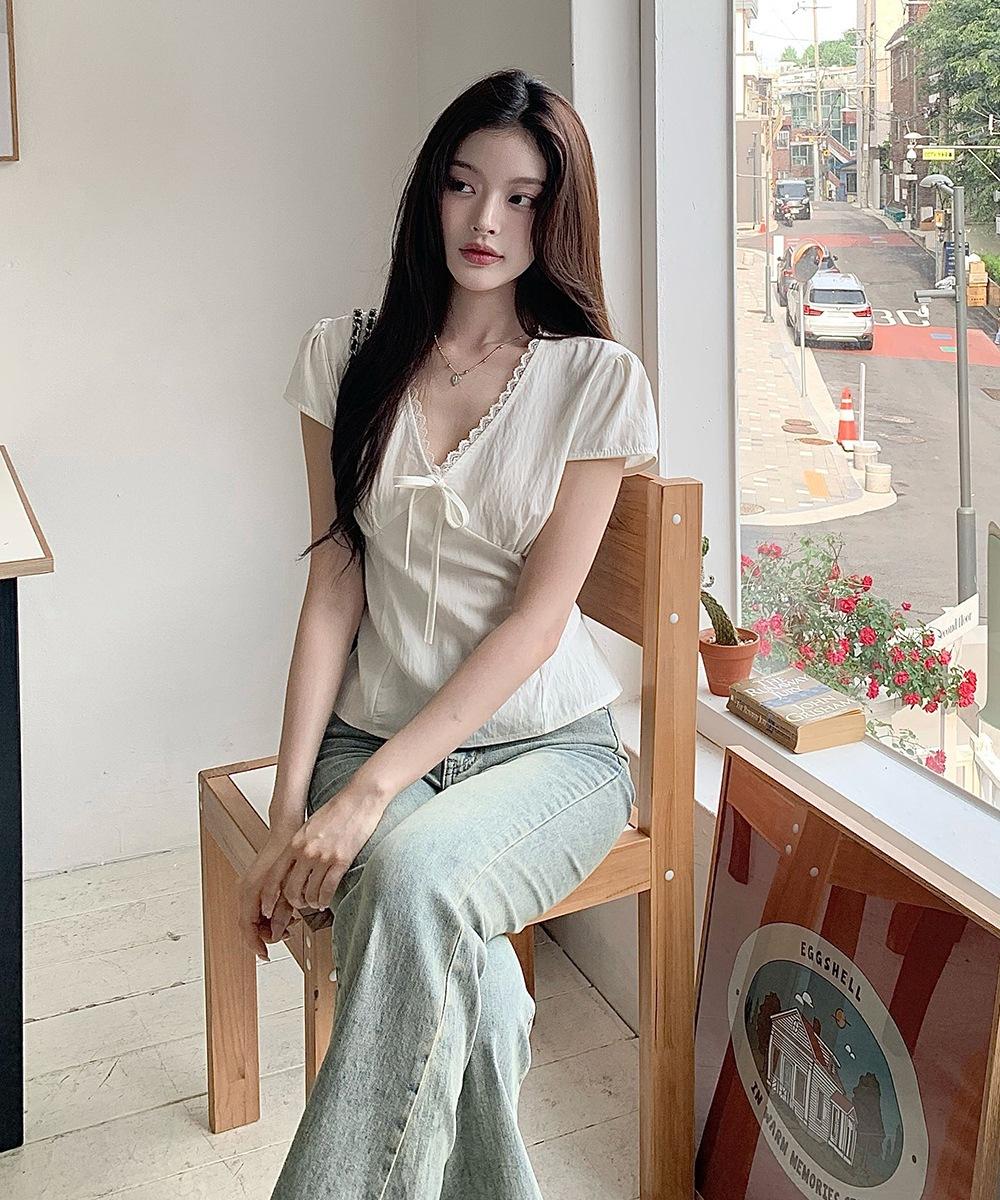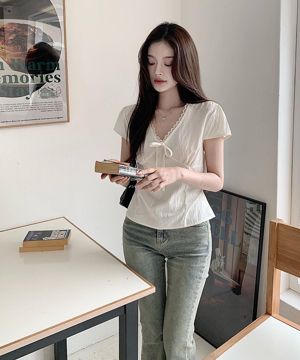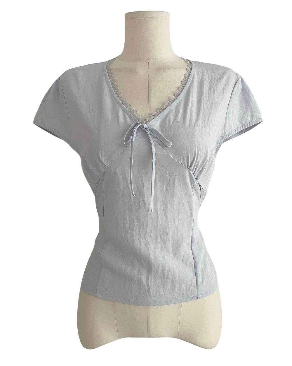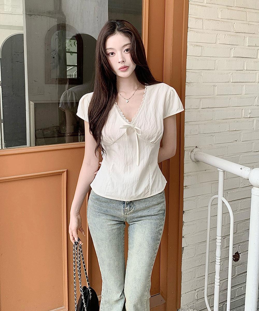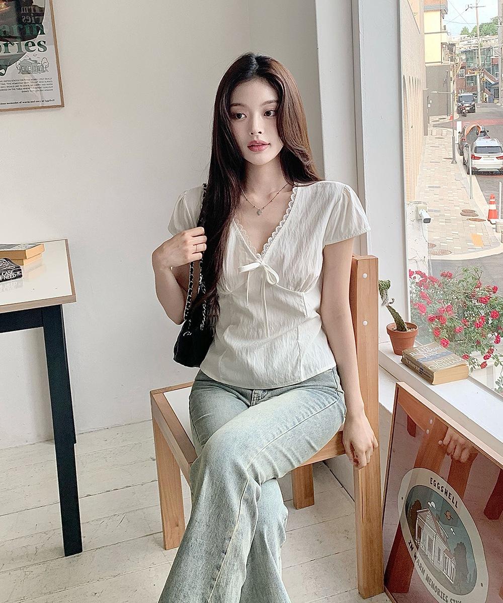 Camisa Coreana Ins Elegante Suave Encaje de Hadas Cuello en V para Mujer 2025 Verano Dulce Camisa de Manguita Vuelo