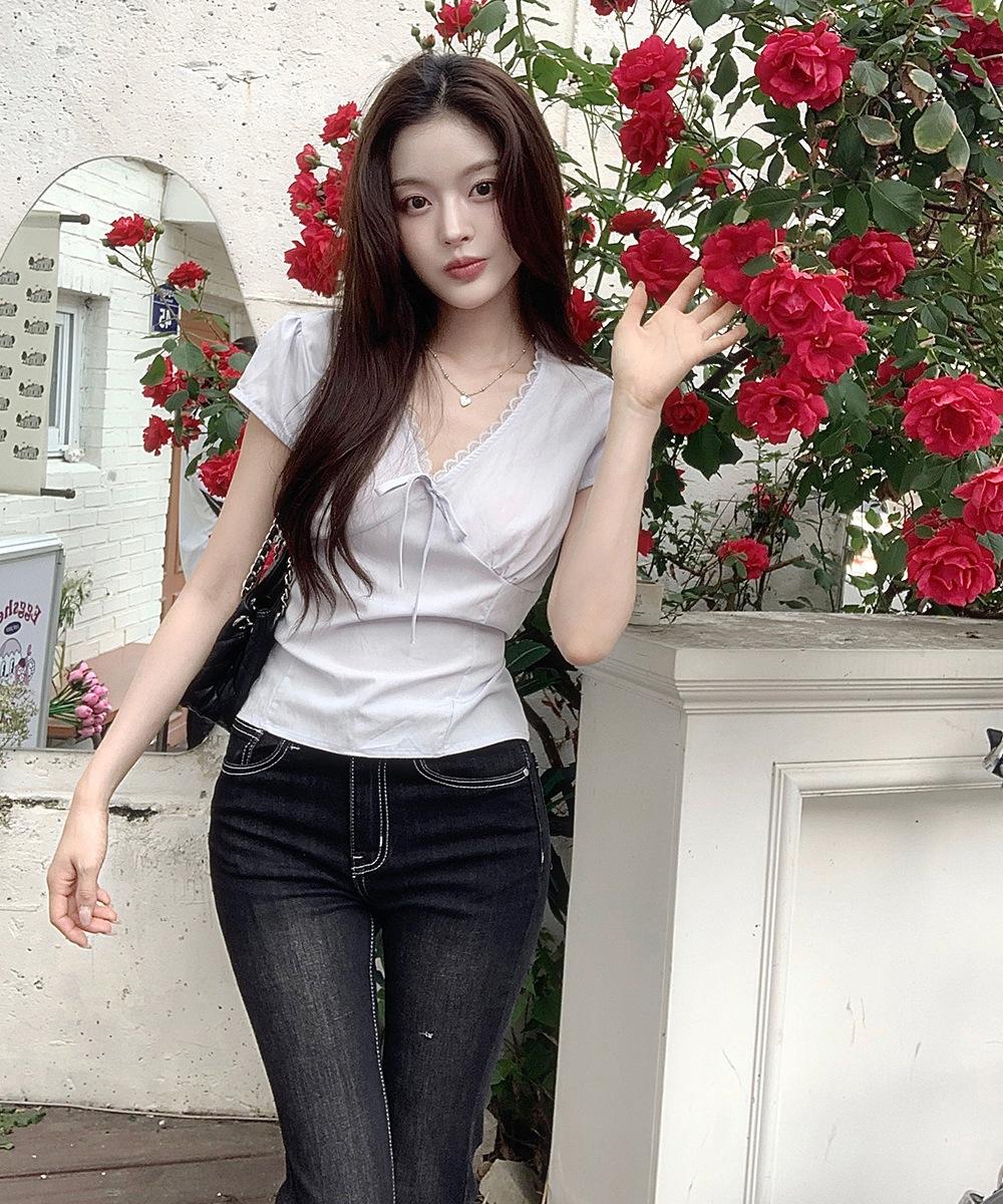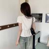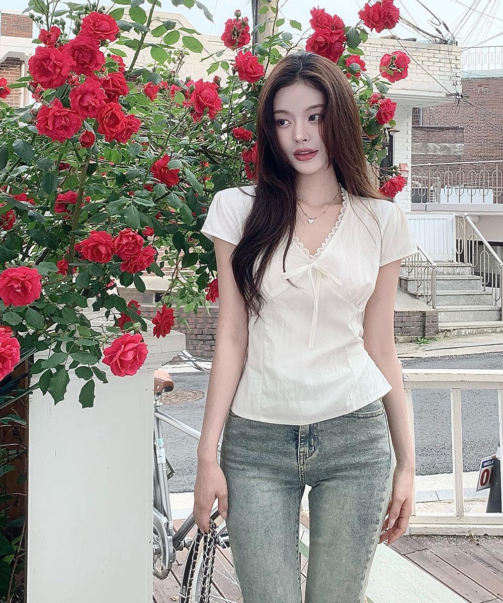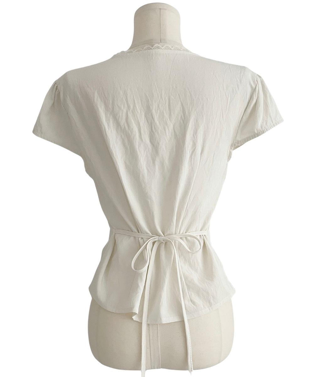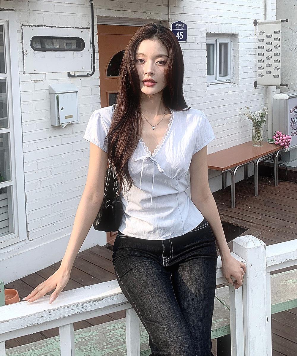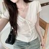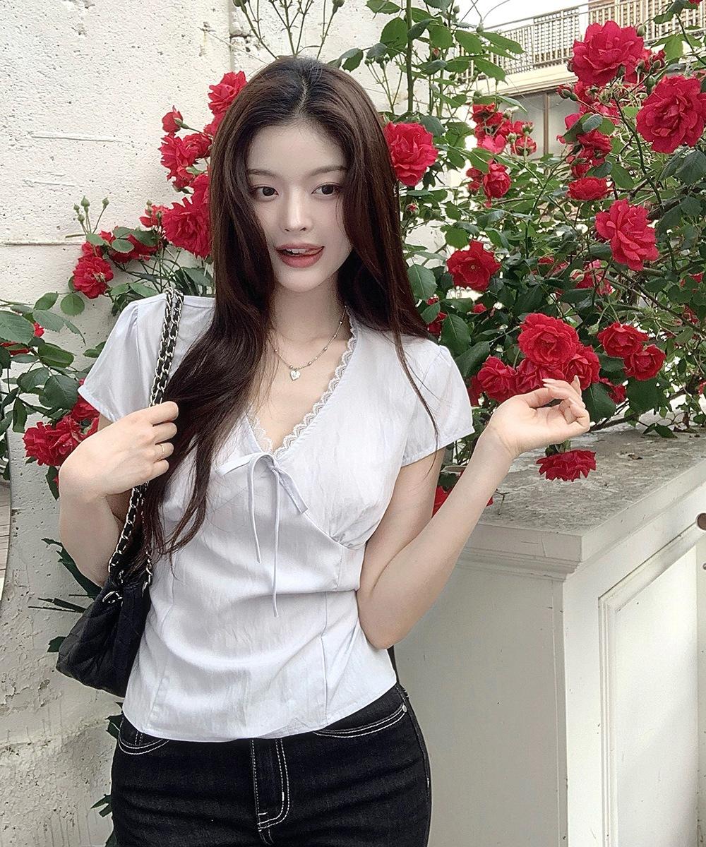 Camisa Coreana Ins Elegante Suave Encaje de Hadas Cuello en V para Mujer 2025 Verano Dulce Camisa de Manguita Vuelo