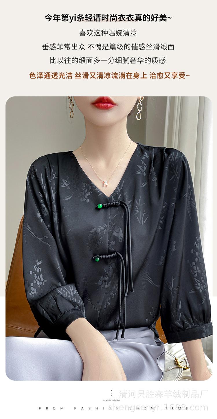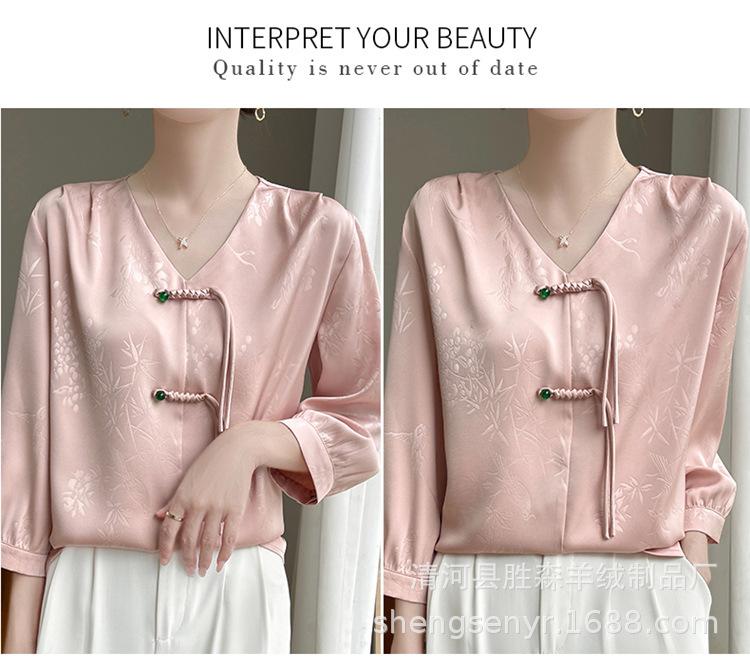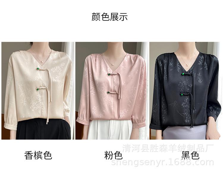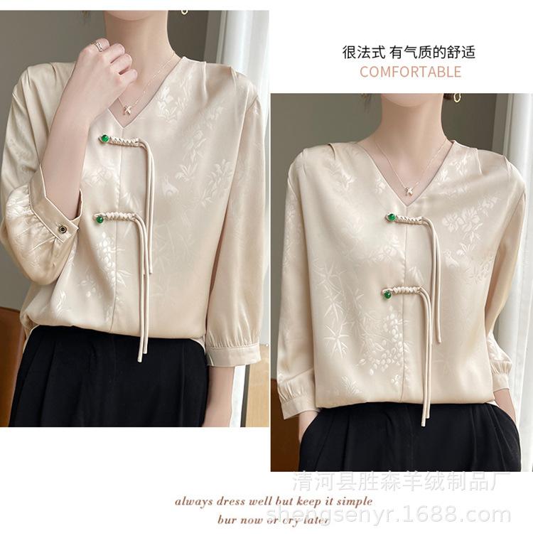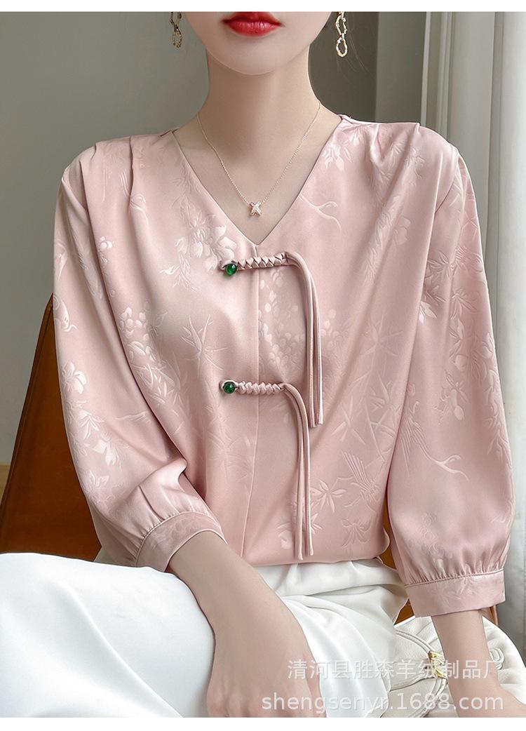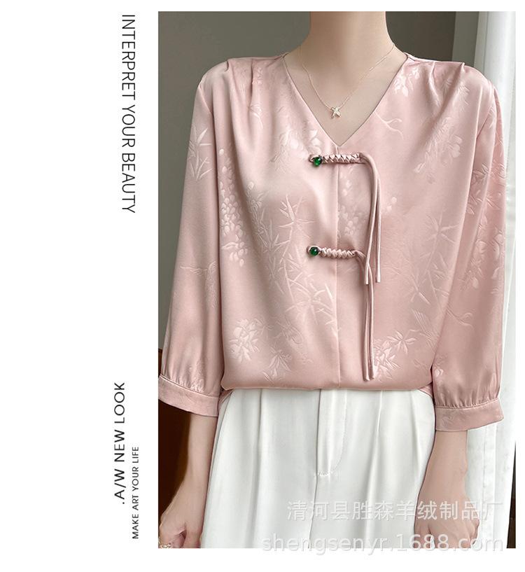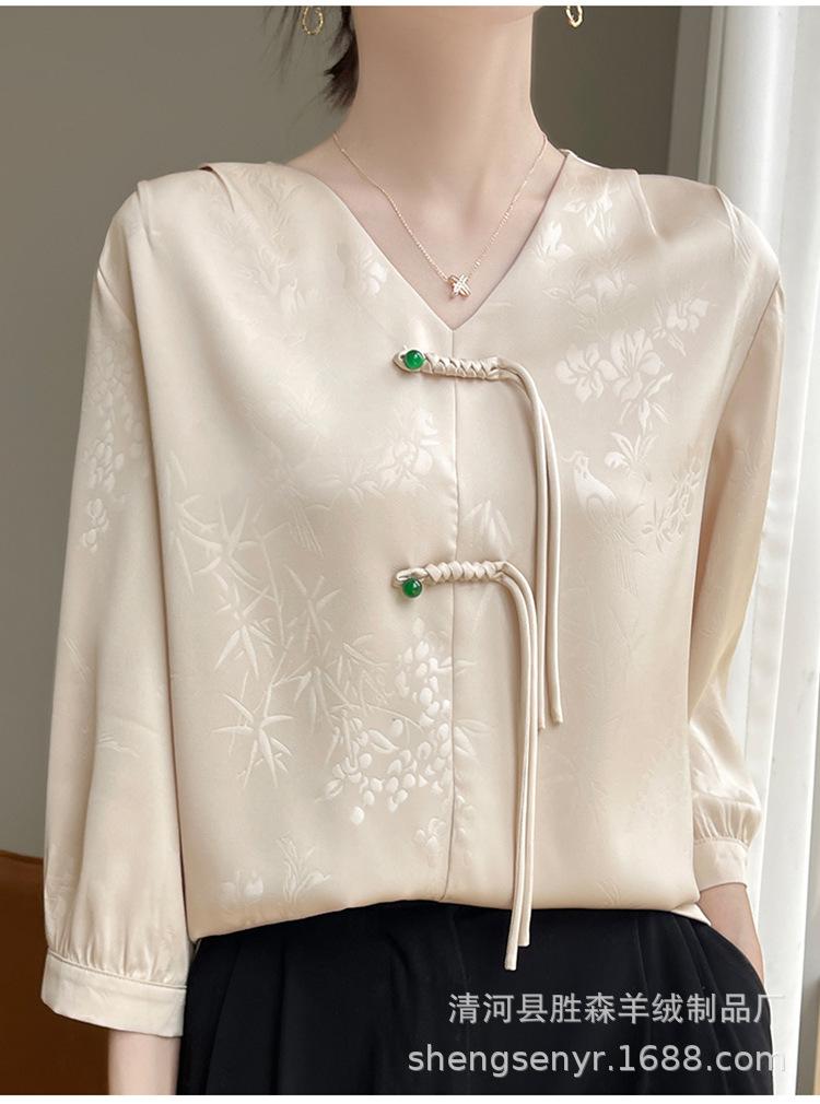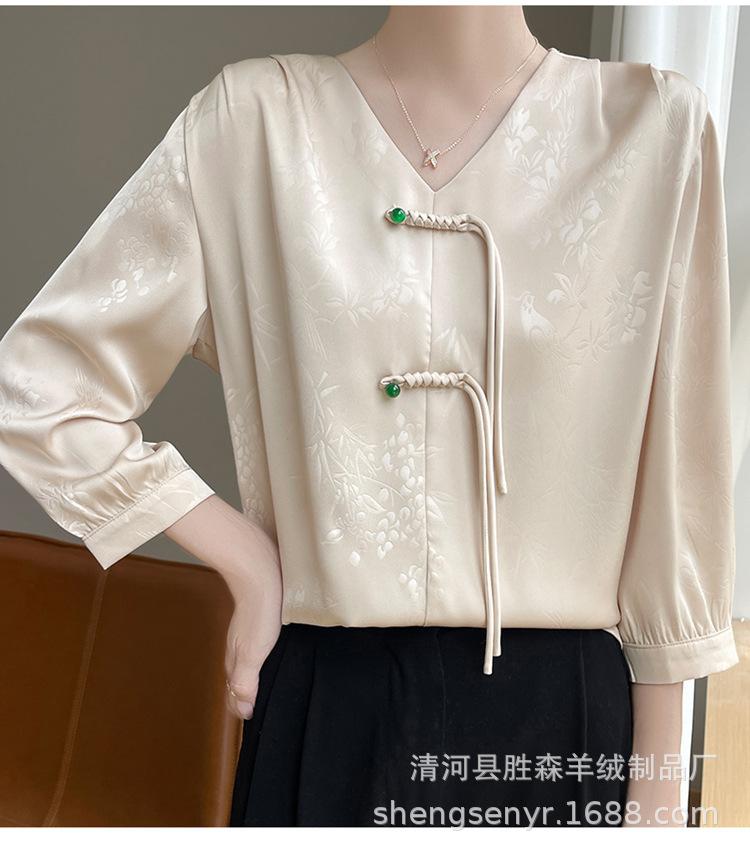 Compra 2024 Verano Nuevo Estilo Chino Estilo Nacional Cuello en V Botón Camisa Jacquard Manga Siete Puntos Suelta Combinable Top para Mujer al por mayor en Joom.pro