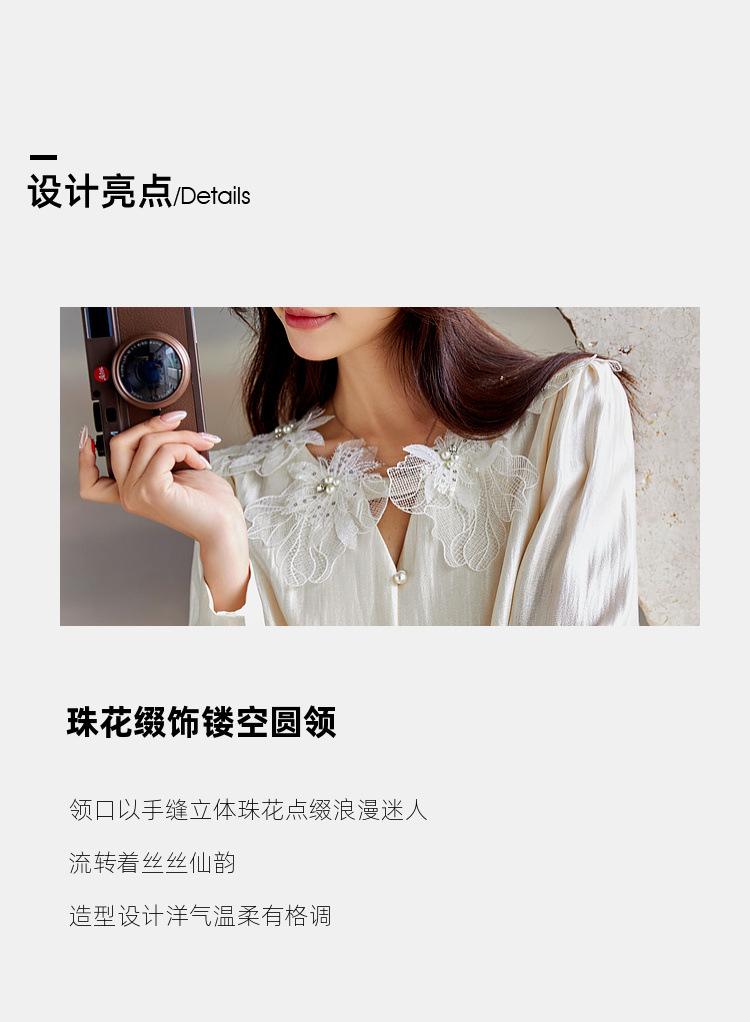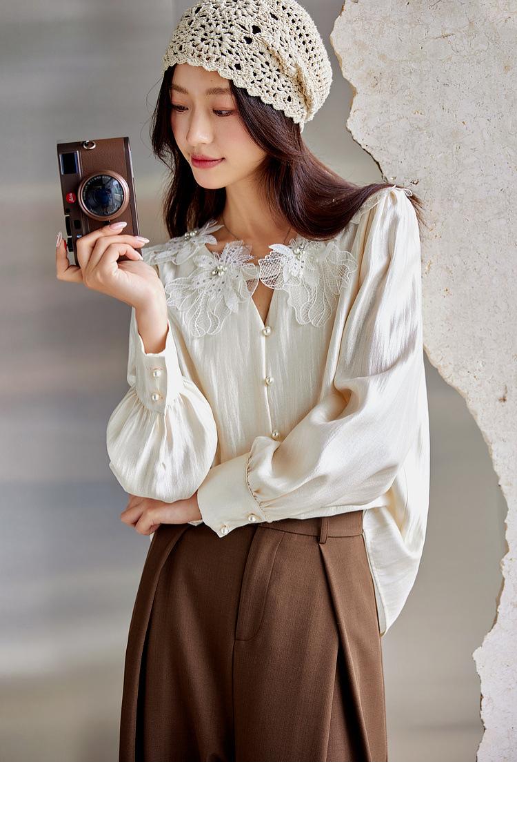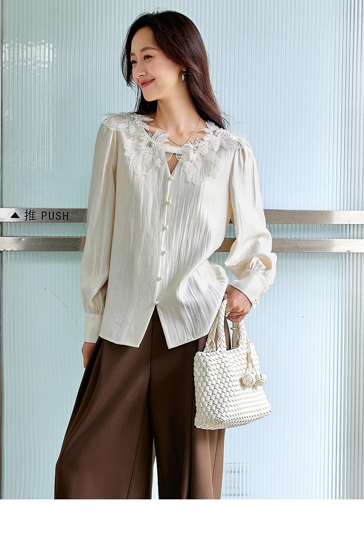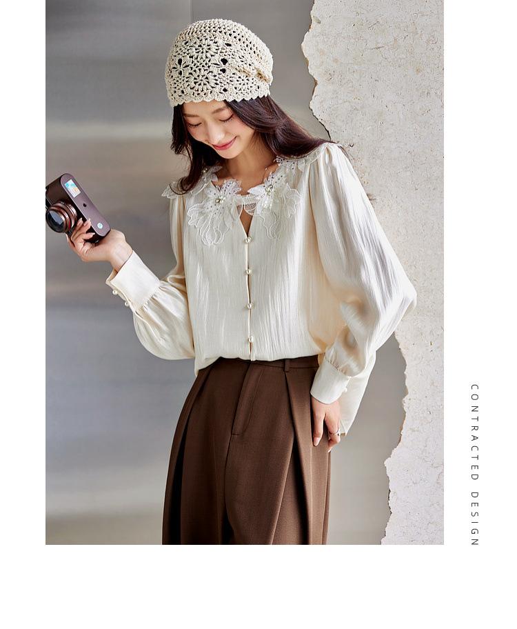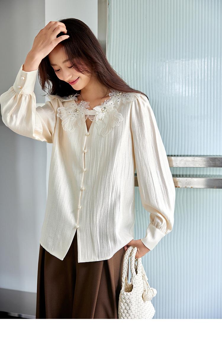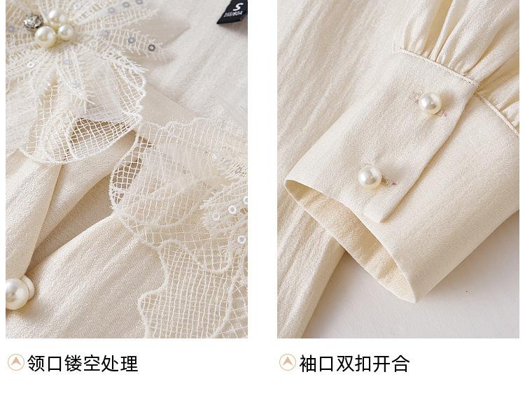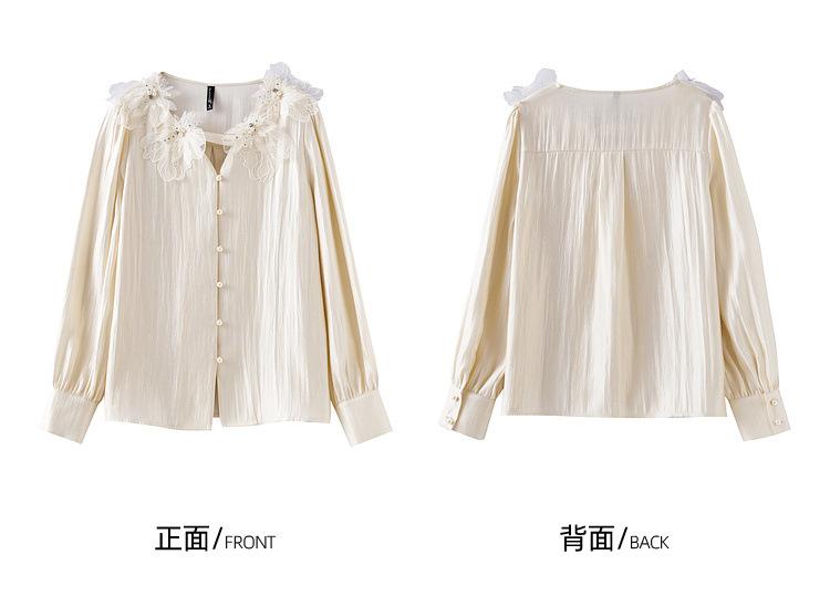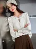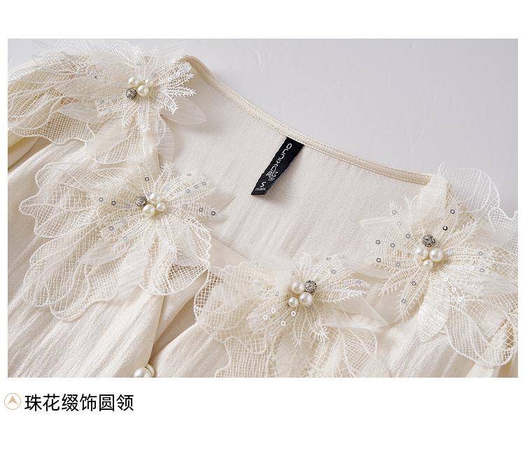 Zhenxi Nuevo Nicho Heavy-Duty Decoración de Flores de Perlas Camiseta de Cuello Redondo de Manga Larga para Mujer Top de Moda con Temperamento SQ972