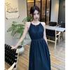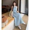 Vestido azul francés con tirantes halter para mujer verano nuevo estilo vacacional junto al mar sin mangas playa vestido largo a la moda