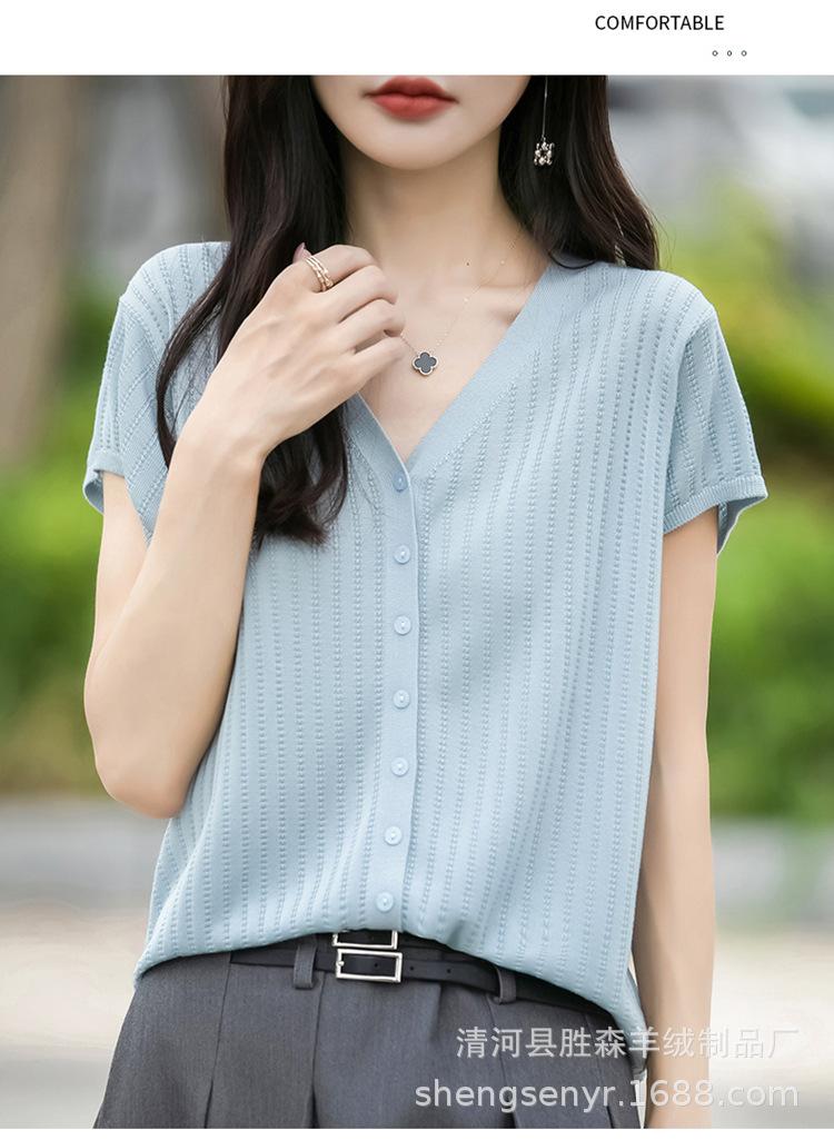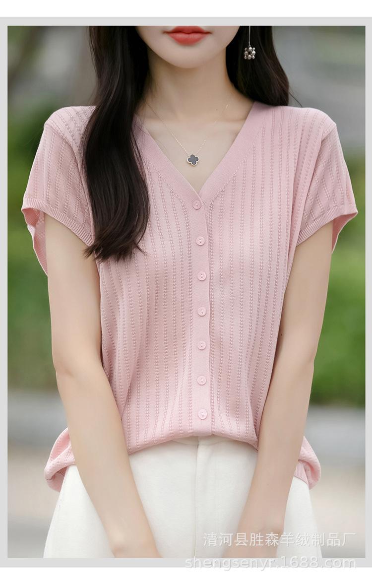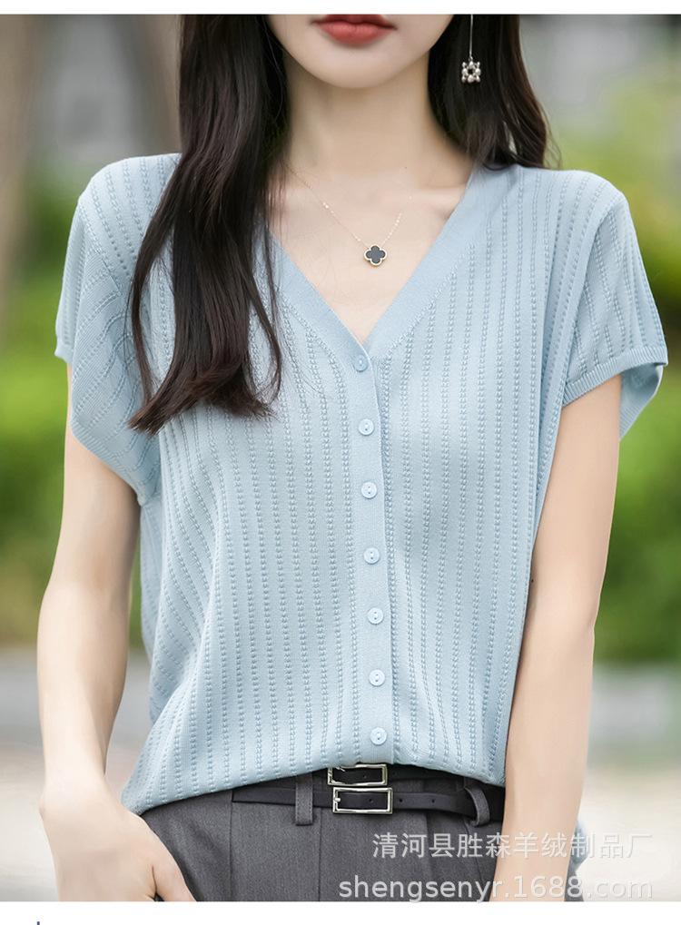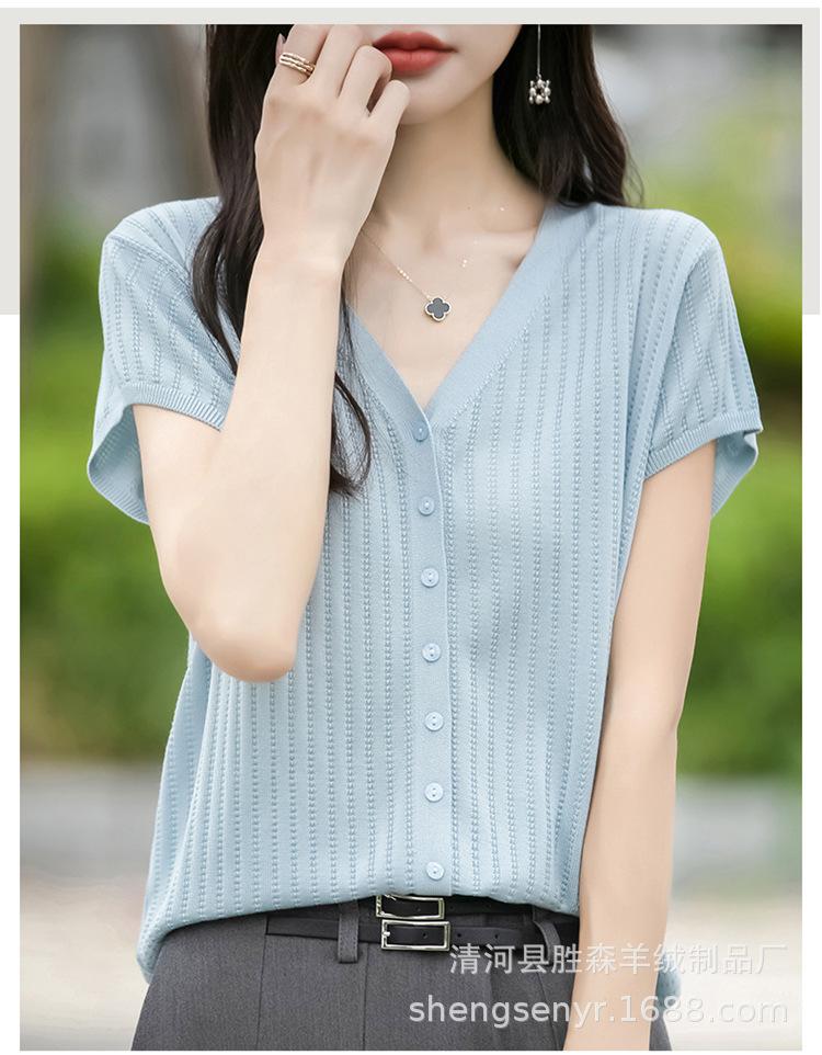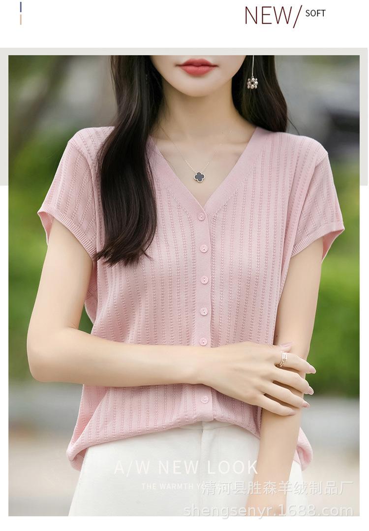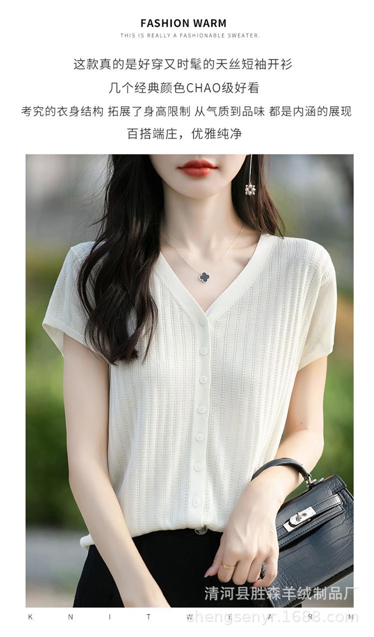 24 Verano Nueva Moda Tencel Lyocell Cárdigan de Punto con Cuello en V para Mujer Manga Corta Color Sólido Suelto Combinable Top