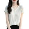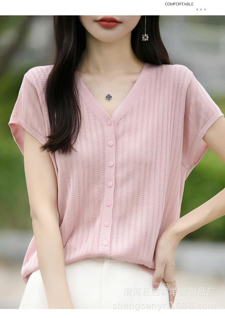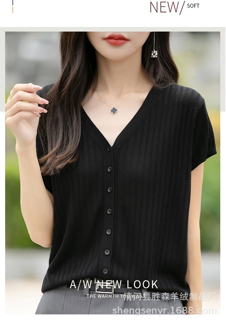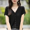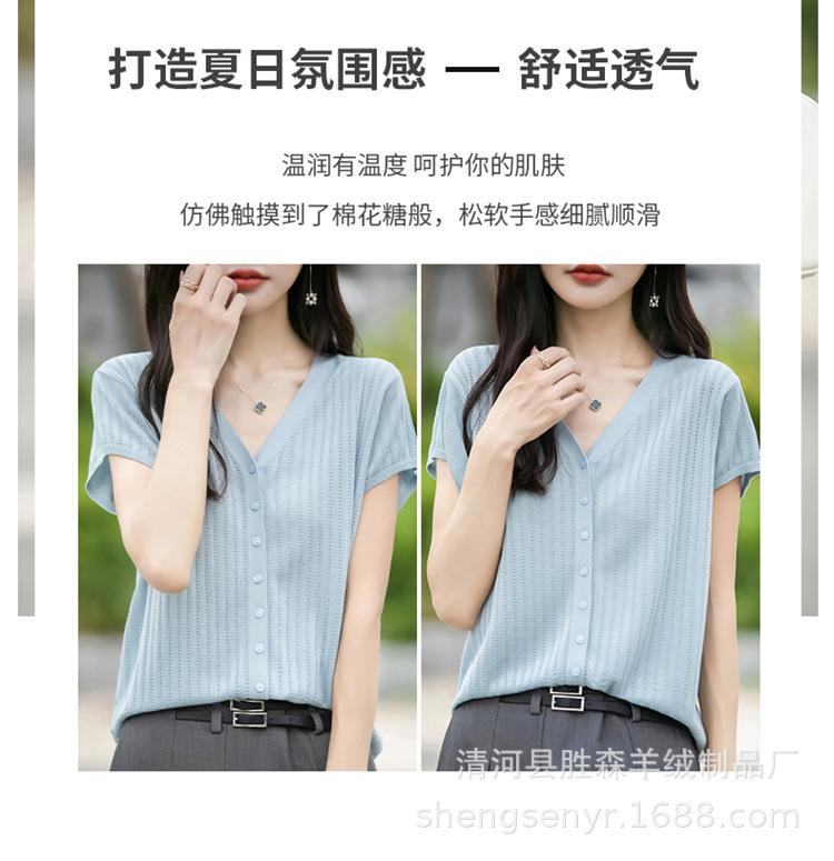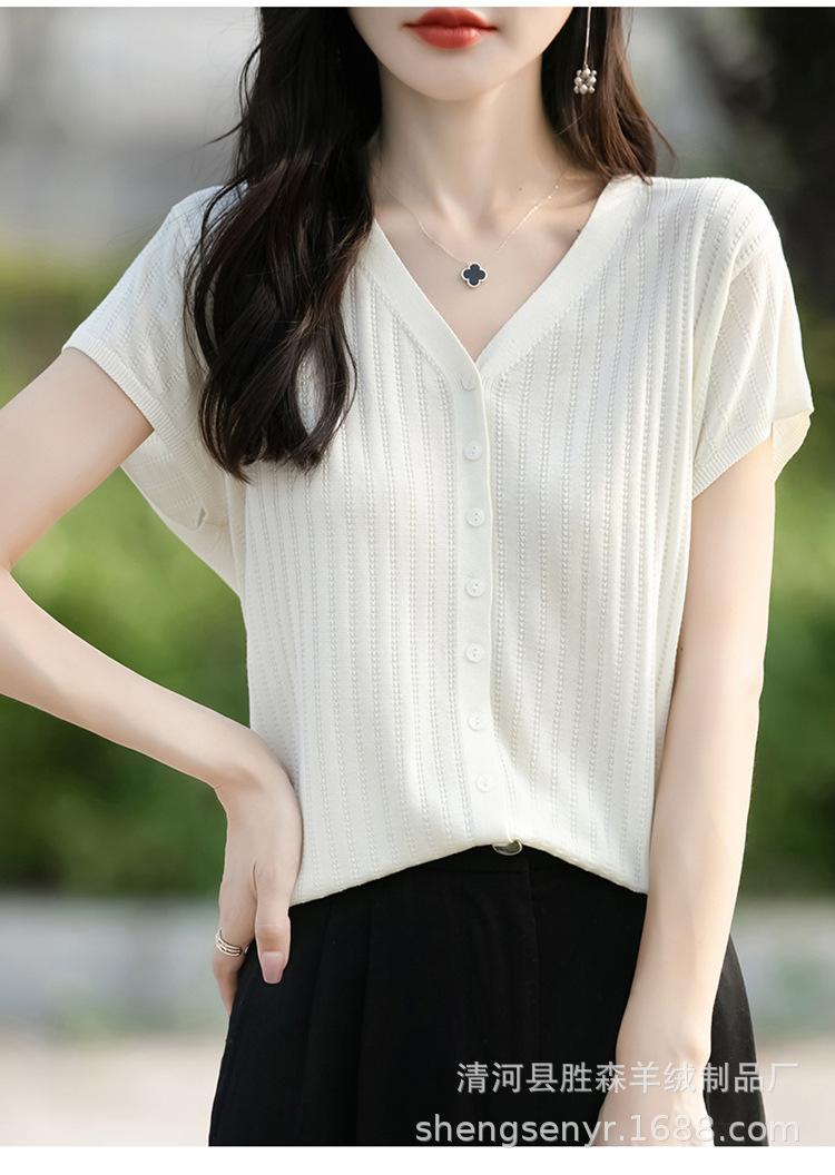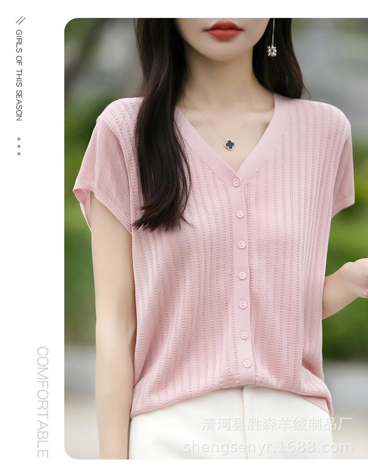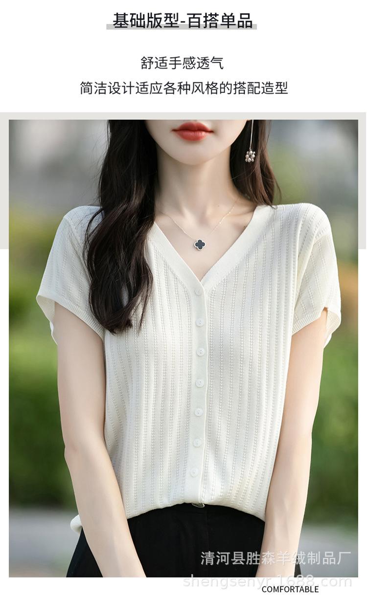 24 Verano Nueva Moda Tencel Lyocell Cárdigan de Punto con Cuello en V para Mujer Manga Corta Color Sólido Suelto Combinable Top