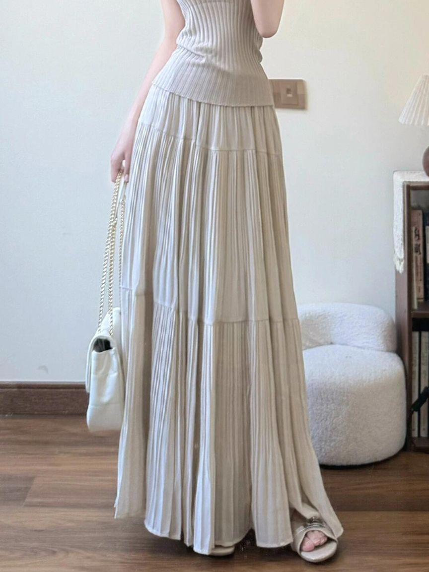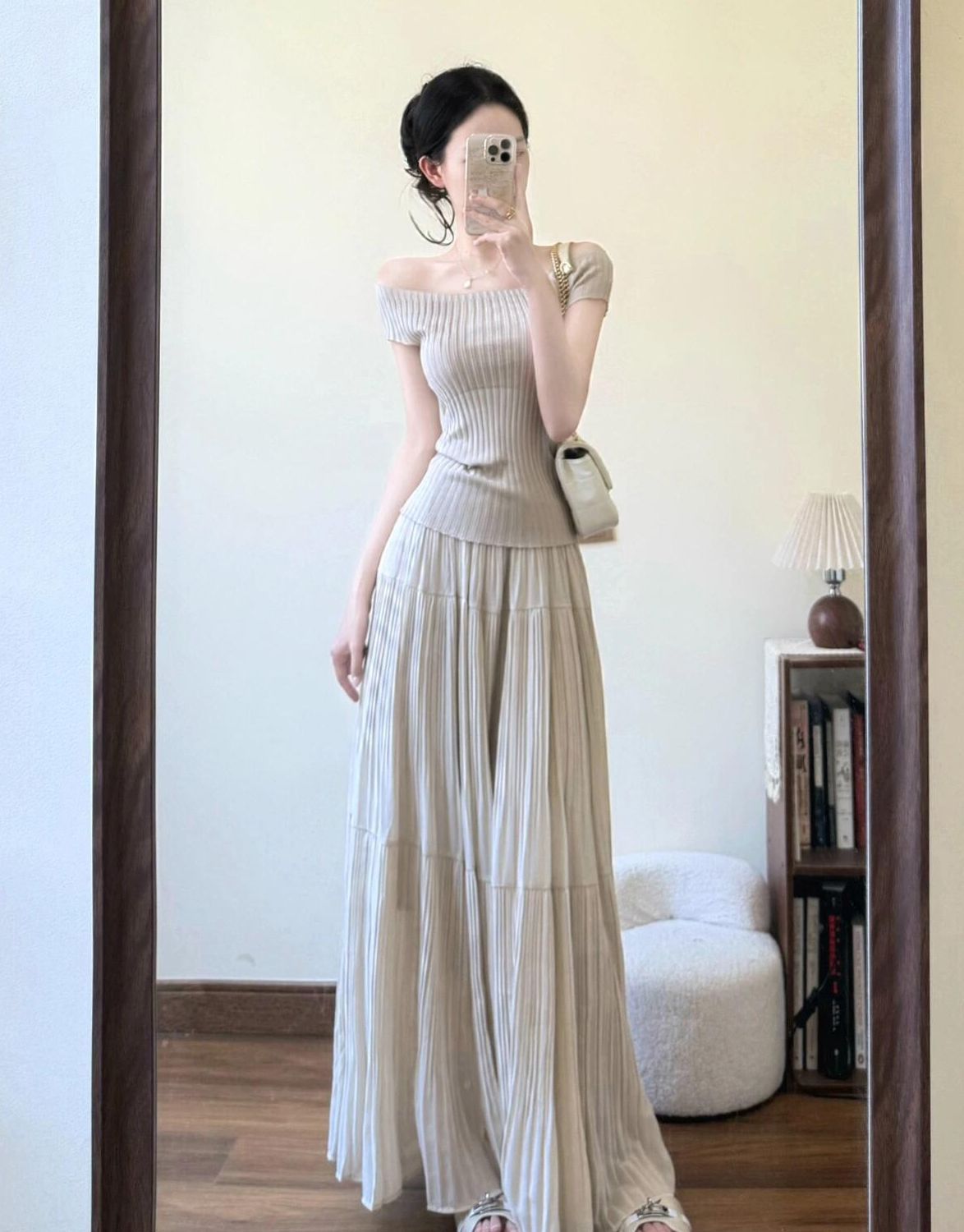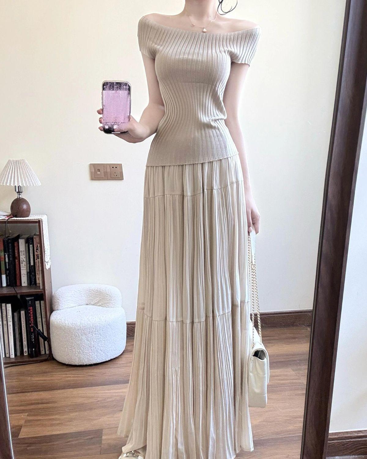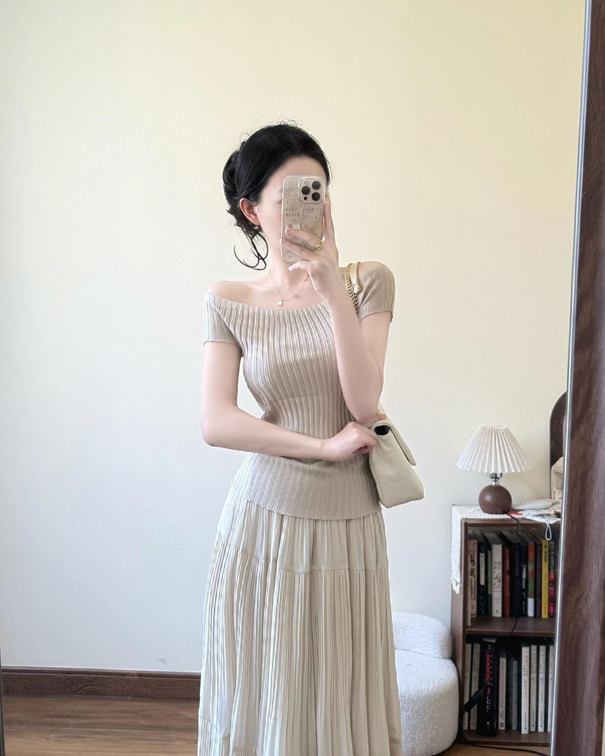Off-the-shoulder knit top, apricot pleated midi skirt, Top + 5028 Apricot Midi Skirt