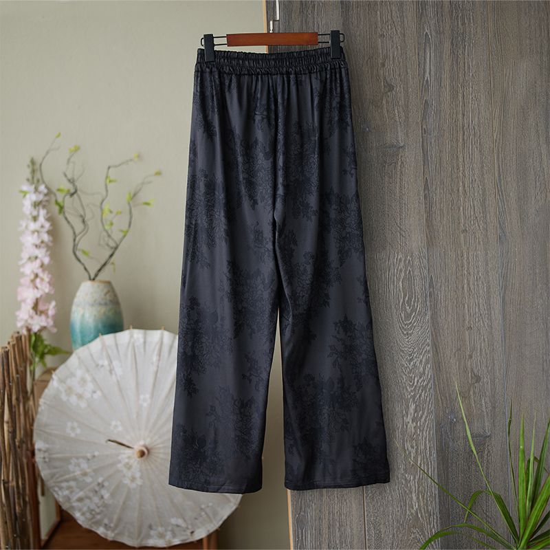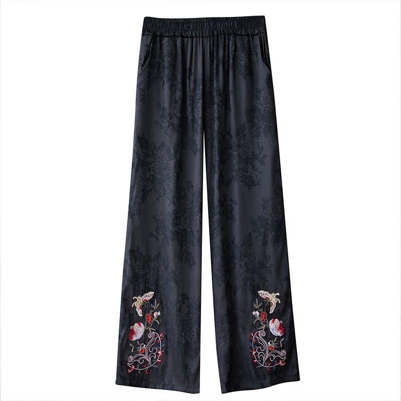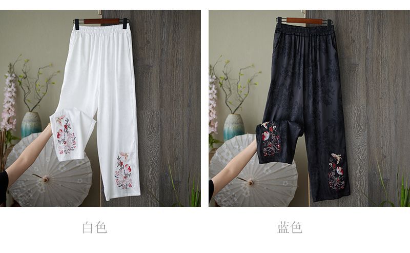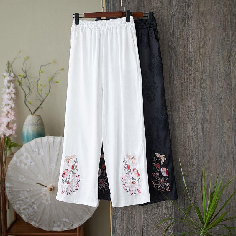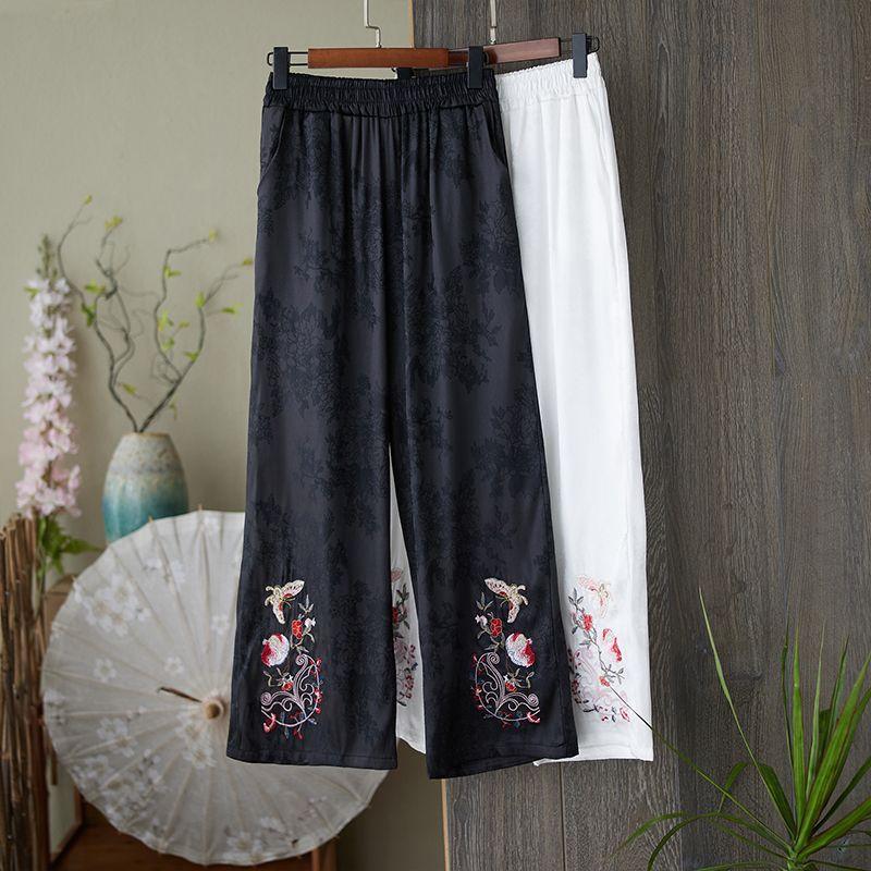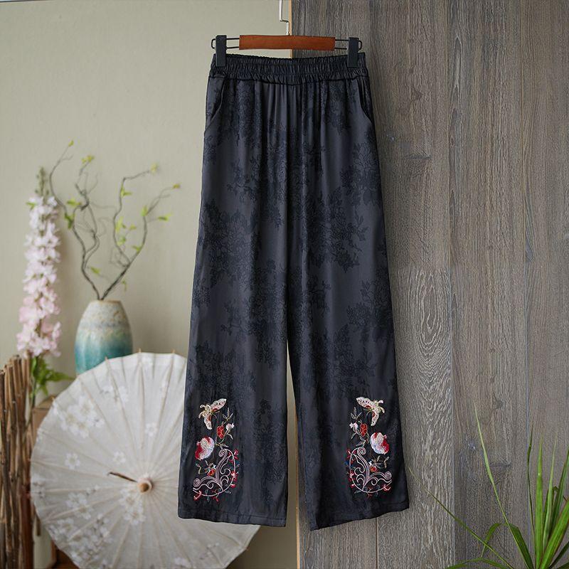 Verano 2025 Nuevo Pantalones Casuales Retro Pantalones de Pierna Recta Sueltos Algodón Lino Adelgazantes Bordado Pantalones de Pierna Ancha Cintura Elástica Ropa de Mujer