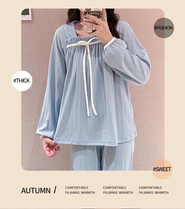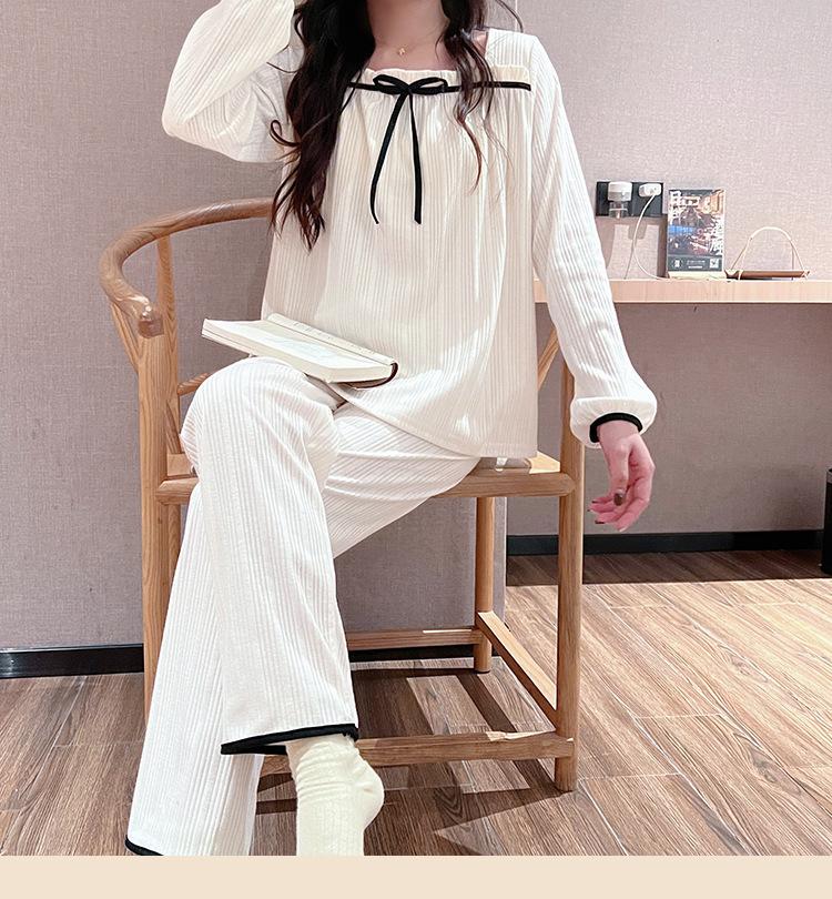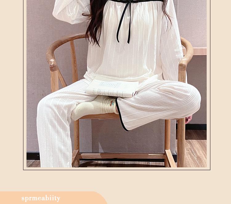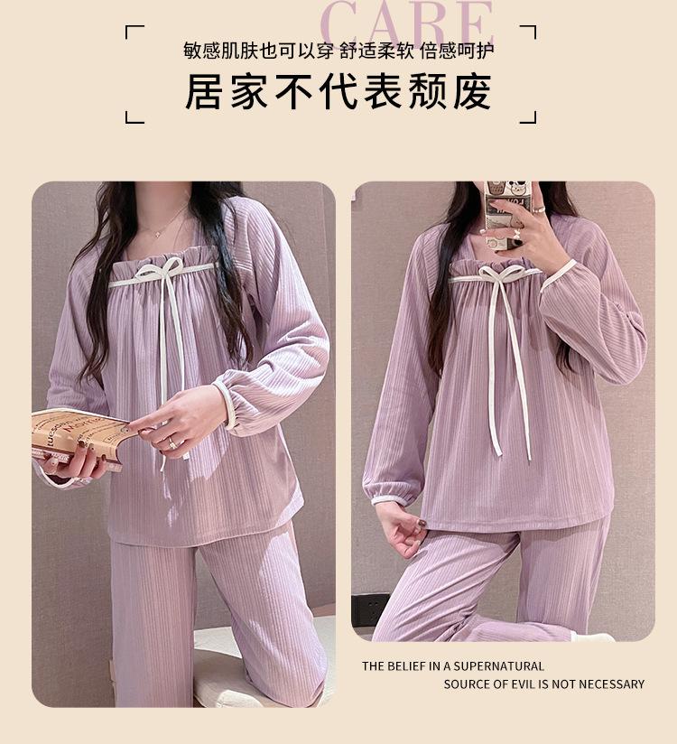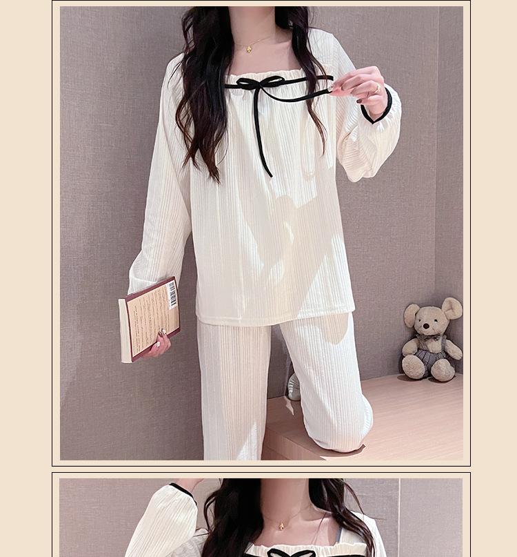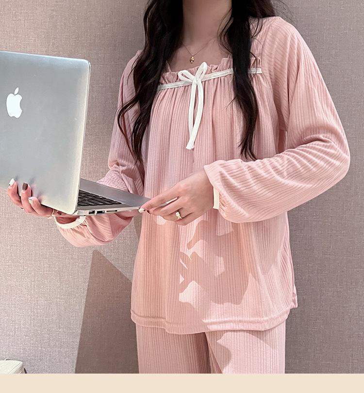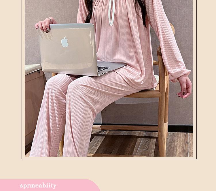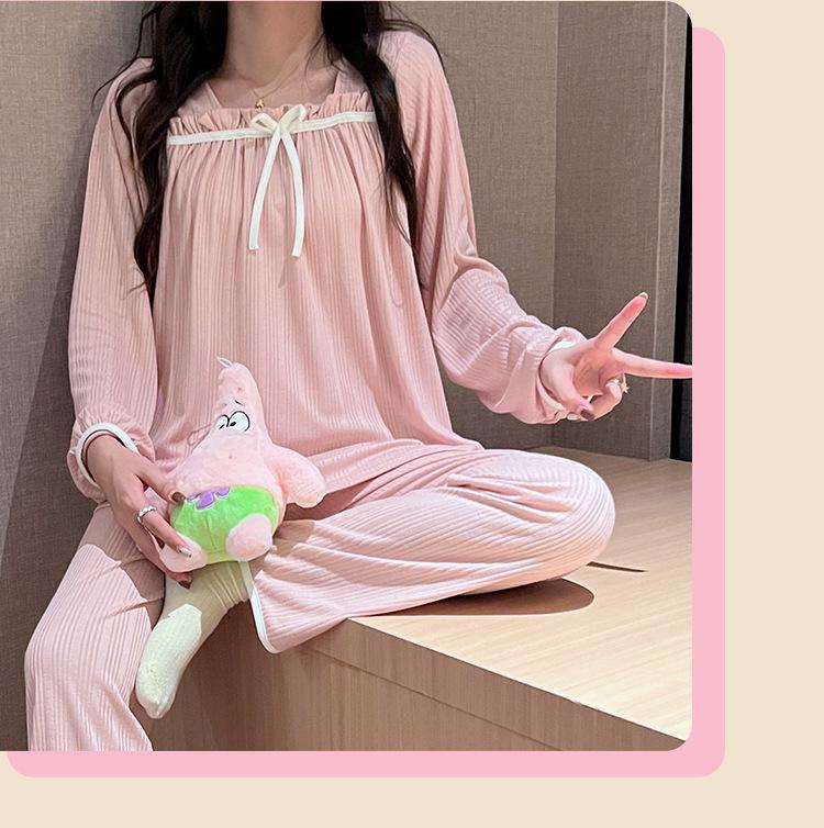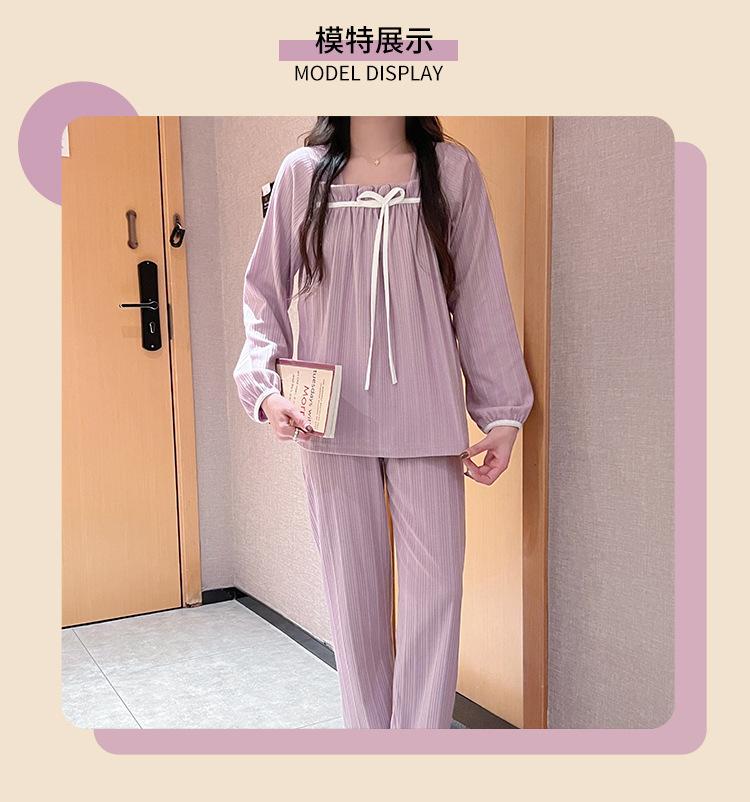 Pijama de Manga Larga con Hombro Descubierto de Seda de Leche con Rayas Pit para Primavera y Otoño para Mujer, Lazo Dulce, Ropa de Casa, Lote de Fábrica