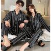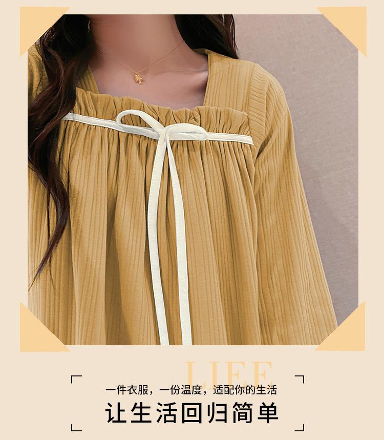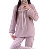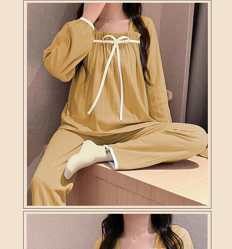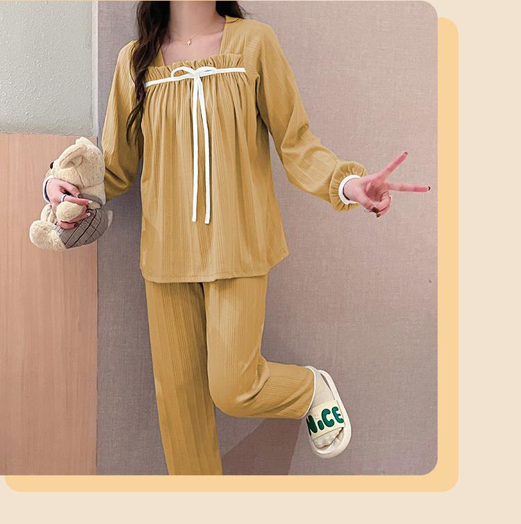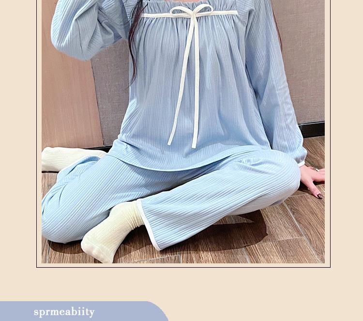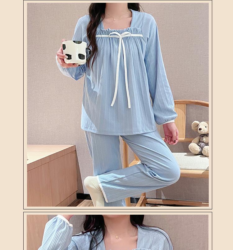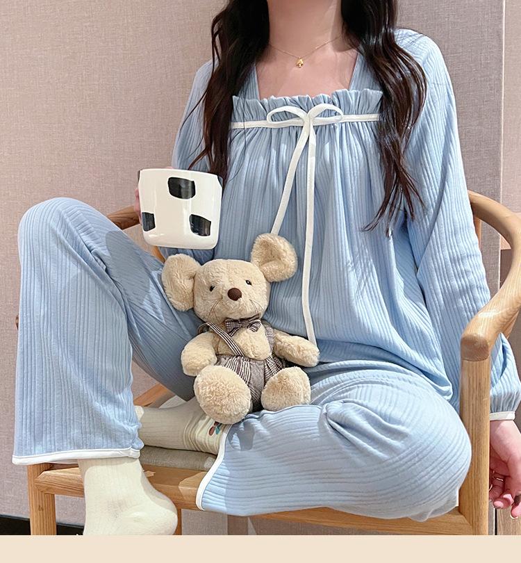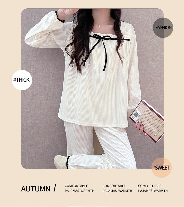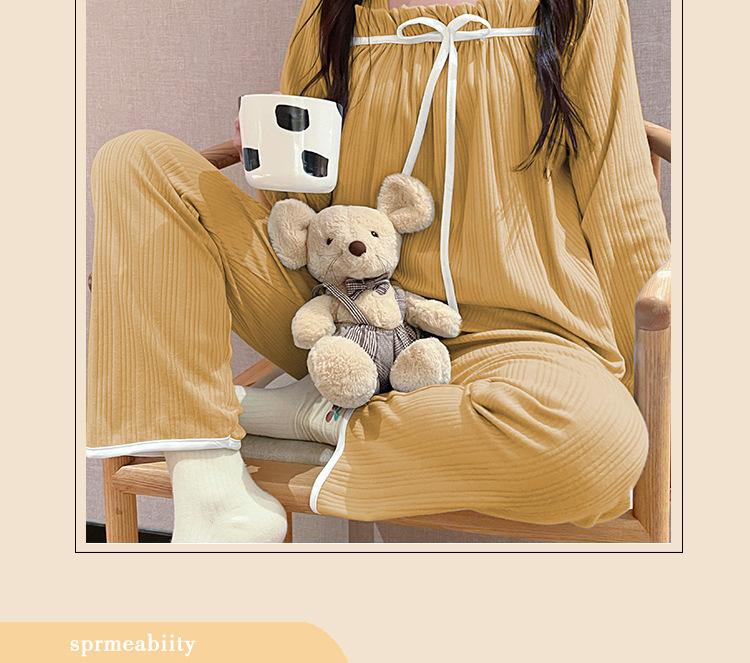 Pijama de Manga Larga con Hombro Descubierto de Seda de Leche con Rayas Pit para Primavera y Otoño para Mujer, Lazo Dulce, Ropa de Casa, Lote de Fábrica