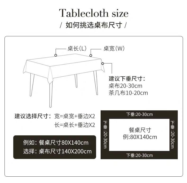 Recomendaciones para el tamaño del mantel: Generalmente, recomendamos que los manteles tengan una caída de 30 cm y las mesas de centro de 20 cm por lado. Las mesas suelen tener cuatro lados, así que si tienen una caída, se deben añadir 60 cm al largo y al ancho. Lo mismo ocurre con las mesas de centro: se deben añadir 40 cm al largo y al ancho.