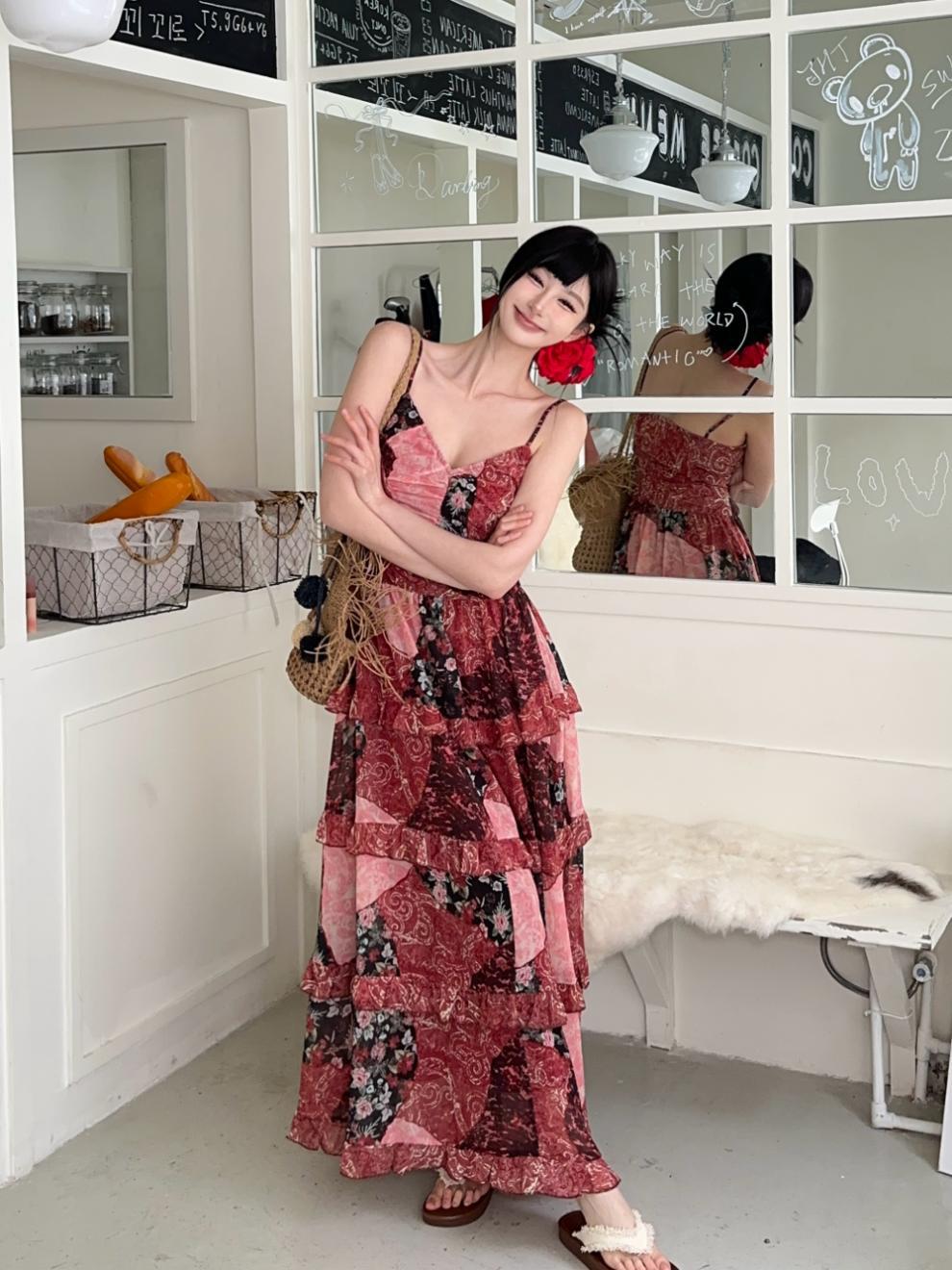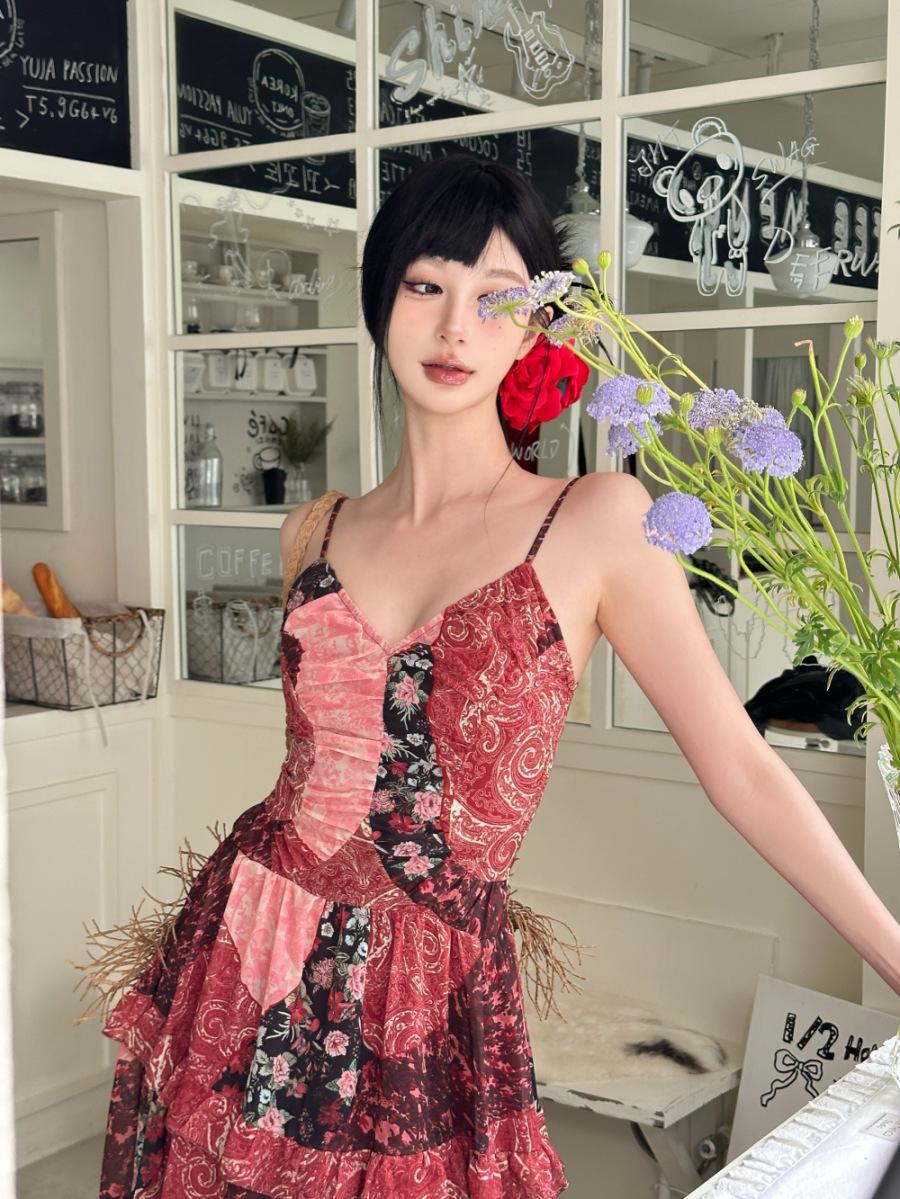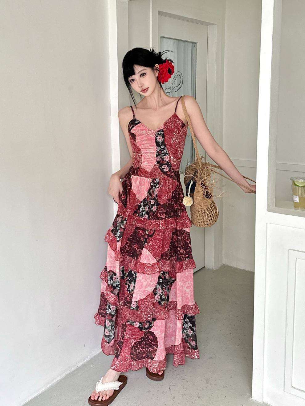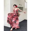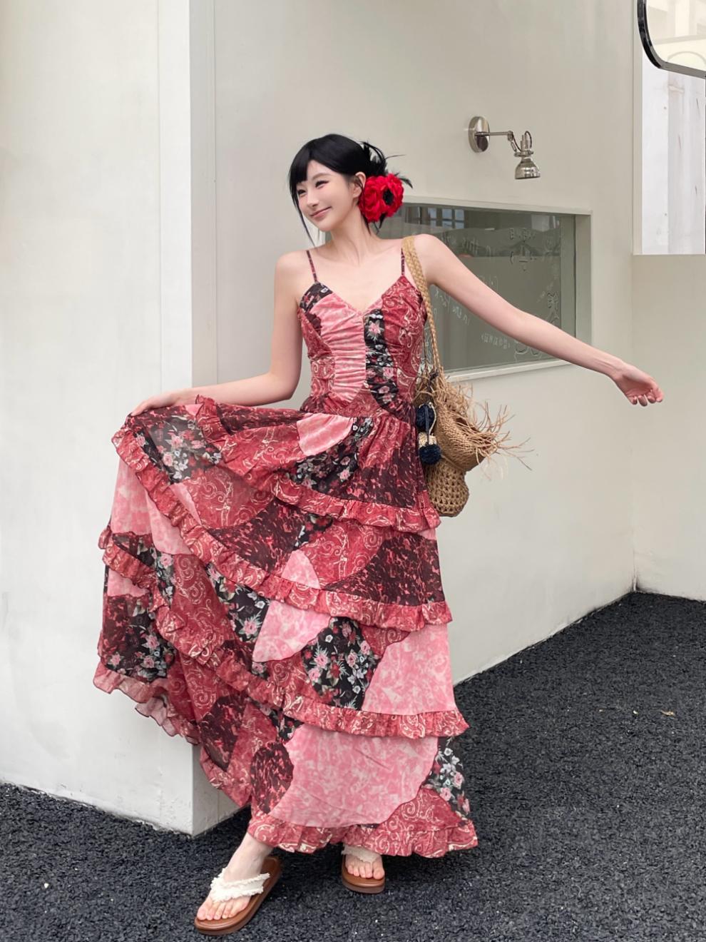 Foto real en stock Vacaciones francesas Junto al mar Encaje de industria pesada Vestido de tirantes floral Verano