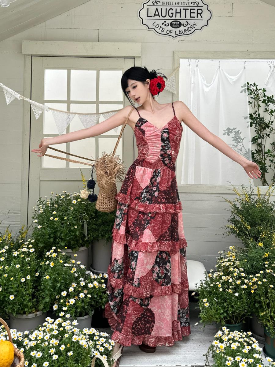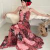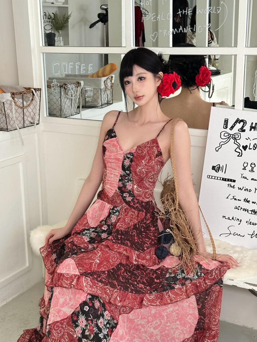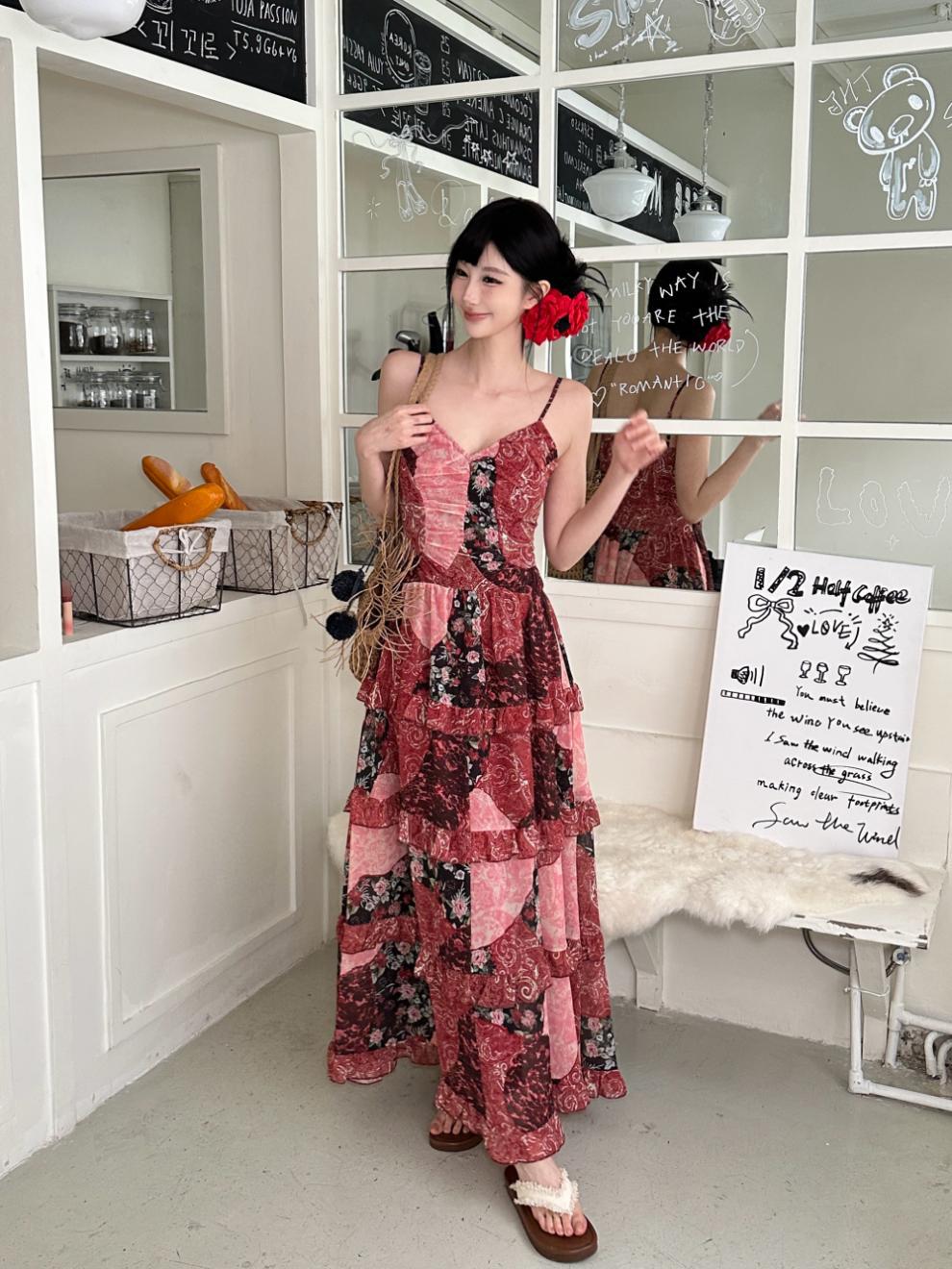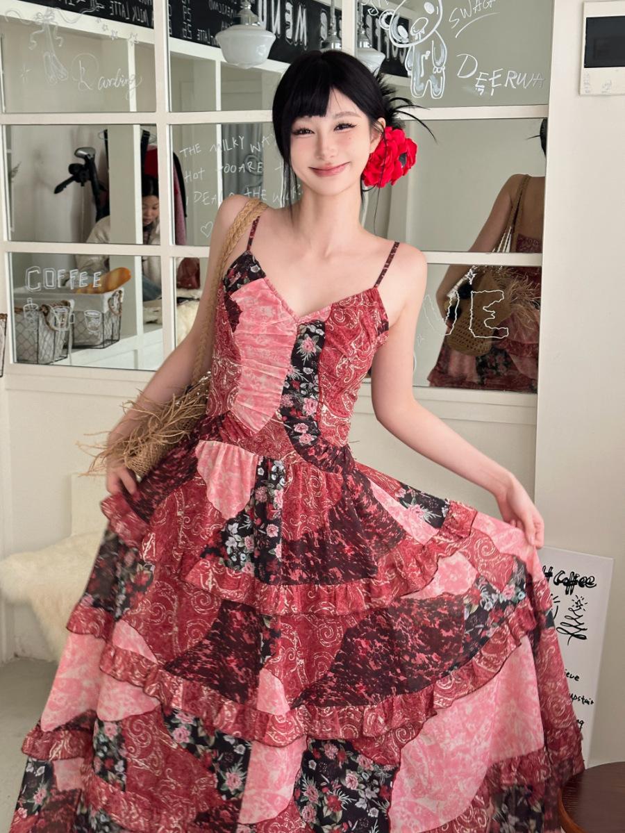 Foto real en stock Vacaciones francesas Junto al mar Encaje de industria pesada Vestido de tirantes floral Verano