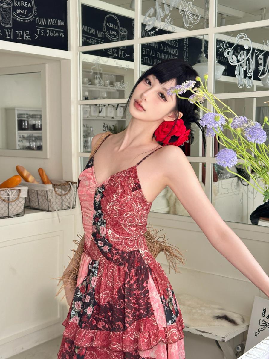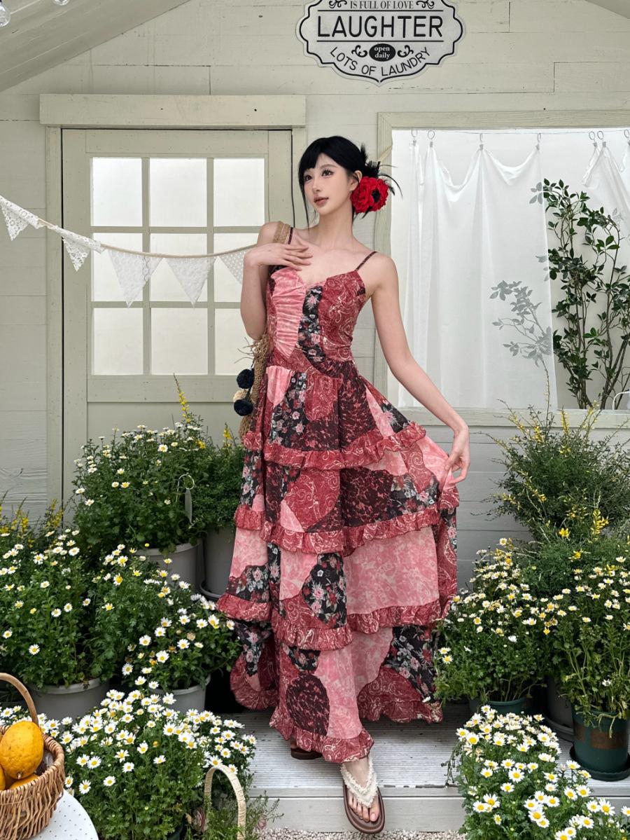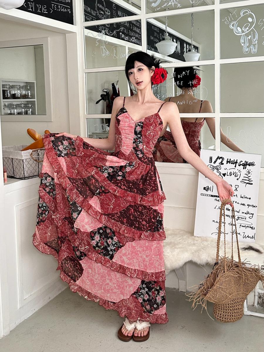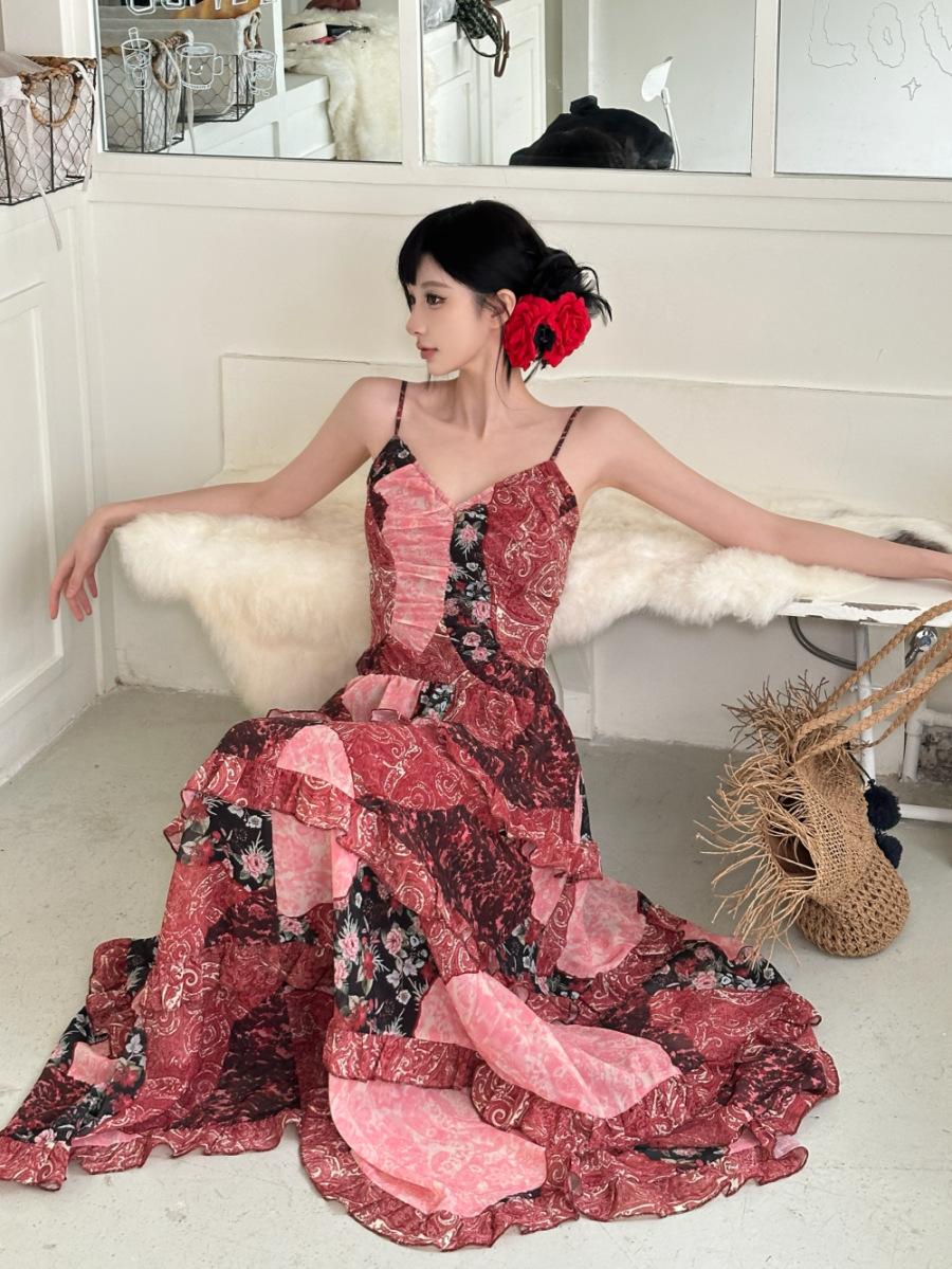 Foto real en stock Vacaciones francesas Junto al mar Encaje de industria pesada Vestido de tirantes floral Verano