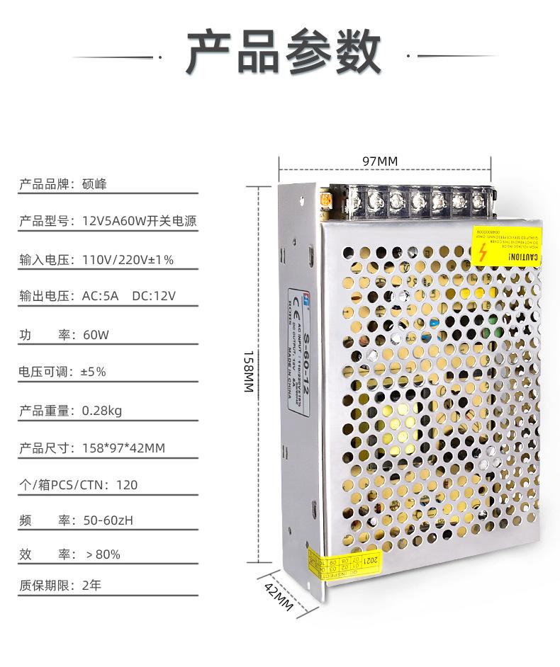 | Fuente de alimentación conmutada 12V5A (S-60-12 grande) | 110 V/220 V | 12 V | 5A | 60 W | 0,28 kg | 158*97*42MM | 60 | https://detail.1688.com/offer/649643934392.html?spm=a2615.7691456.autotrace-offerGeneral.37.49e99f0bo9KaF2 |