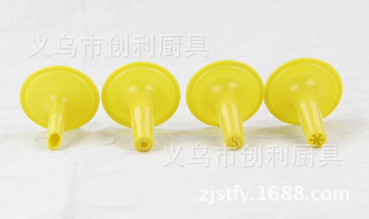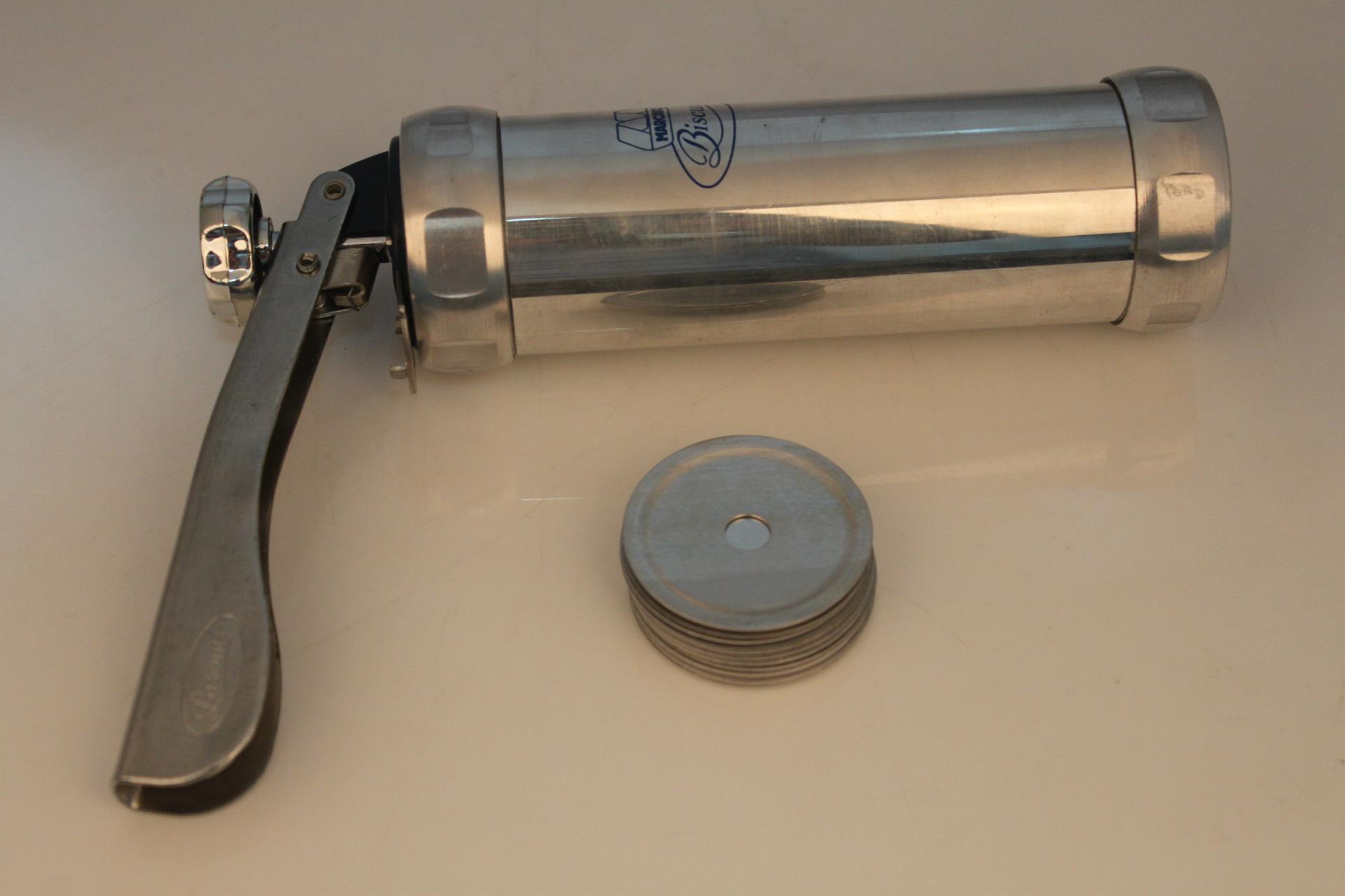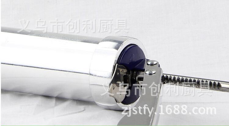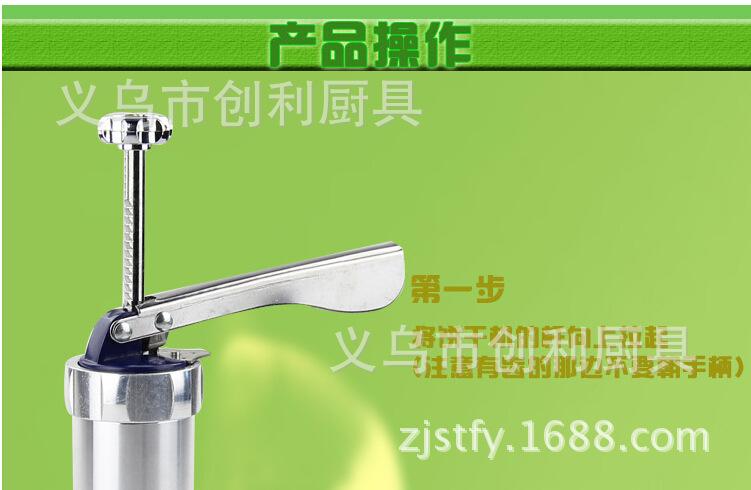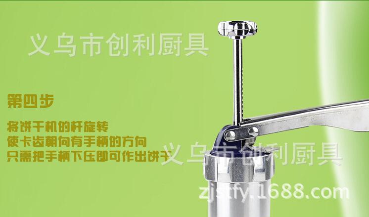 Pequeño complemento: Al usarla como máquina para galletas, cada vez que se presiona el mango, se produce un producto terminado, pudiendo producirse hasta 12. El control mecánico garantiza que los productos terminados tengan el mismo tamaño y grosor. Al usarla como pistola decoradora, presione el botón en la parte frontal del mango y utilice la varilla superior para operarla. Podrá controlar la cantidad de extrusión usted mismo.