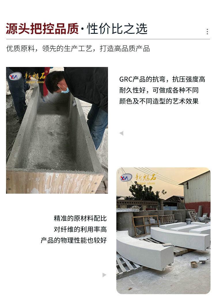 6. Fuerte plasticidad:El material GFRC es expresivo y puede presentar formas decorativas de diferentes estilos. El diseño de asientos para plazas comerciales es adecuado para jardines o varios otros lugares. Se forma a través de moldes sin decoración secundaria, mostrando directamente su apariencia natural. Su durabilidad y características decorativas pueden aportar un efecto decorativo más duradero.