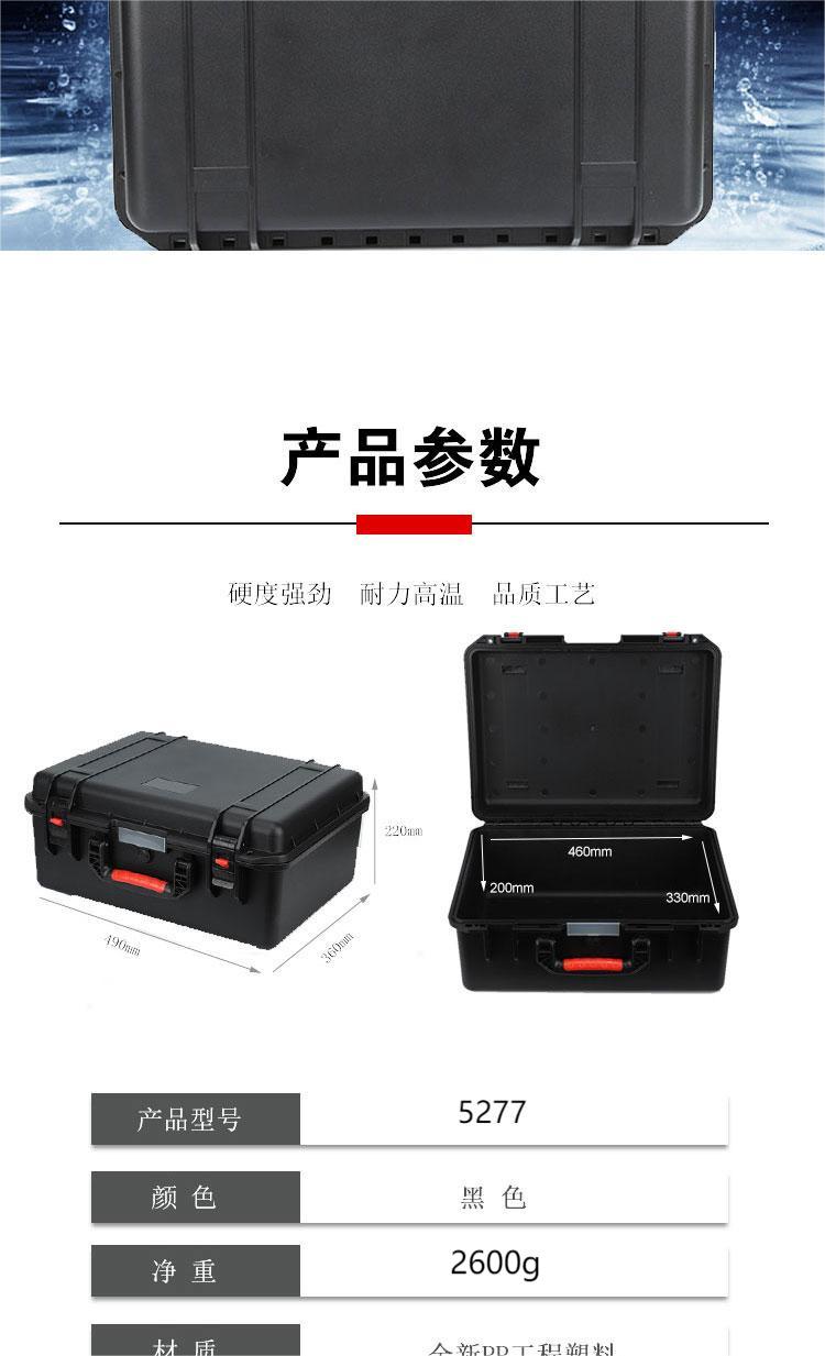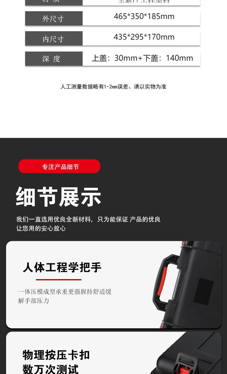 Outer size: 490*350*185mm inner size: 435*295*170mm upper cover 30mm + lower cover 140mm; black