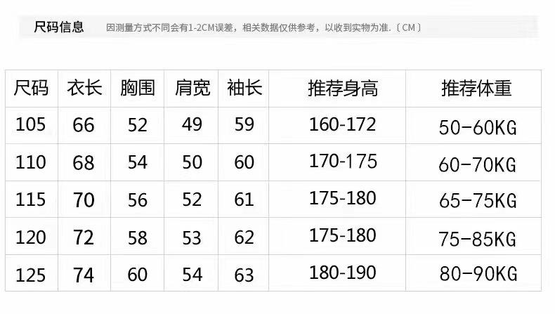 165/M, 170/L, 175/XL, 180/2XL, 185/3XL