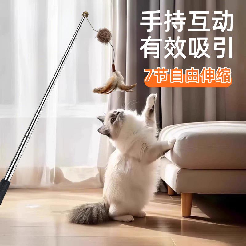 Varita Retráctil para Gato Mascota Teaser Varilla Larga Juguete para Gato Cabeza de Repuesto de Plumas Acero Inoxidable Gatito Gato Suministros para Mascotas