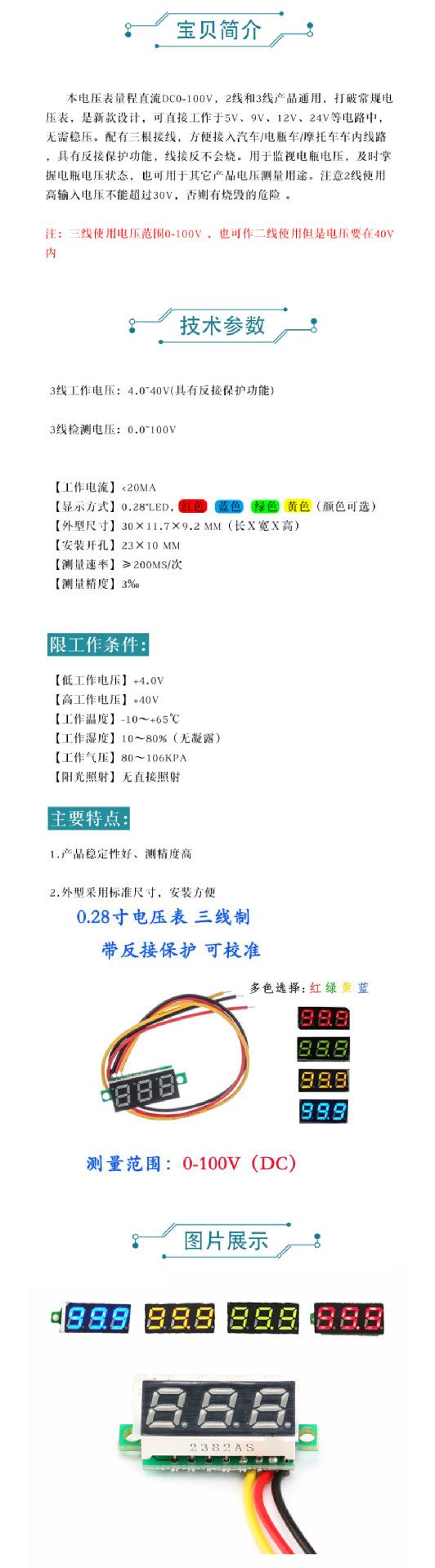 Voltímetro digital CC ultracompacto de 0.28 pulgadas, cabezal de pantalla digital, ajustable, tres hilos, CC 0-100V, voltímetro de batería