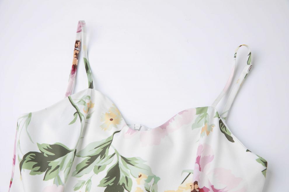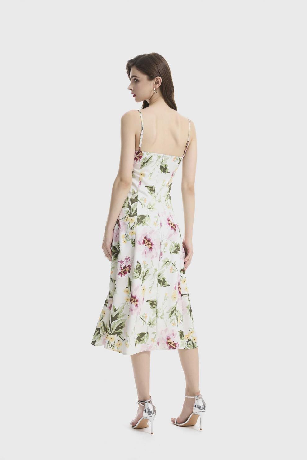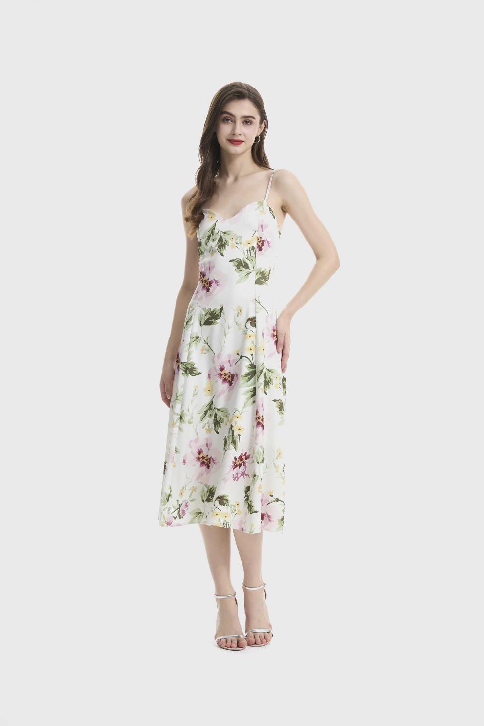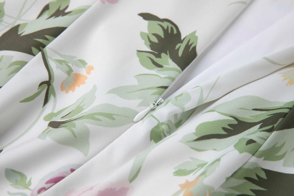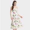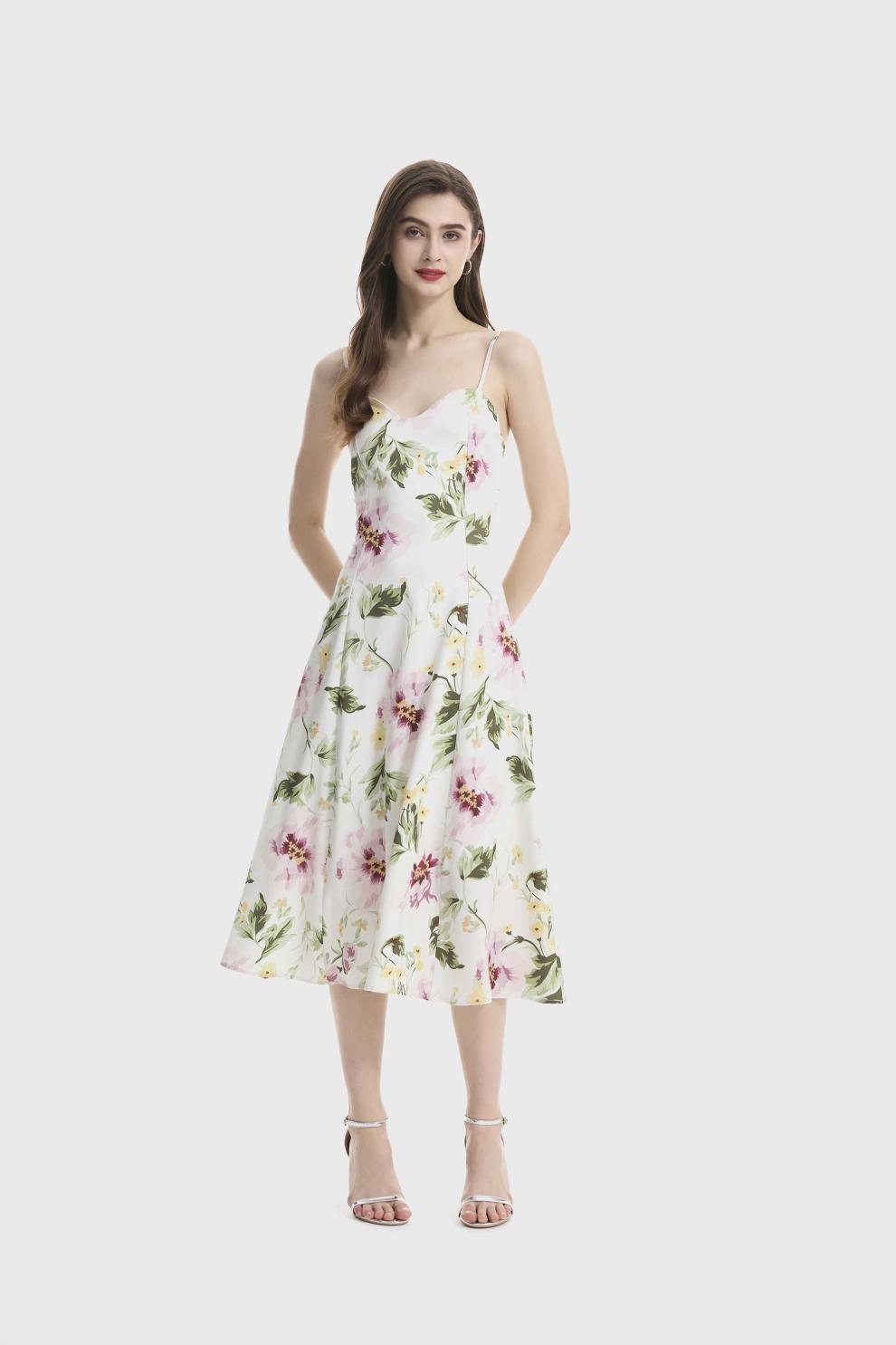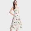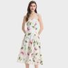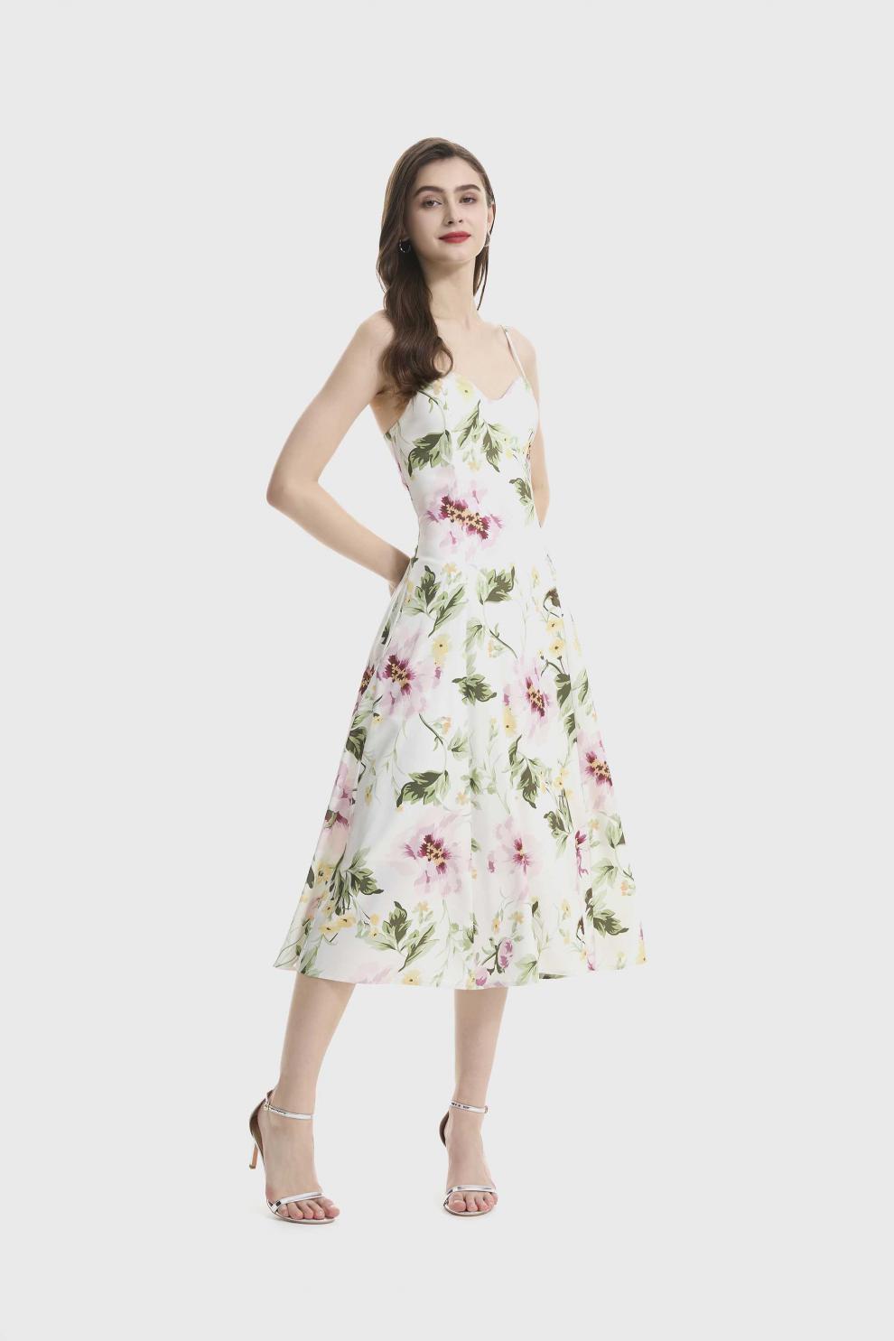 Foto real de elegante vestido retro floral sin mangas con tirantes, cintura alta y corte en A