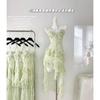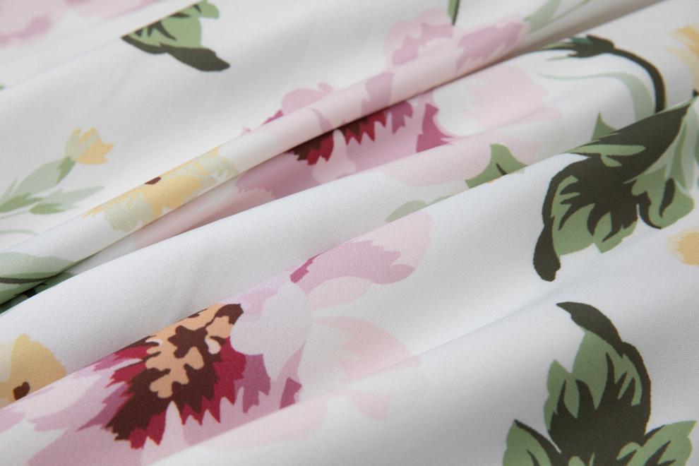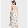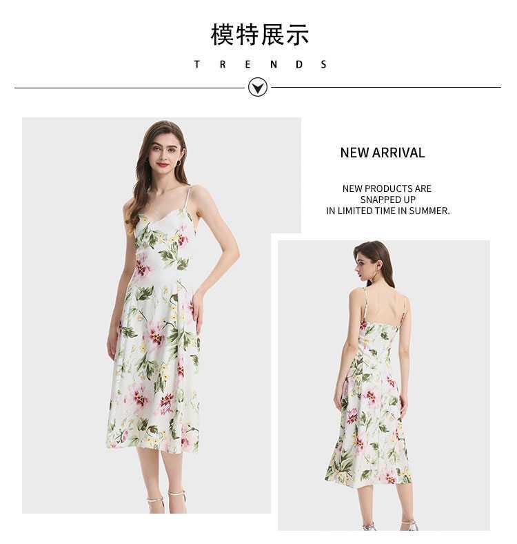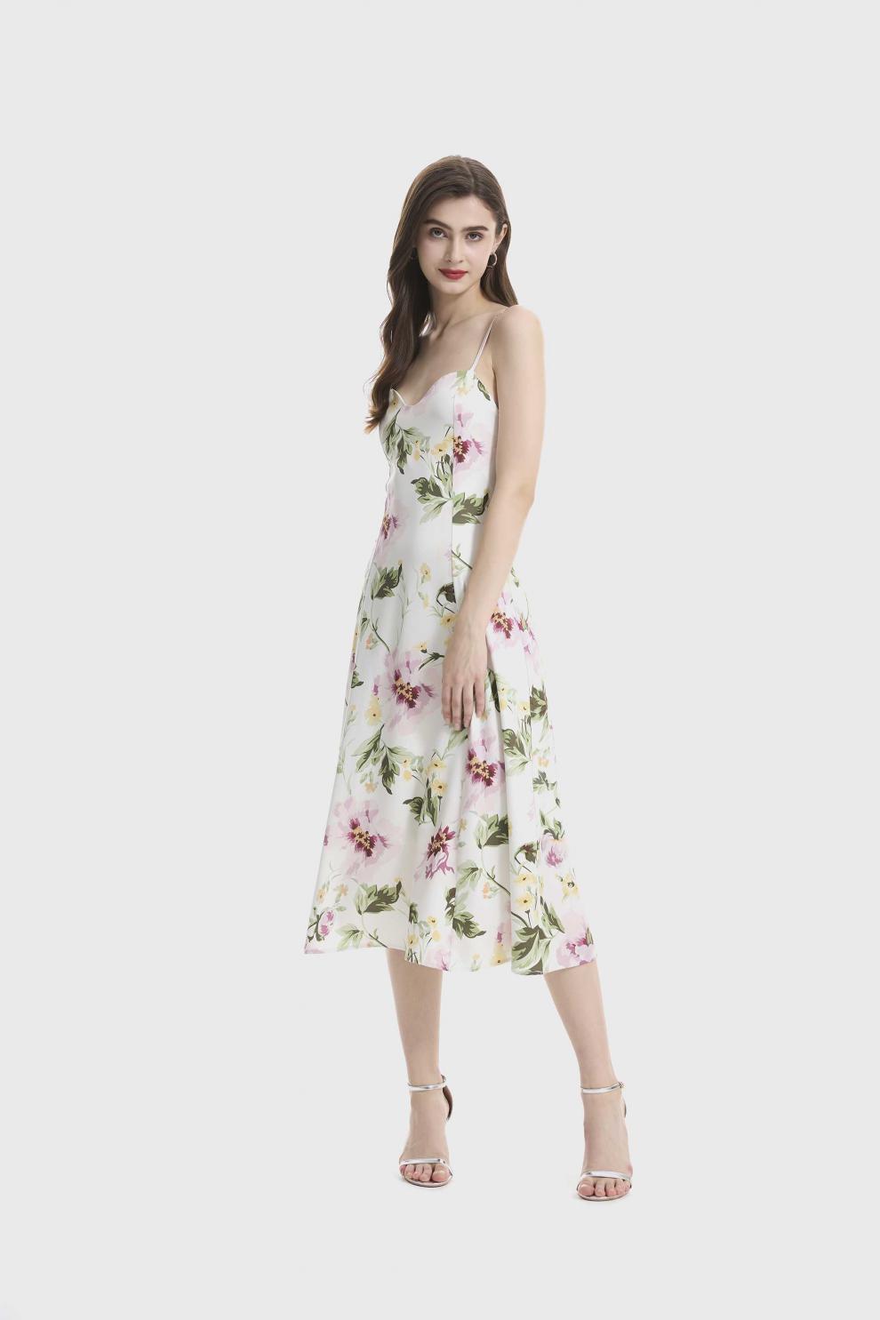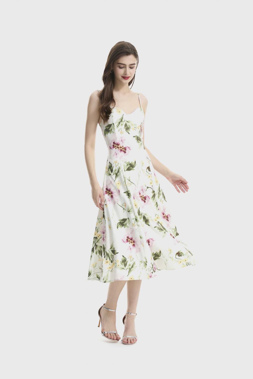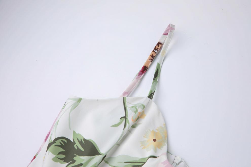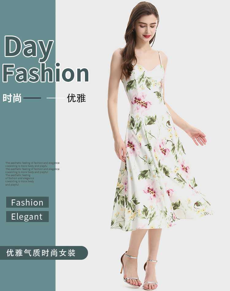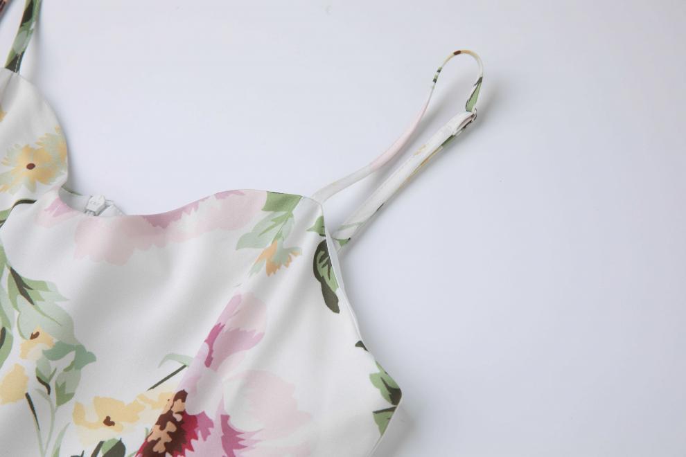 Foto real de elegante vestido retro floral sin mangas con tirantes, cintura alta y corte en A