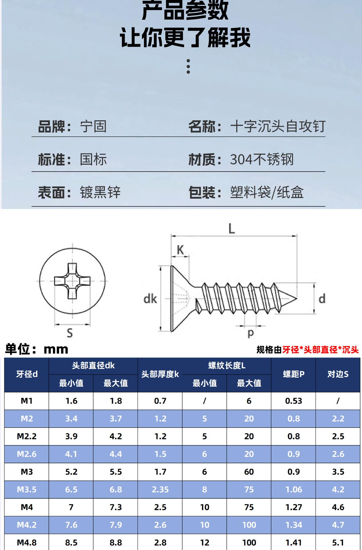 Acero Inoxidable 304 Zincado Negro Cabeza Avellanada Cruz Tornillos Autoperforantes Yb846 Tornillos Autoperforantes de Cabeza Plana Cruzada Negra M2-M6