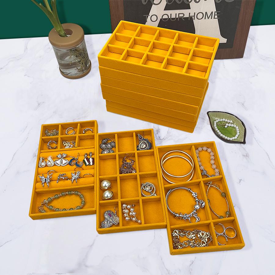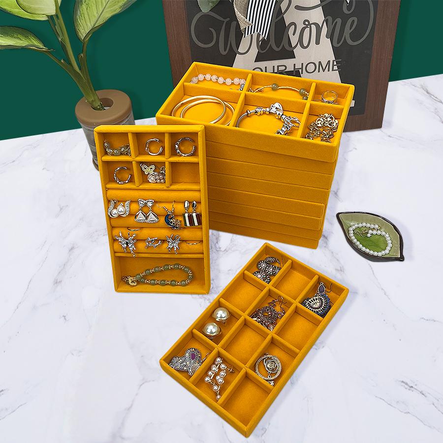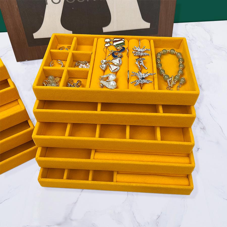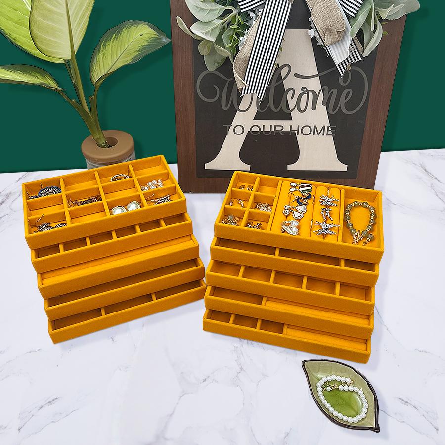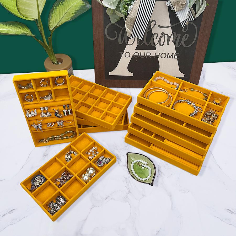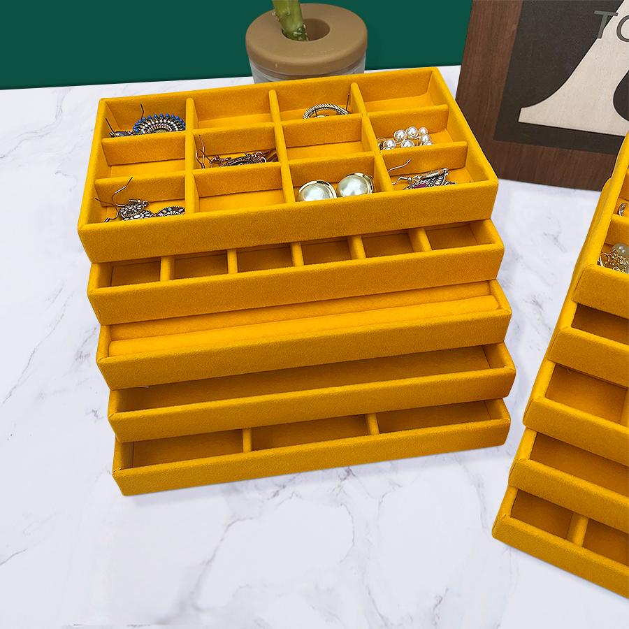 Bandeja pequeña de terciopelo amarillo de múltiples especificaciones, caja de almacenamiento de joyas con cajón, bandeja de exhibición de partición de collar y anillo de tocador
