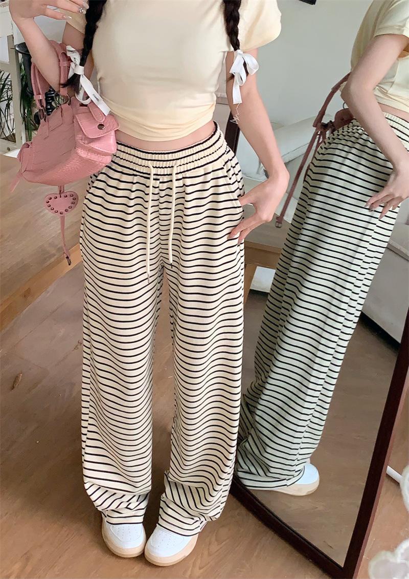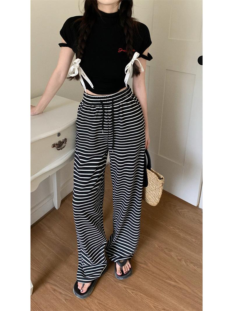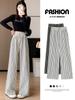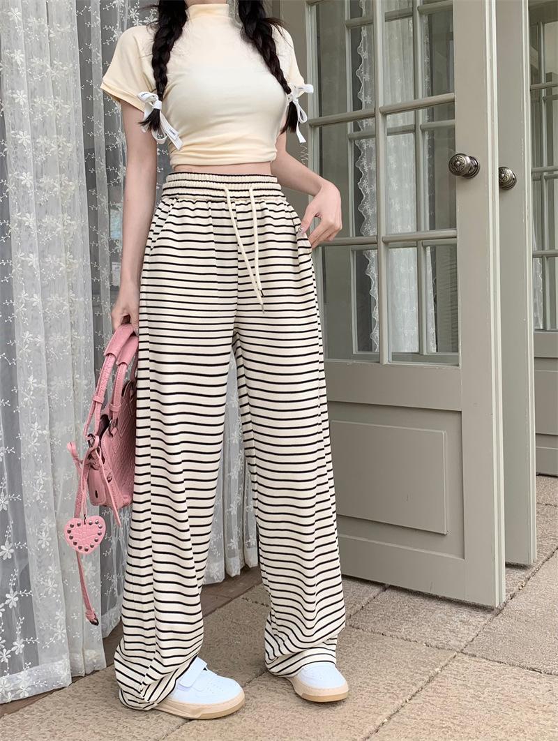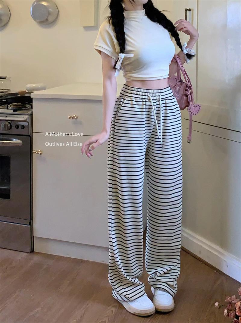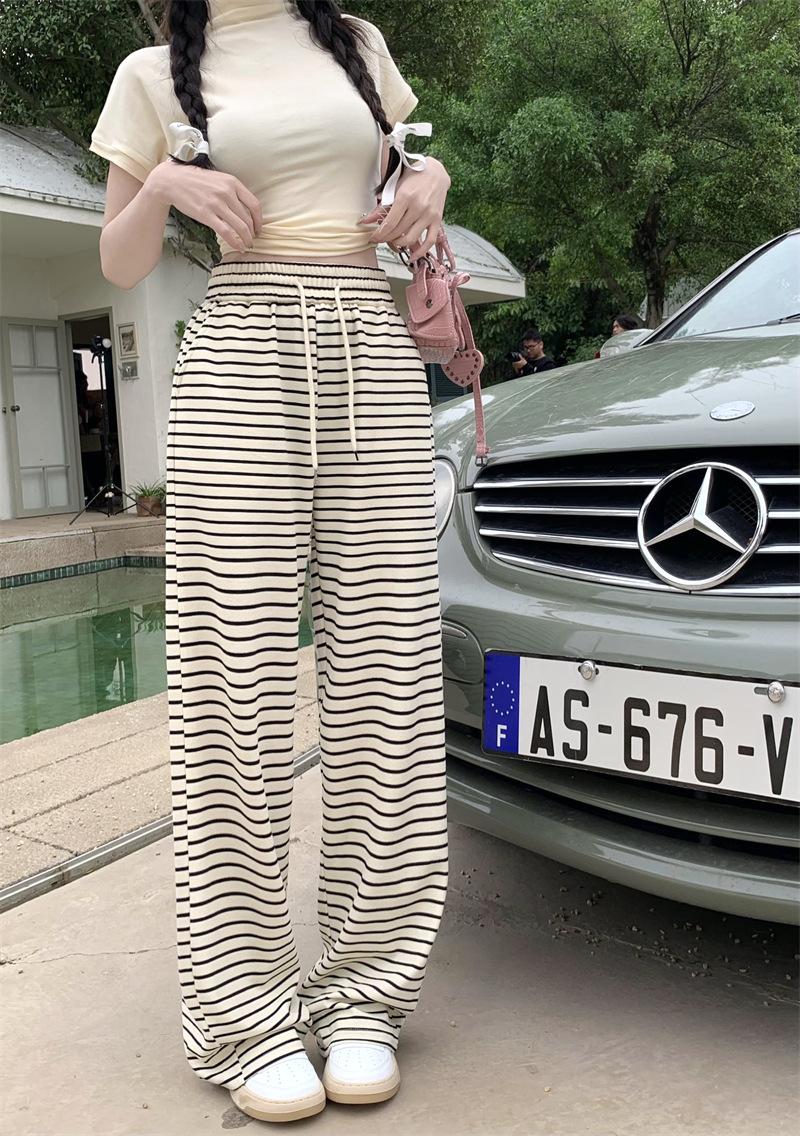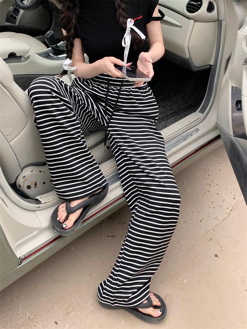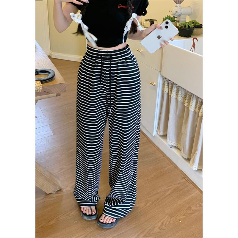 Pantalones casuales drapeados a rayas blancas y negras para mujer, otoño, pierna recta, pantalones largos, estilo holgazán, cintura elástica, sueltos, pierna ancha, pantalones para caminar