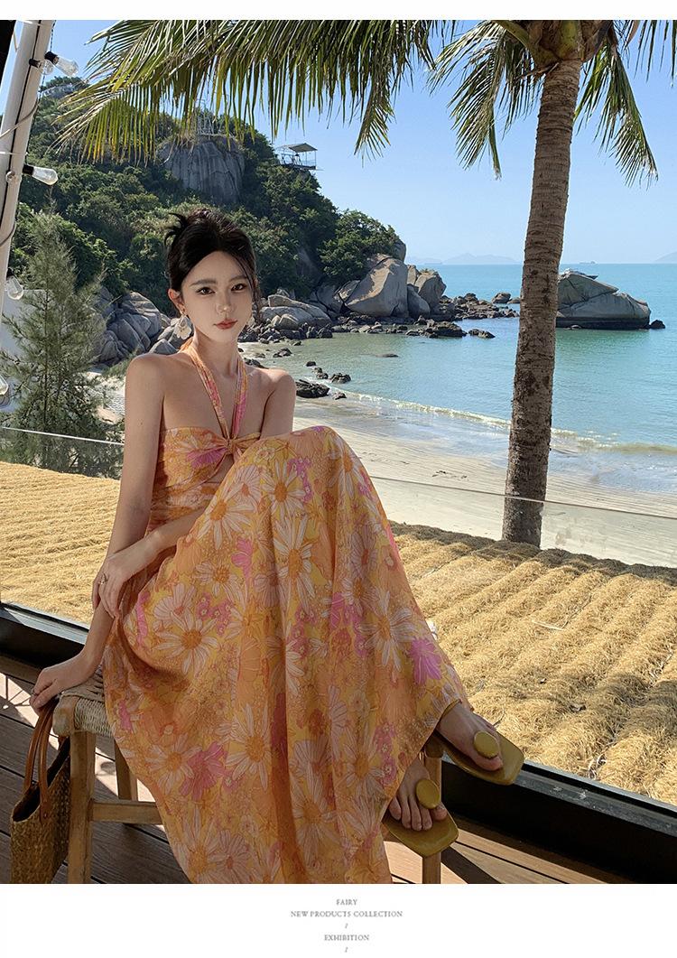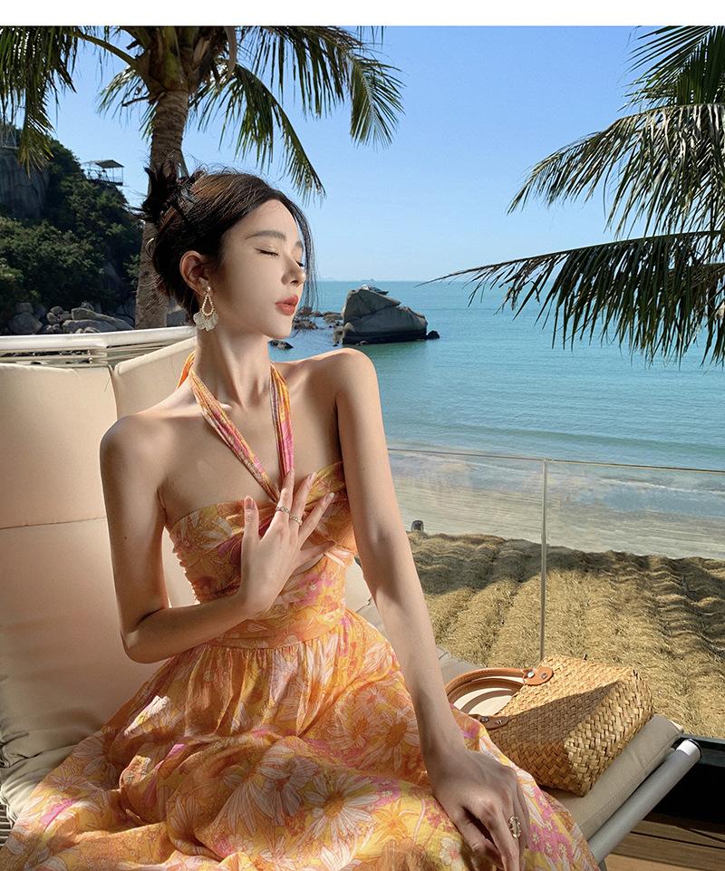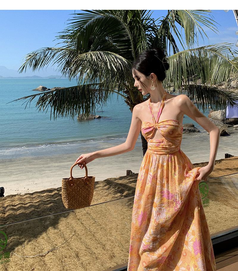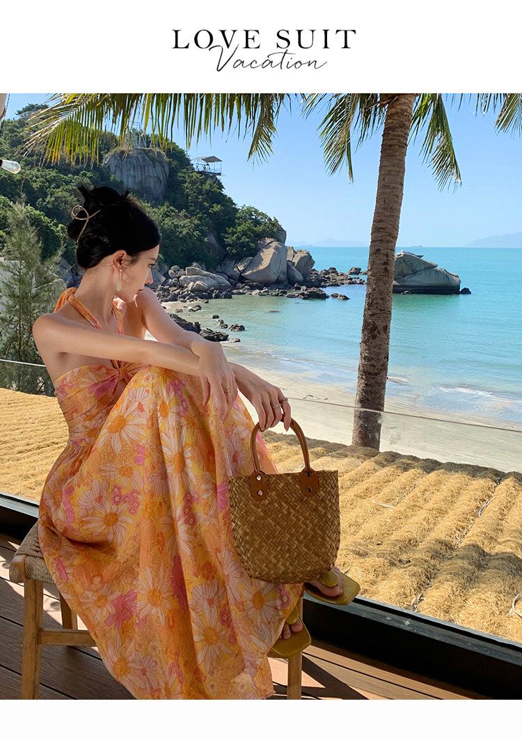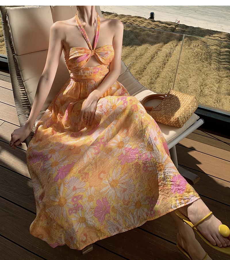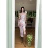 Foto real vestido de tirantes sin espalda para vacaciones en la playa vestido de gasa estampada adelgazante