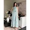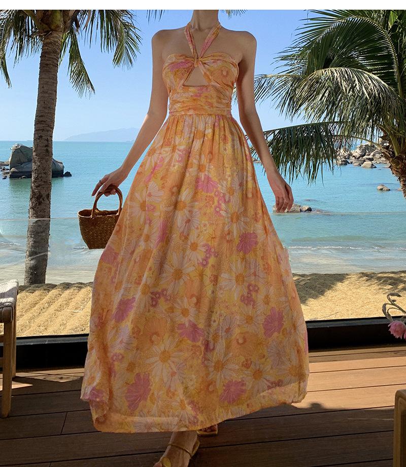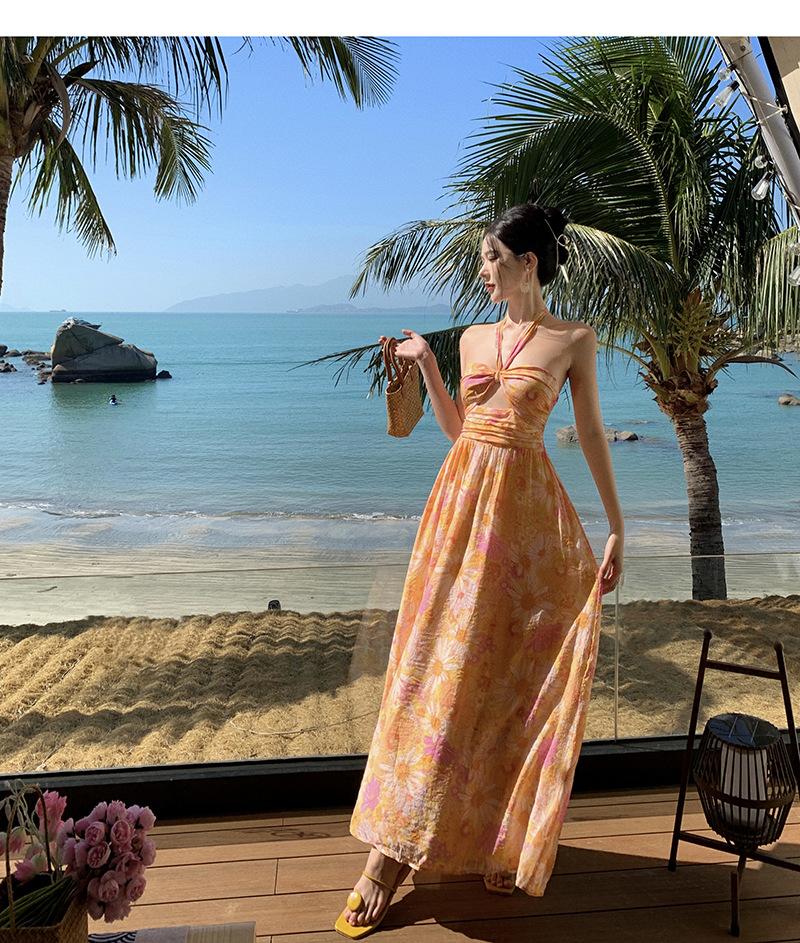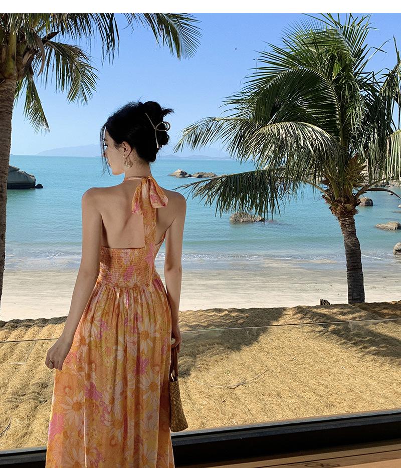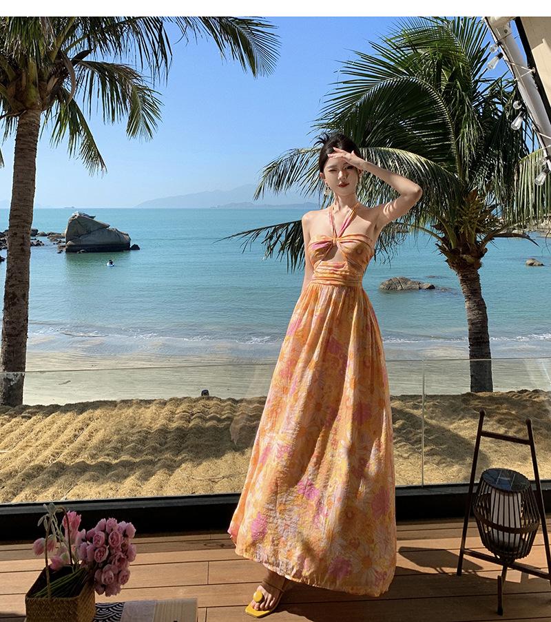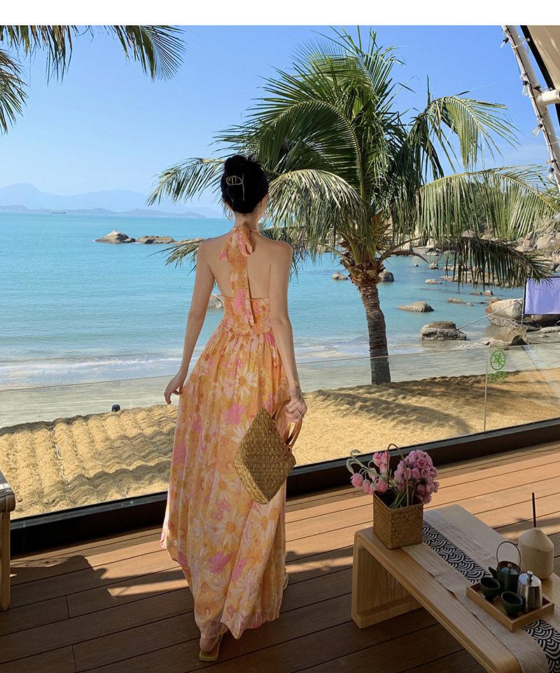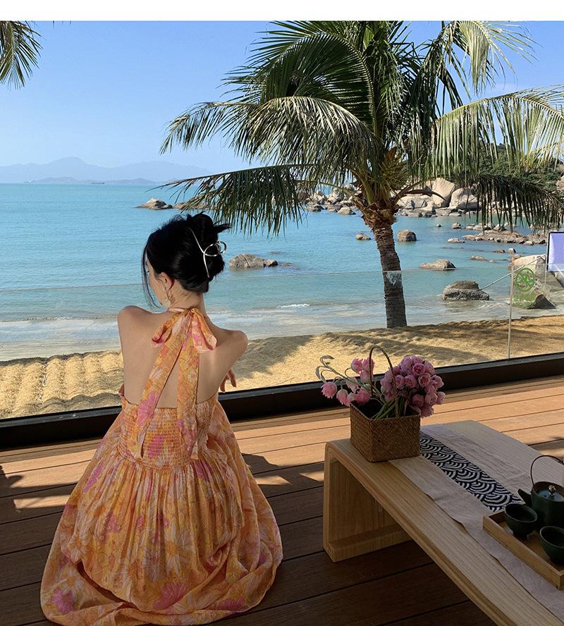 Foto real vestido de tirantes sin espalda para vacaciones en la playa vestido de gasa estampada adelgazante