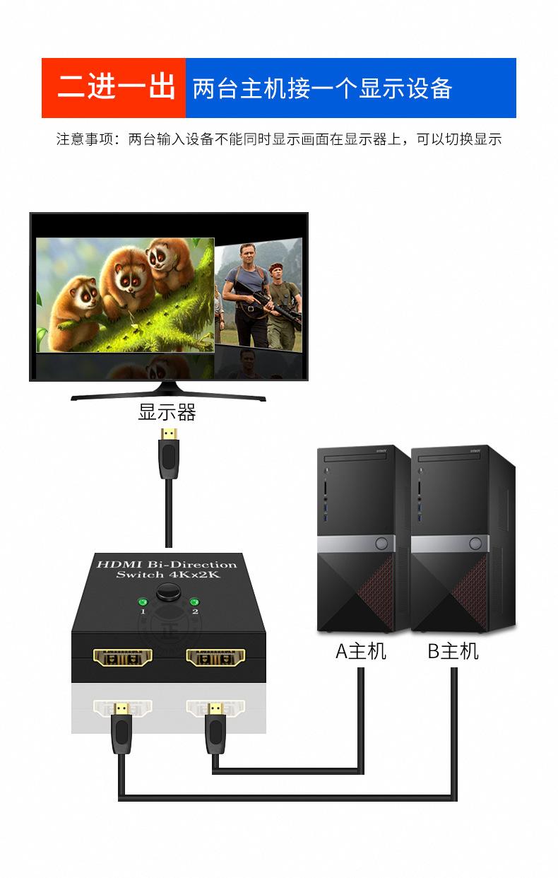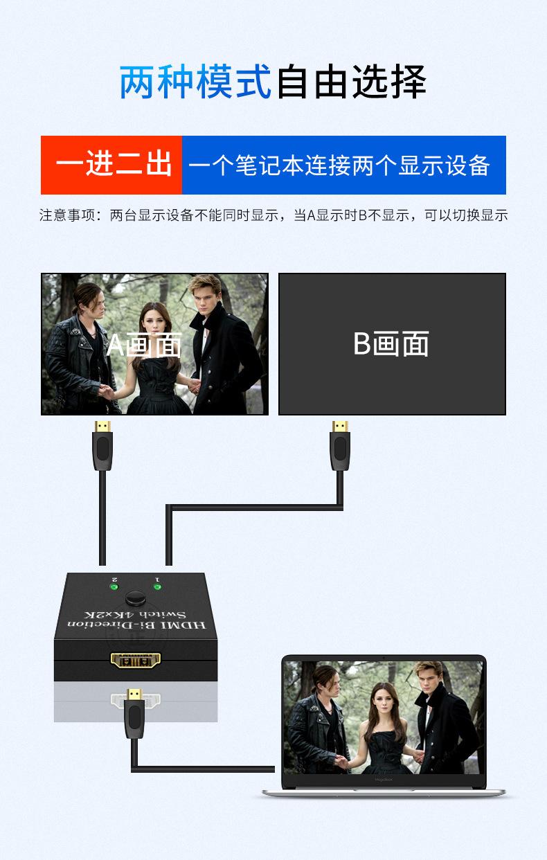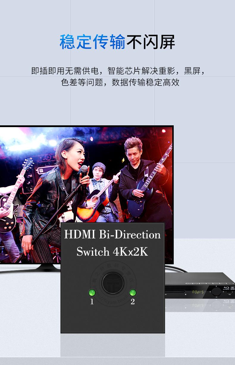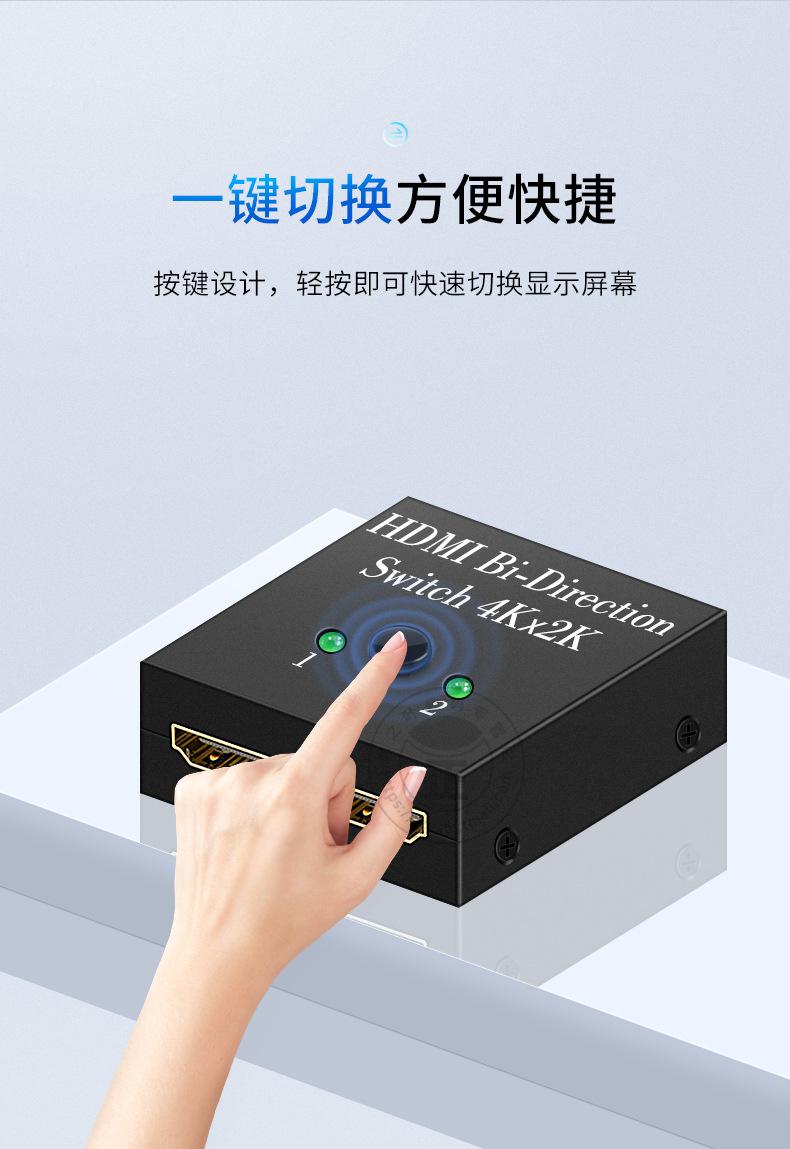Switcher bidireccional de video de alta definición HDMI, no requiere fuente de alimentación, carcasa metálica, plug and play, conmutación de una tecla, calidad de imagen 4K ultra alta definiciónDivisor de pantalla
