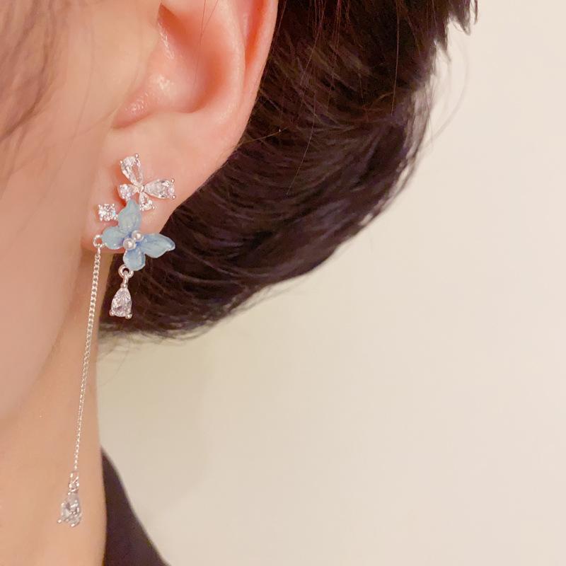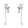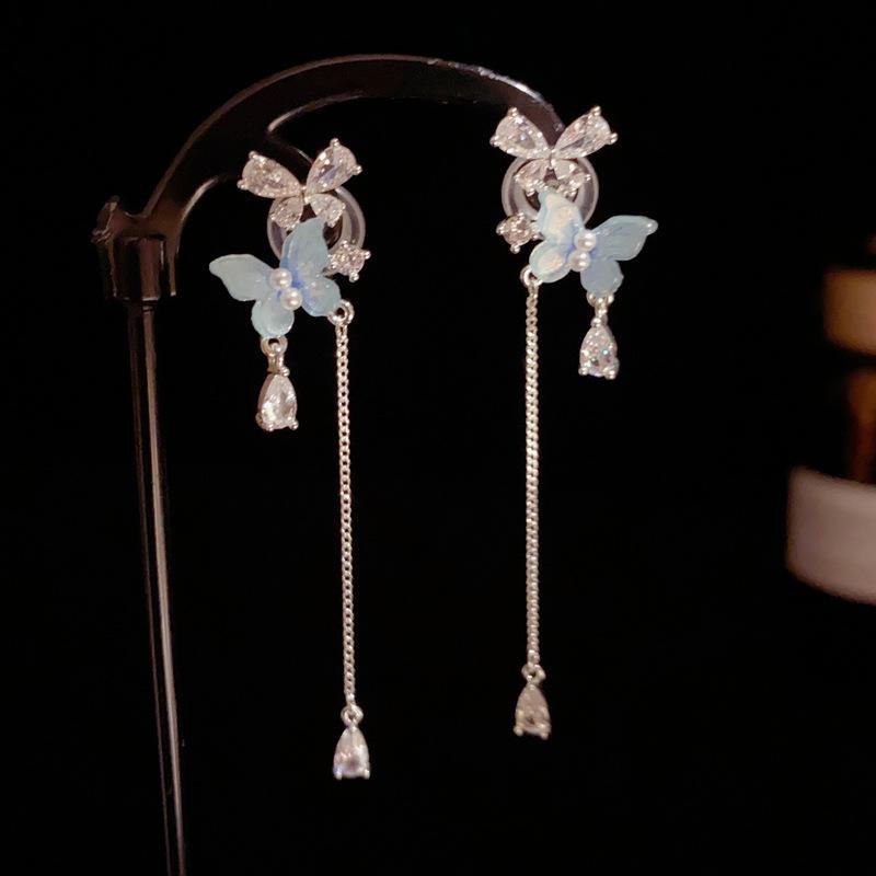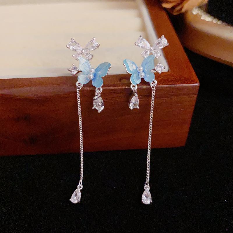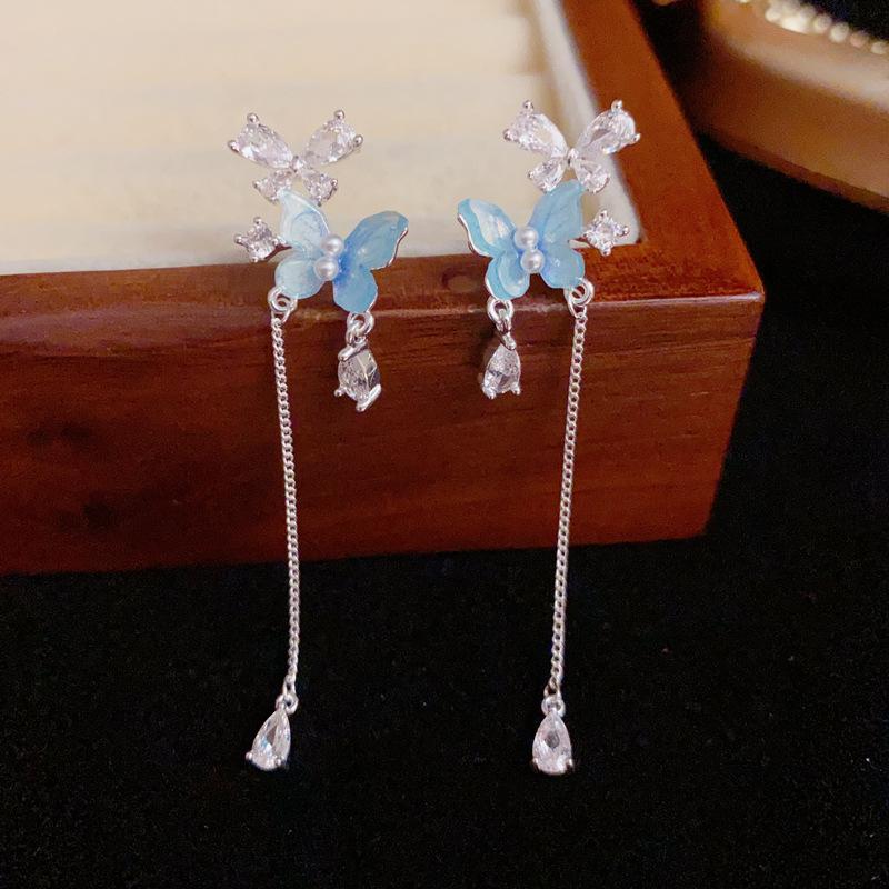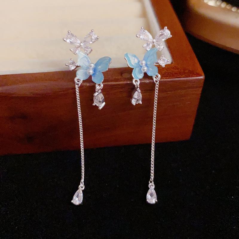 Pendientes de Borla Larga de Mariposa Azul Dulce Versátil de Moda de Aguja de Plata S925 Pendientes de Diseño Fresco de Lujo Ligero