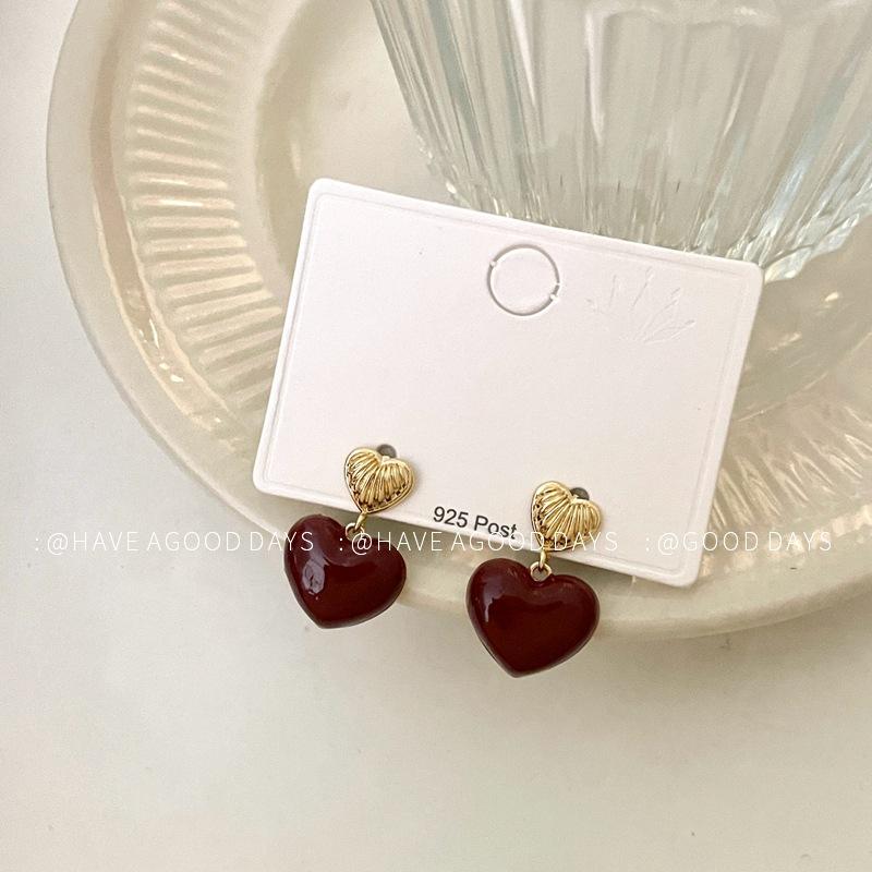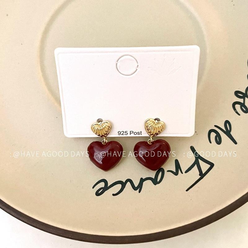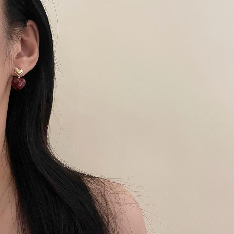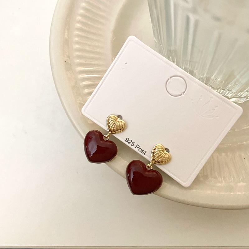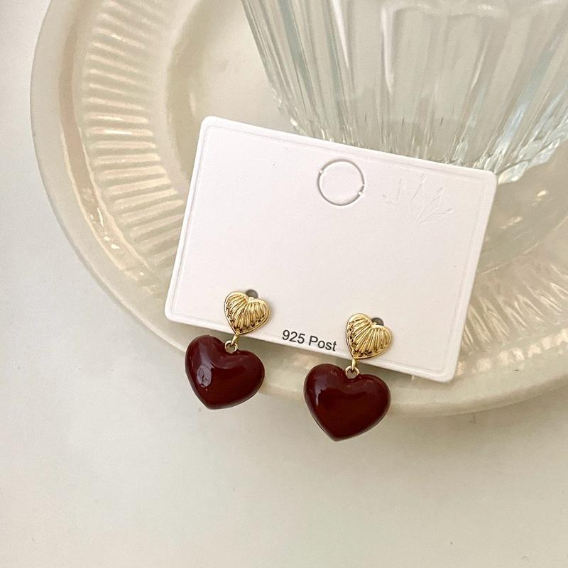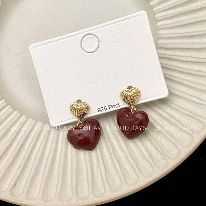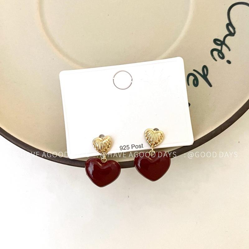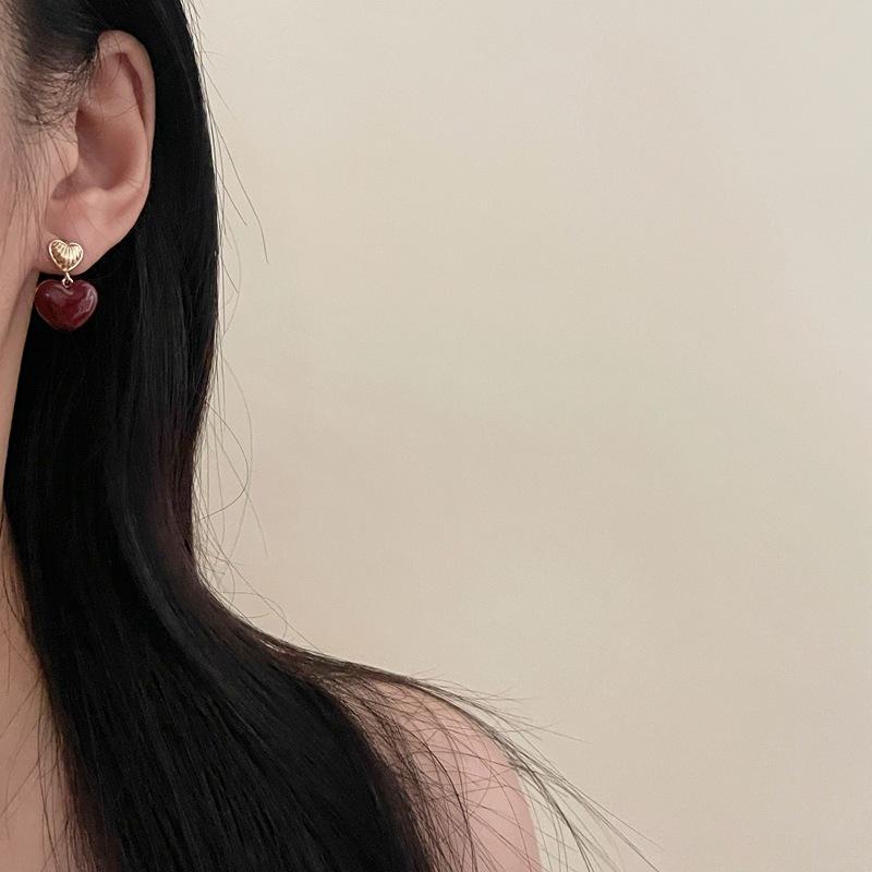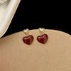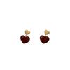 Aretes de Personalidad de Diseño Nicho de Lujo Ligero Estilo Francés Dulces Cool Rojo Vino con Colgante de Corazón Aretes de Botón de Alta Gama