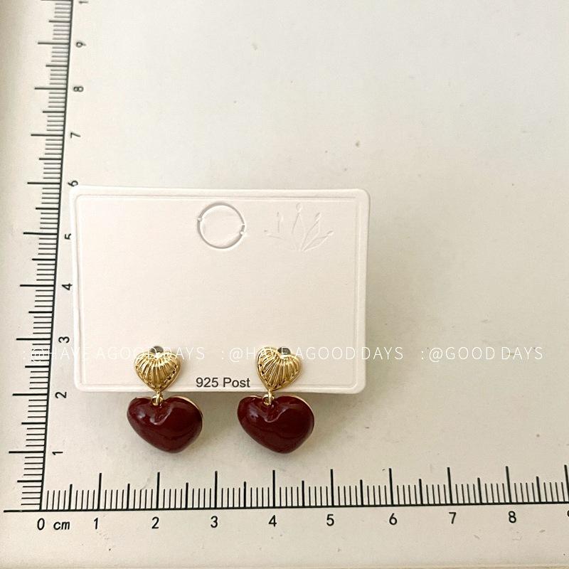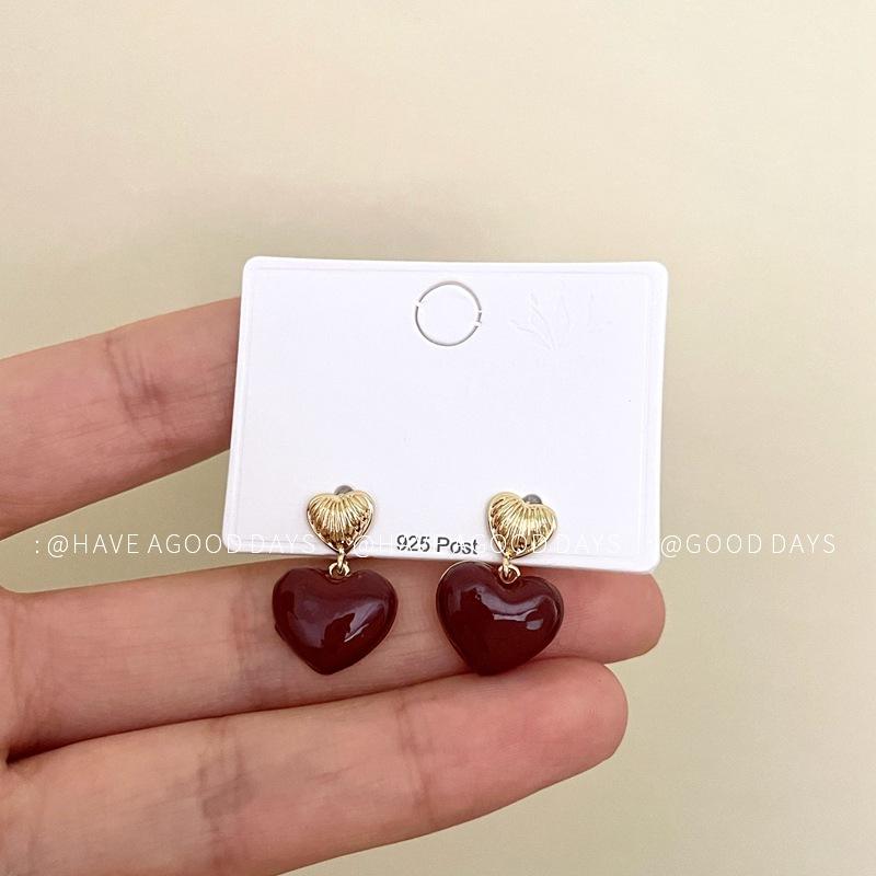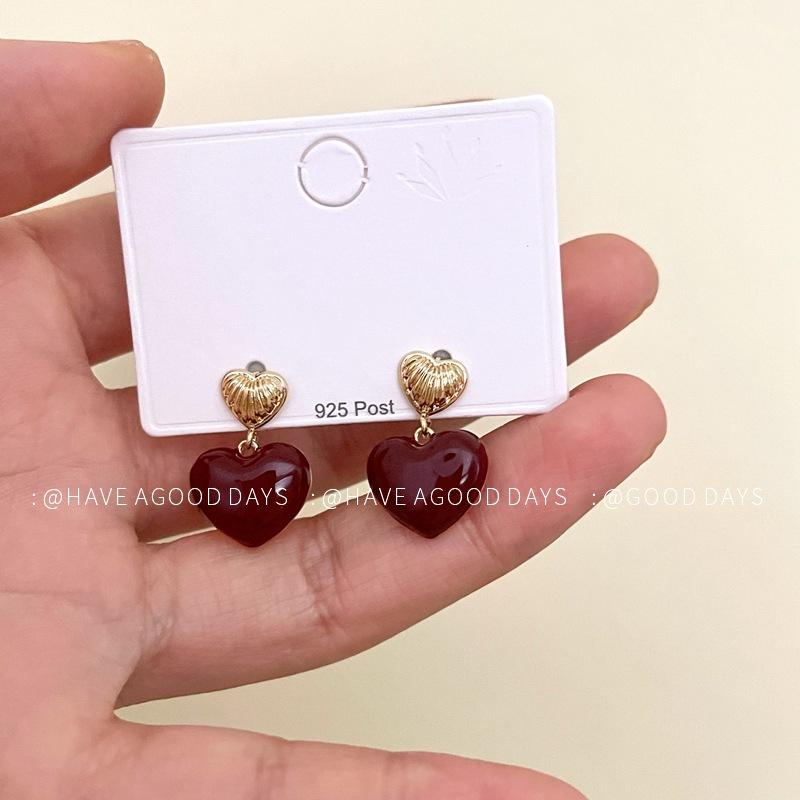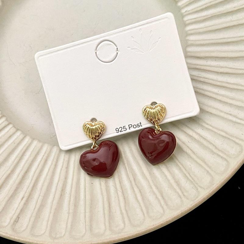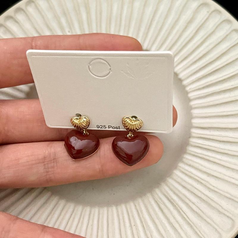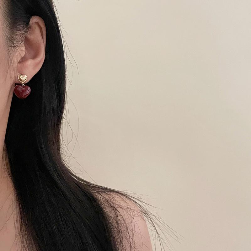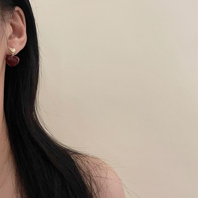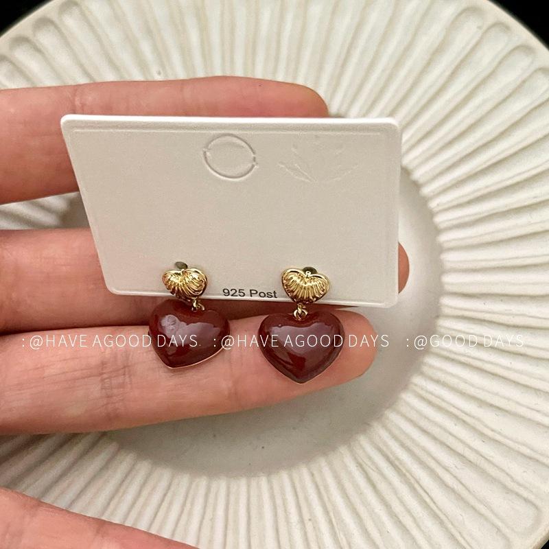Aretes de Personalidad de Diseño Nicho de Lujo Ligero Estilo Francés Dulces Cool Rojo Vino con Colgante de Corazón Aretes de Botón de Alta Gama