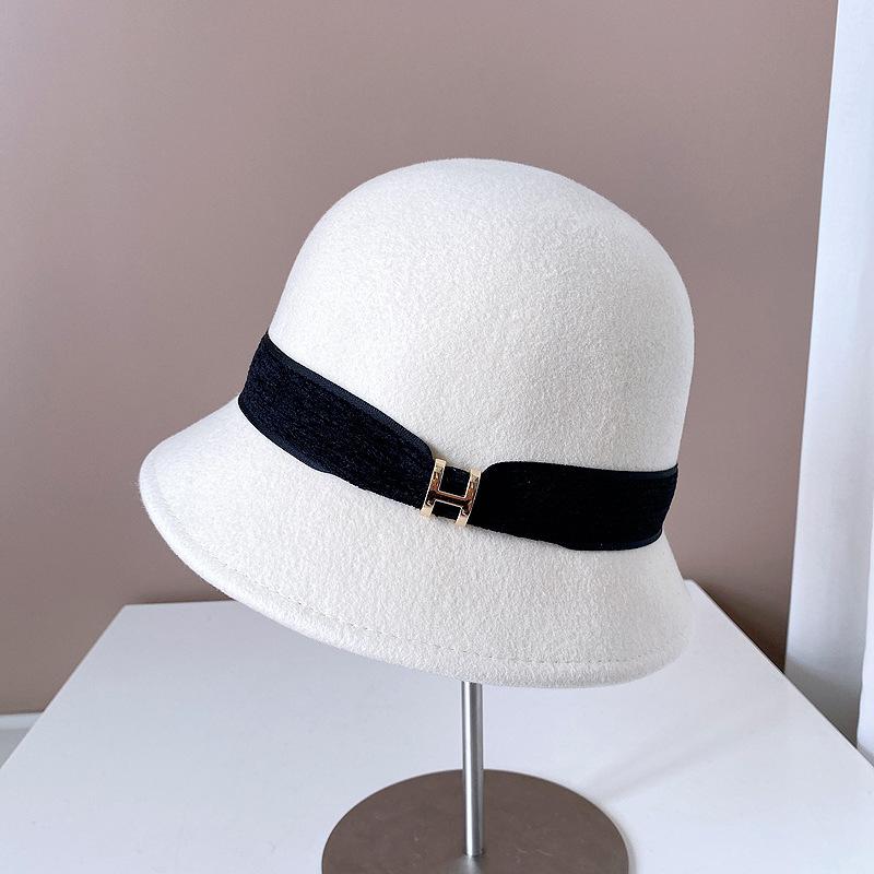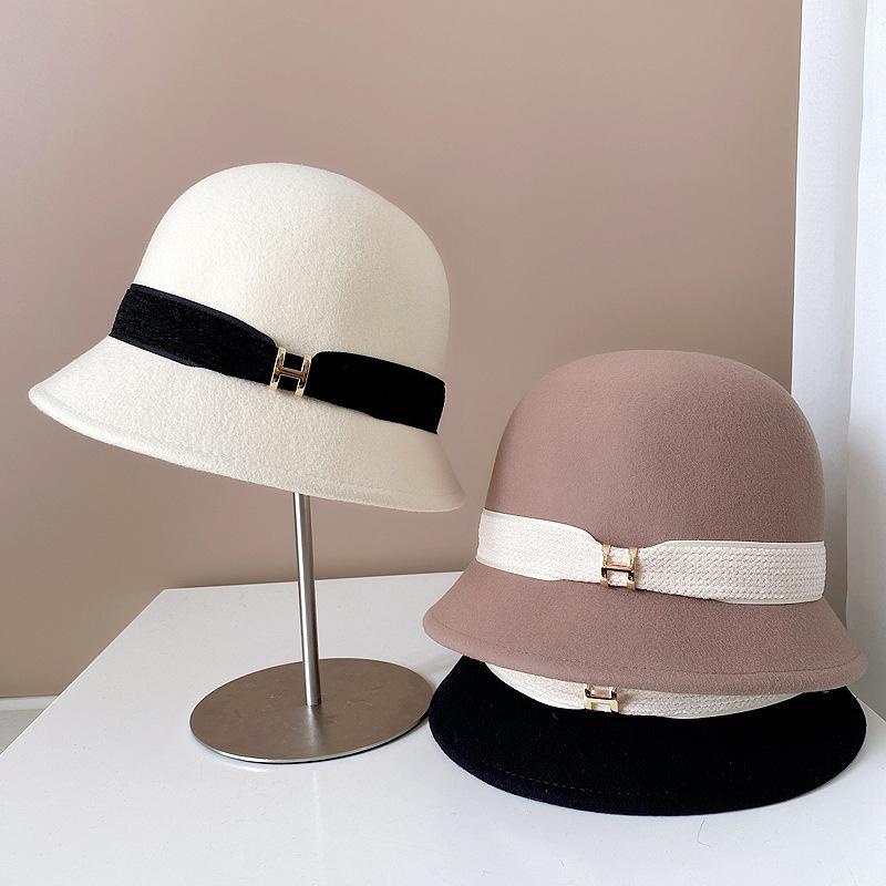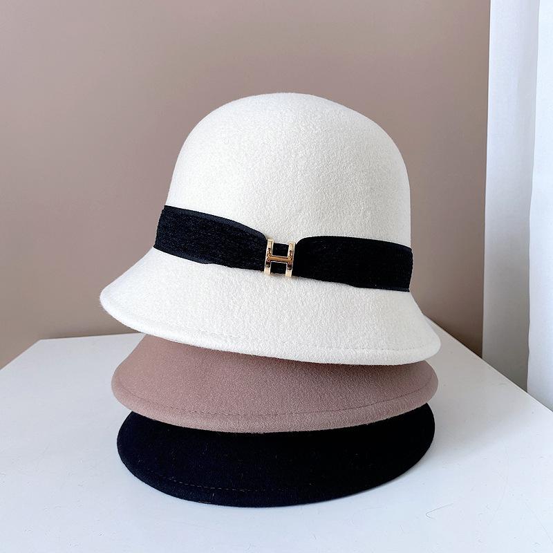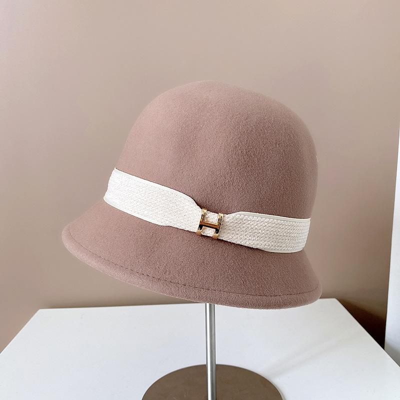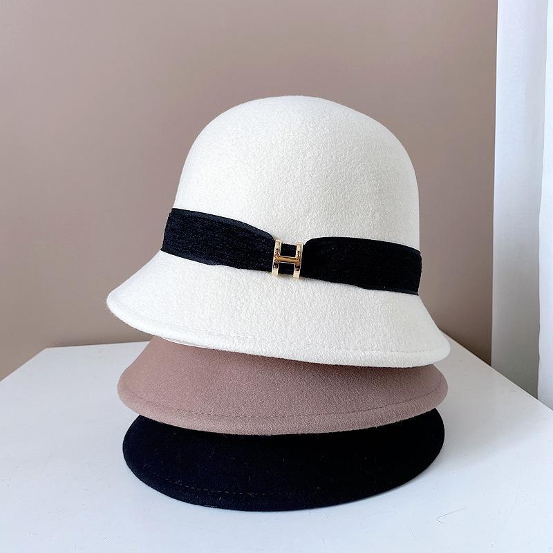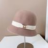 Moda japonesa Sombrero de pescador de lana con cinta y hebilla H para mujer invierno ala pequeña versátil moda sombrero de cubo elegante sombrero de fieltro