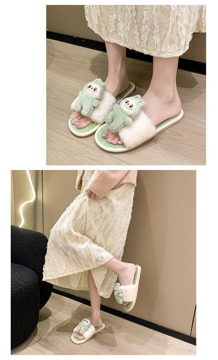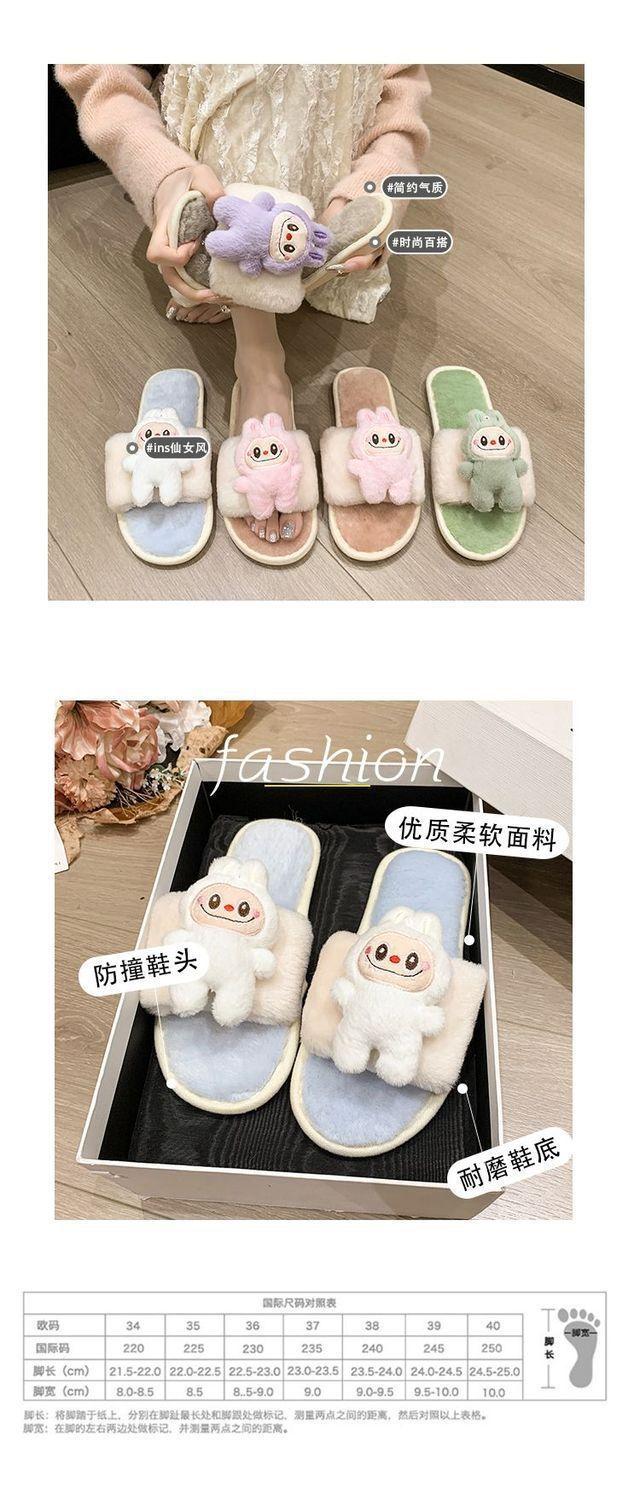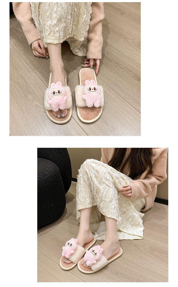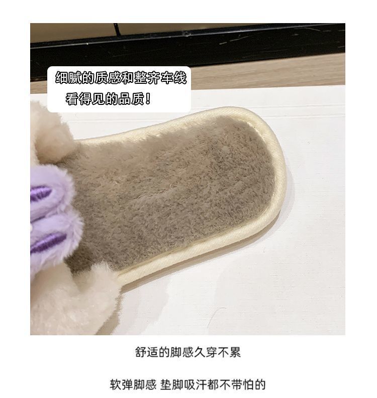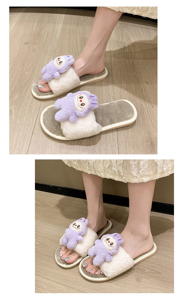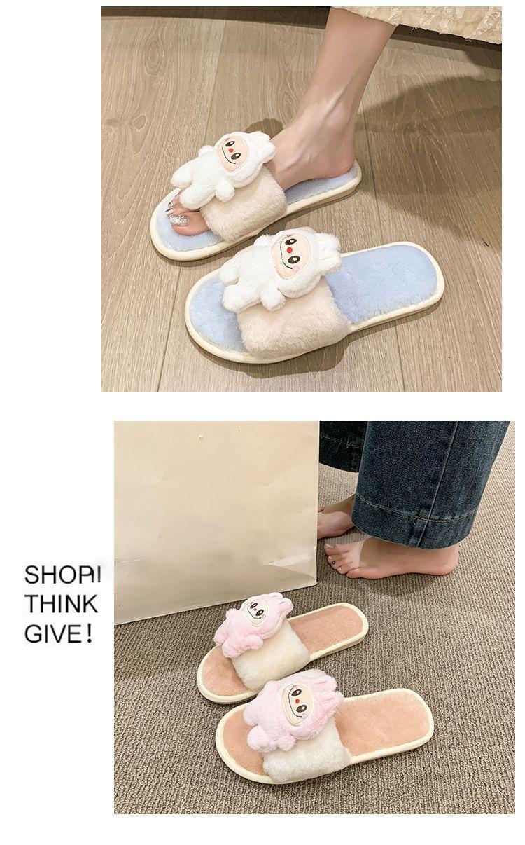 Pantuflas planas antideslizantes cálidas de algodón con una tira, estilo popular de celebridad de internet, pantuflas peludas lindas de dibujos animados para mujer, nuevo otoño/invierno 2025