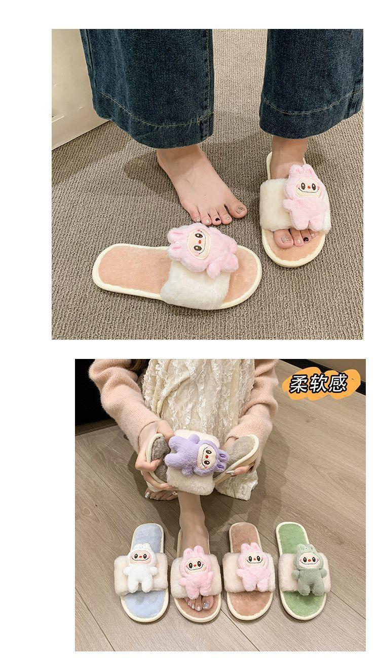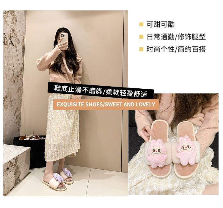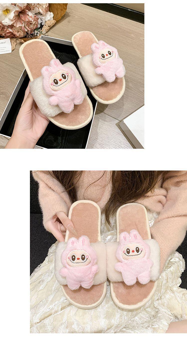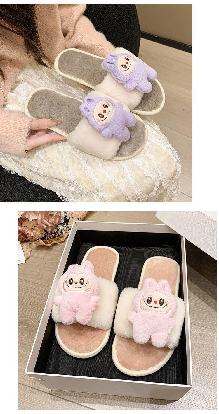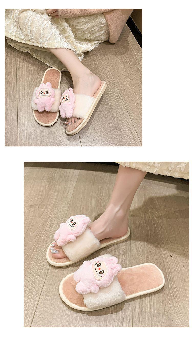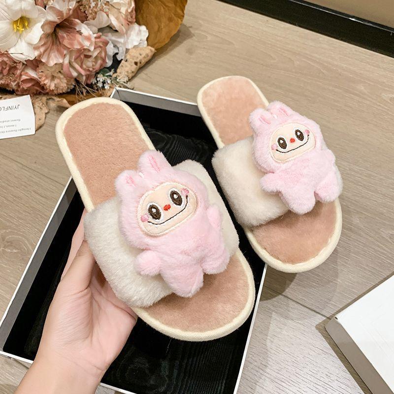 Pantuflas planas antideslizantes cálidas de algodón con una tira, estilo popular de celebridad de internet, pantuflas peludas lindas de dibujos animados para mujer, nuevo otoño/invierno 2025
