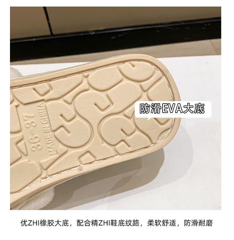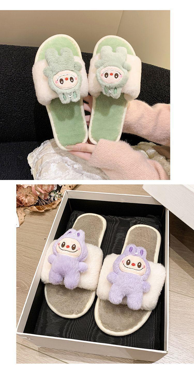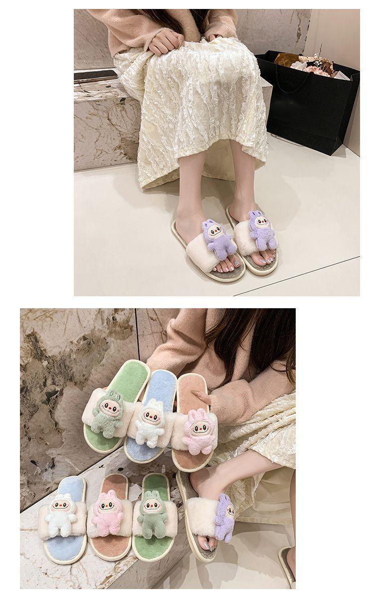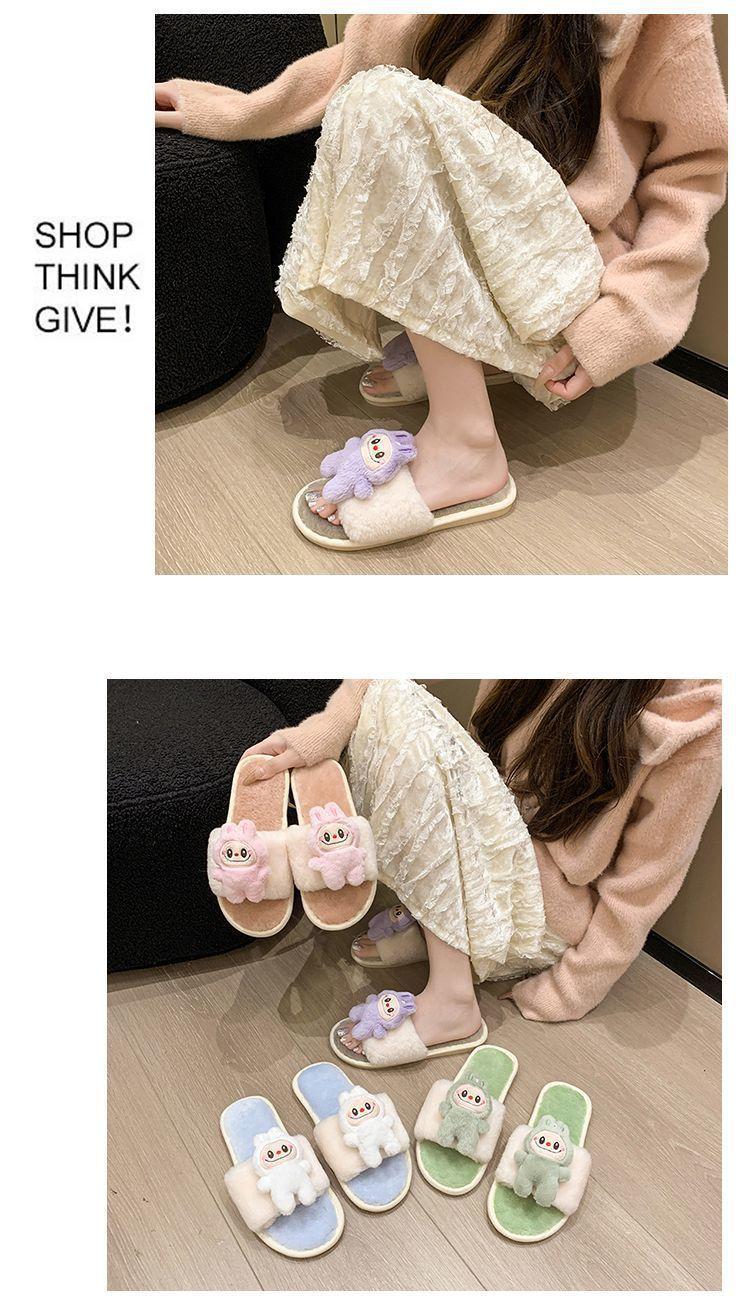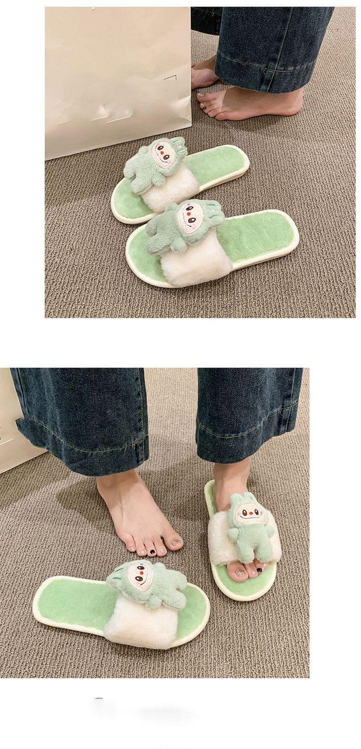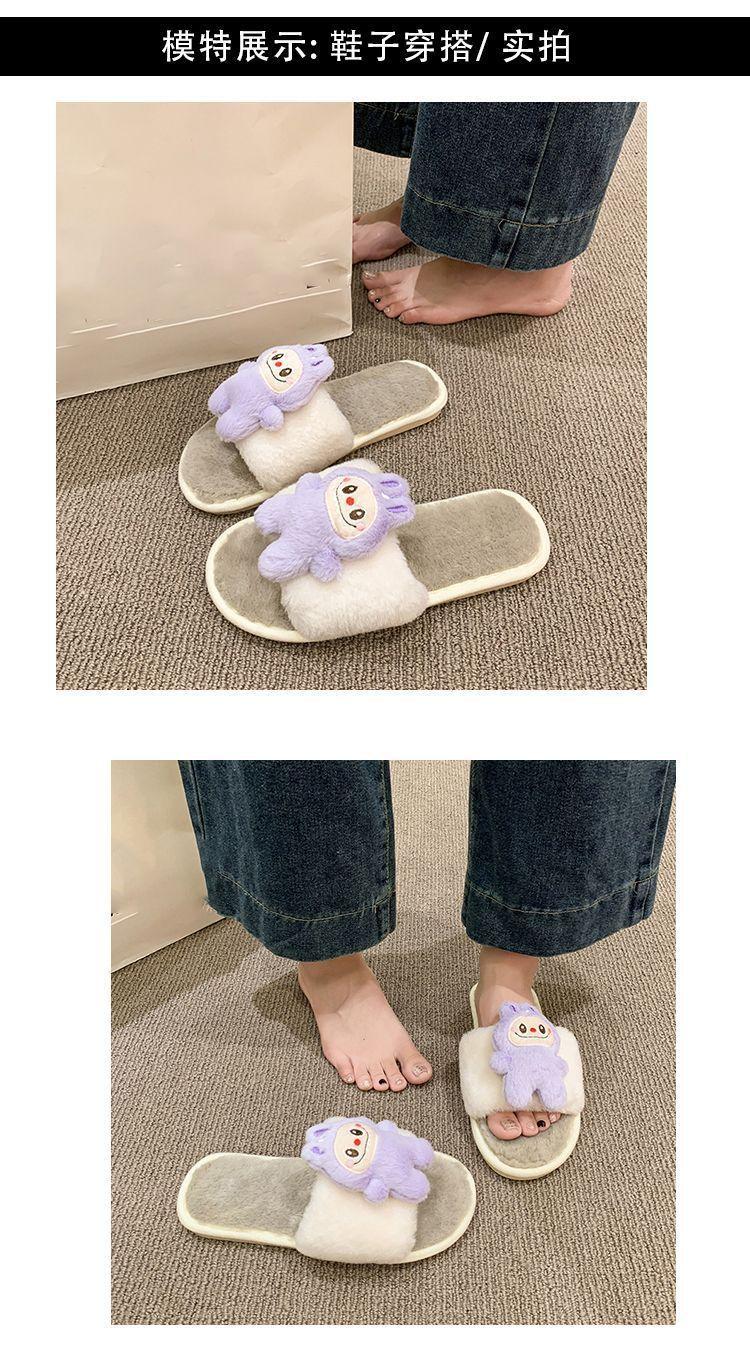 Pantuflas planas antideslizantes cálidas de algodón con una tira, estilo popular de celebridad de internet, pantuflas peludas lindas de dibujos animados para mujer, nuevo otoño/invierno 2025